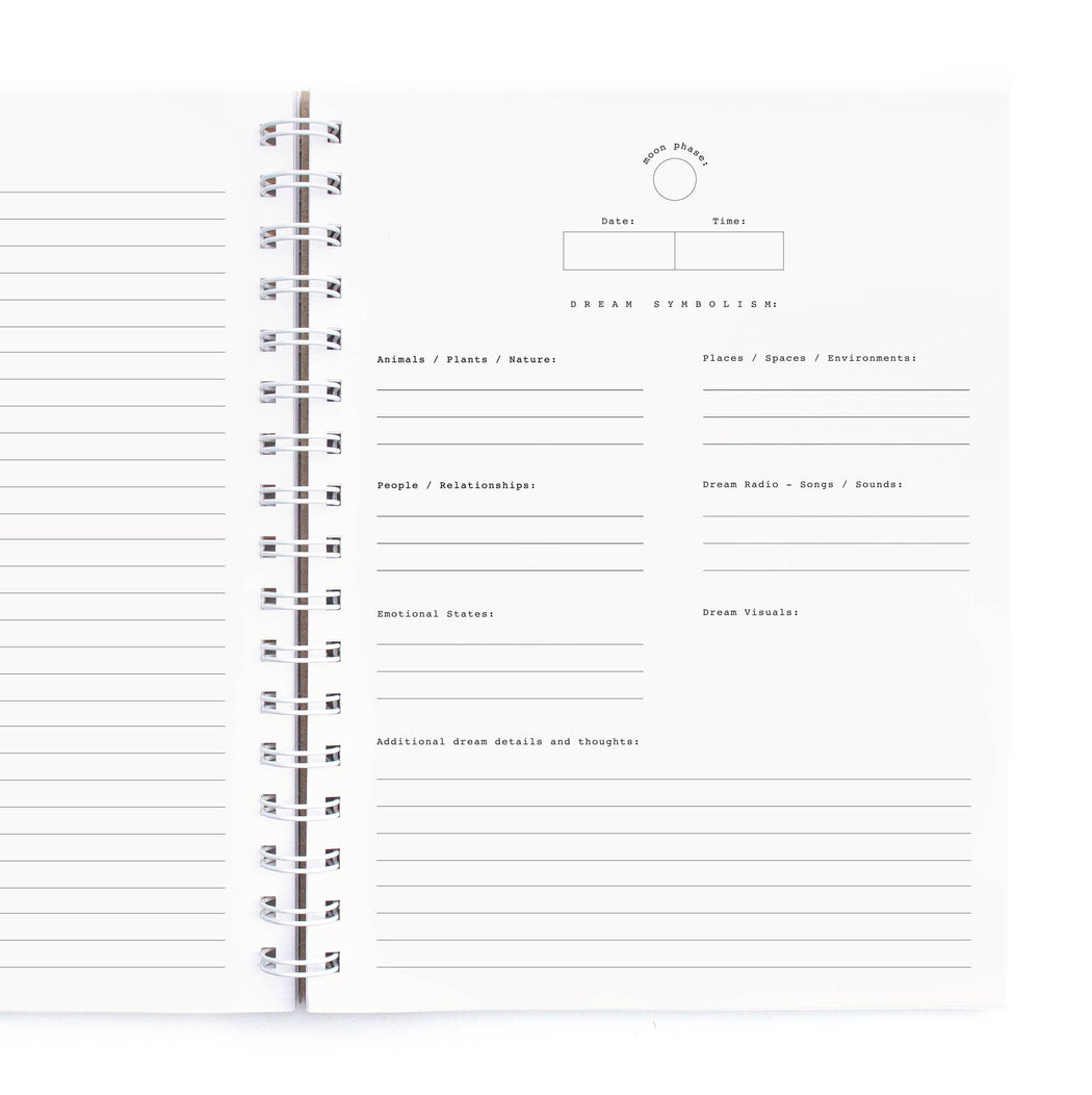 It includes seventy-five pages with simple daily prompts for dream recollection, with lines on the back of each page for for additional descriptions and reflections.