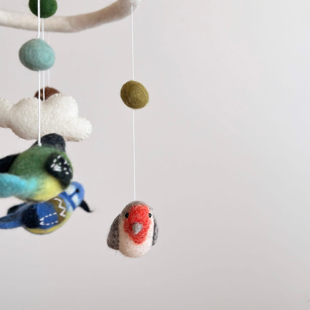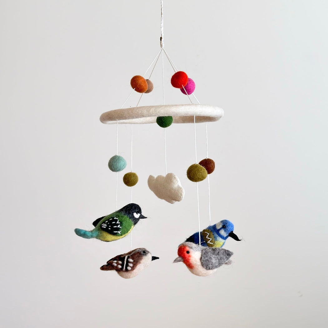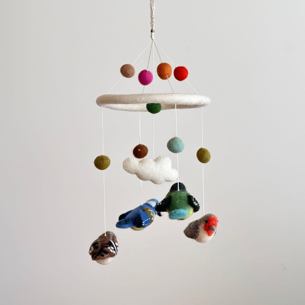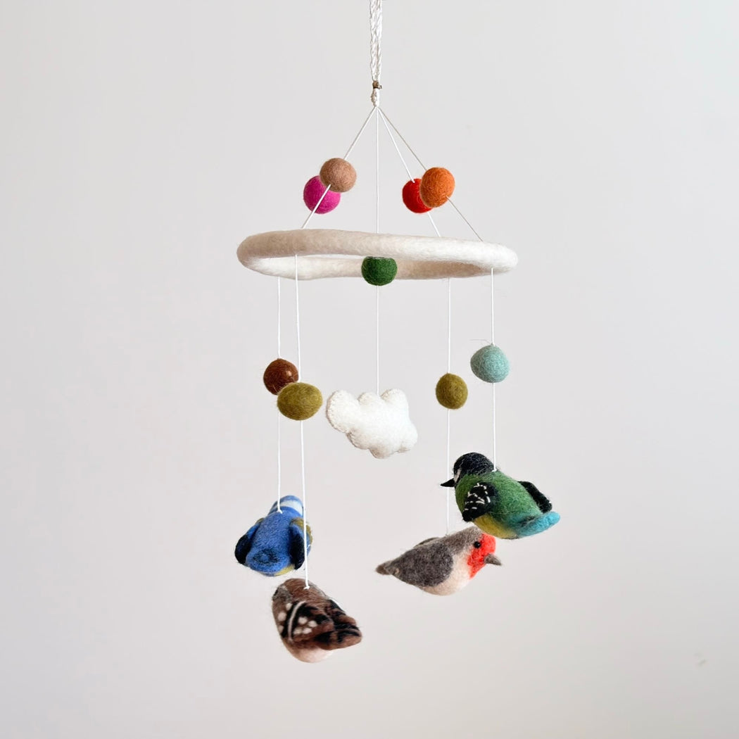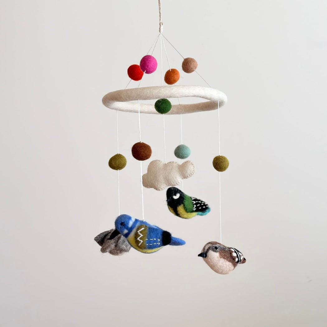 Add a touch of magic to the nursery (or any room!) with this beautiful wool-felt bird mobile. Handcrafted with natural wool fibers and eco-friendly dyes and suspended from a felt hoop for gentle movement.