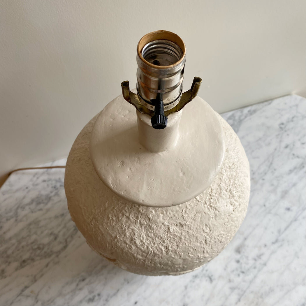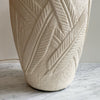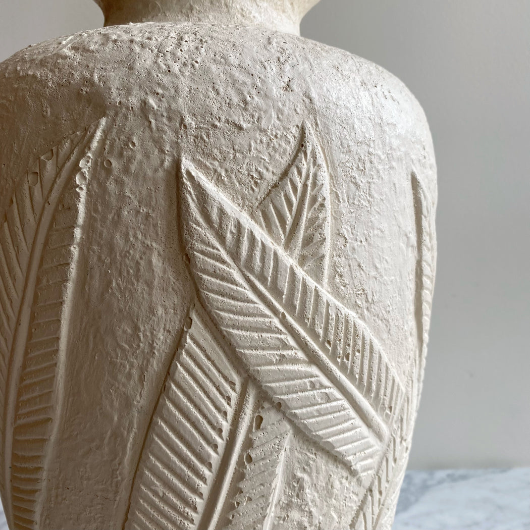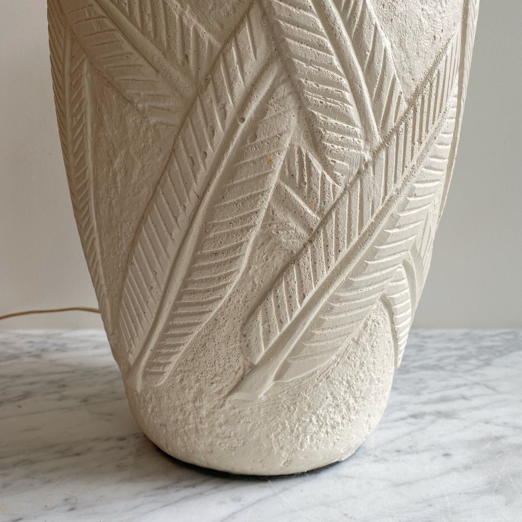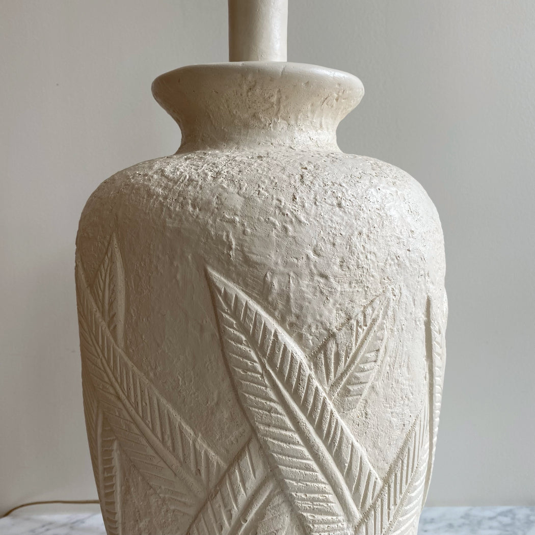Stunning vintage plaster table lamp featuring a beautiful palm leaf design all around it. Although it has a great 80's Hollywood Regency style, it works in many different interior styles and designs. We love the texture of the plaster and leaf designs, as well as the neutral warm ivory color.