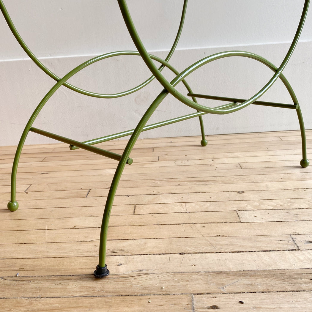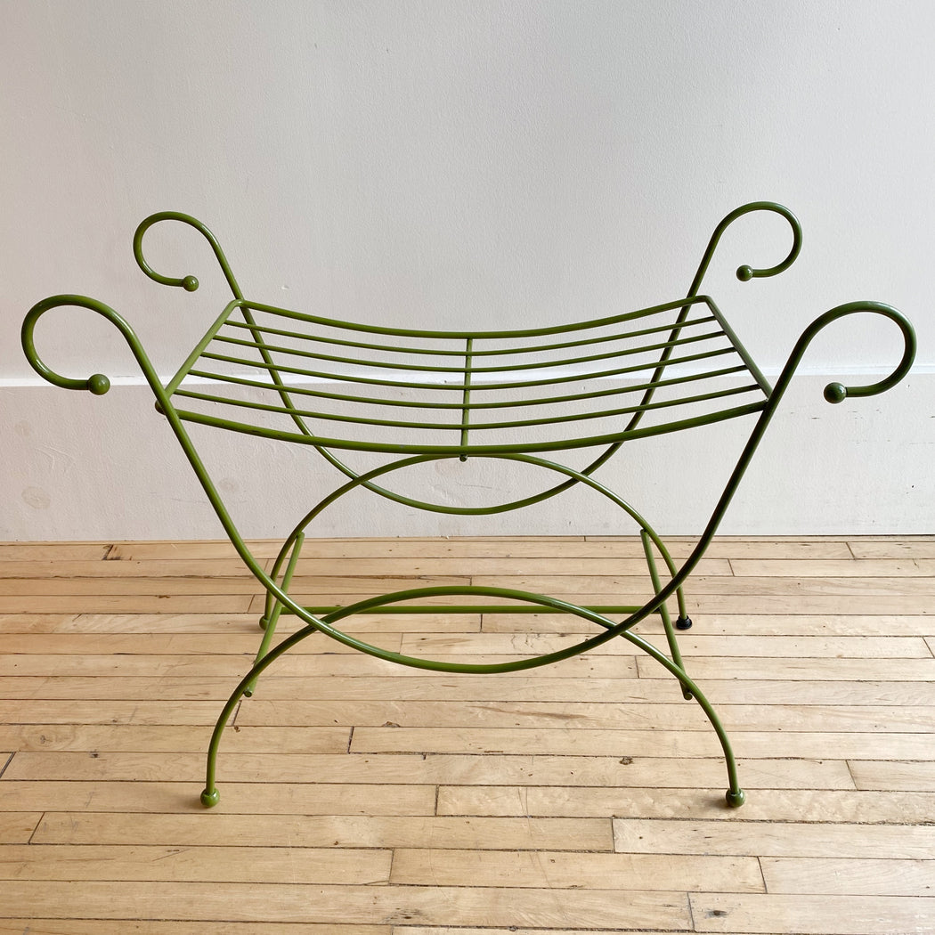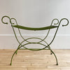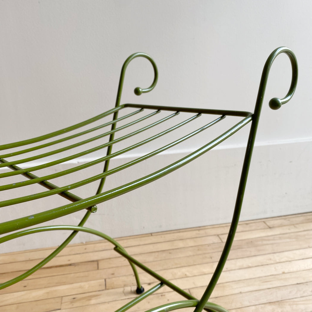 Beautiful vintage metal bench seat with soft scrolling lines and swoops, in a lovely green color. It can be used as additional seating as it is, or add a slim pillow or cushion for a little extra comfort.