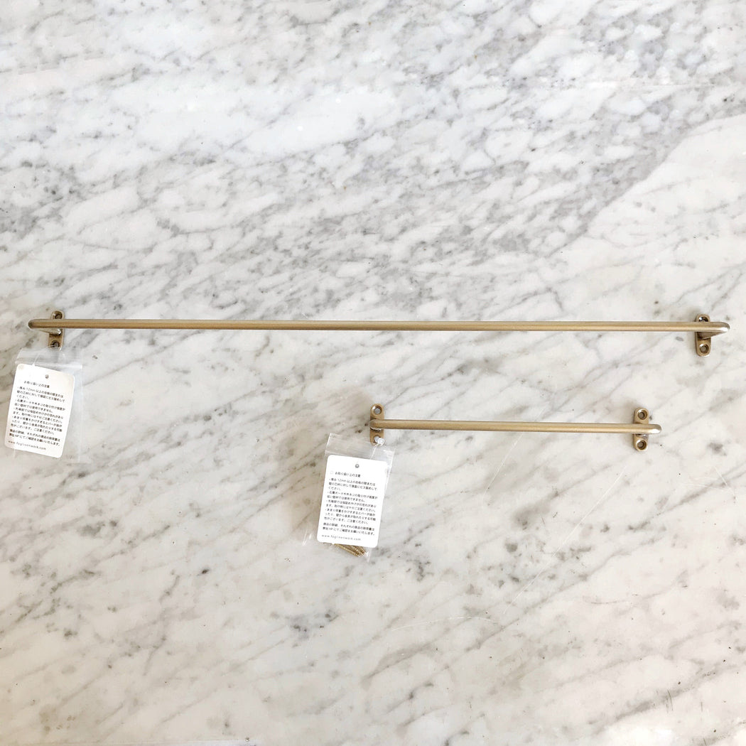 Simple, handmade towel bars in warm, antiqued brass. Irregularities in finish will occur. Useful in the kitchen, bathroom, or display. Each bar includes four matching screws.