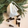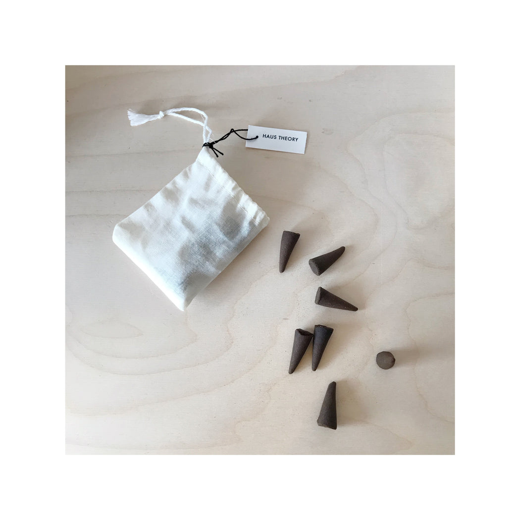 Each small cotton muslin drawstring bag is filled with 12 handmade incense cones - each with a burn time of about 30 minutes.