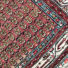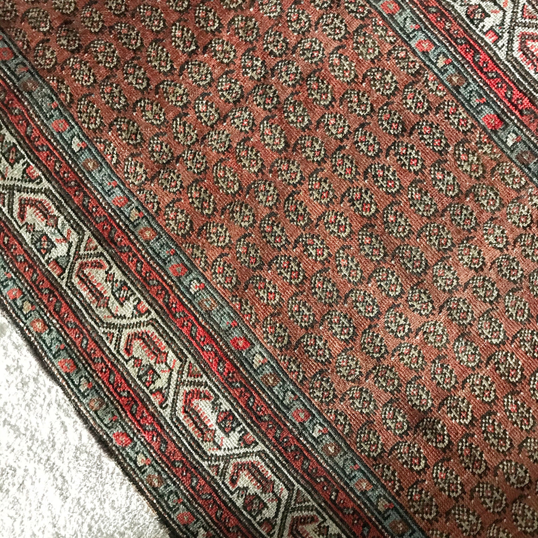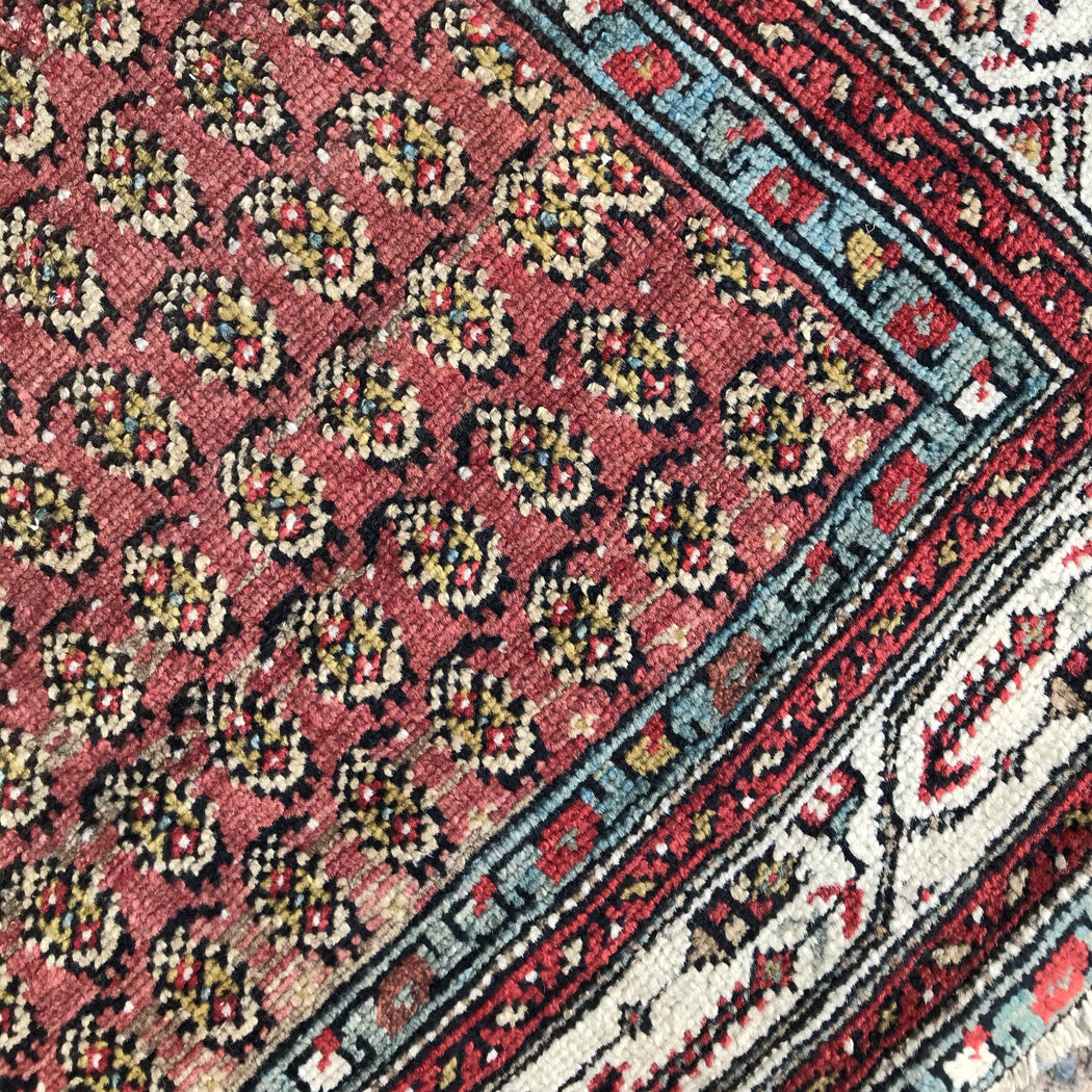 Absolutely gorgeous antique Persian runner rug. Hand-knotted, 100% wool, natural dyes. Allover repeating boteh design with layered border. Colors and tones include: ivory, warm powder blue, salmon, rust, raspberry, tan, brown.