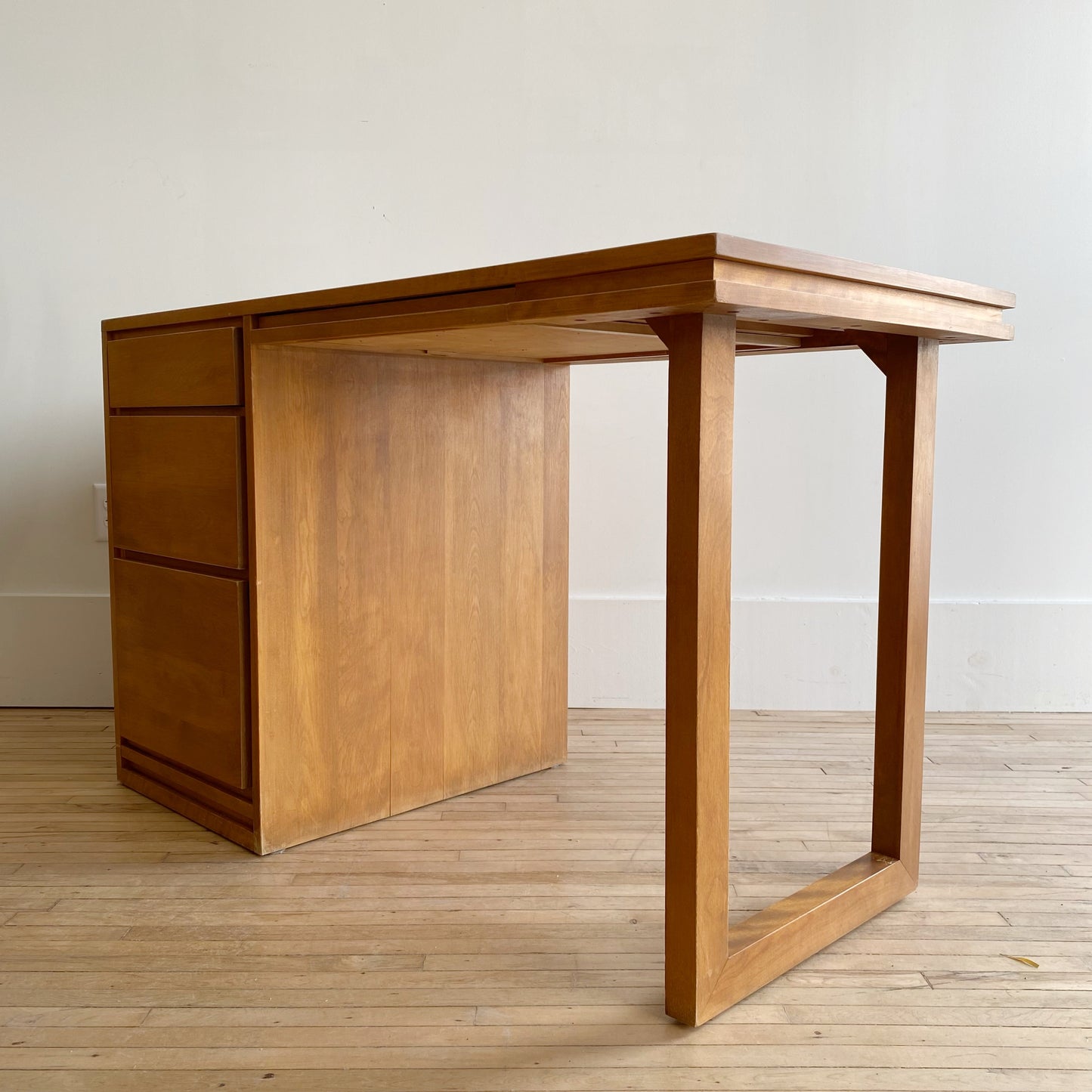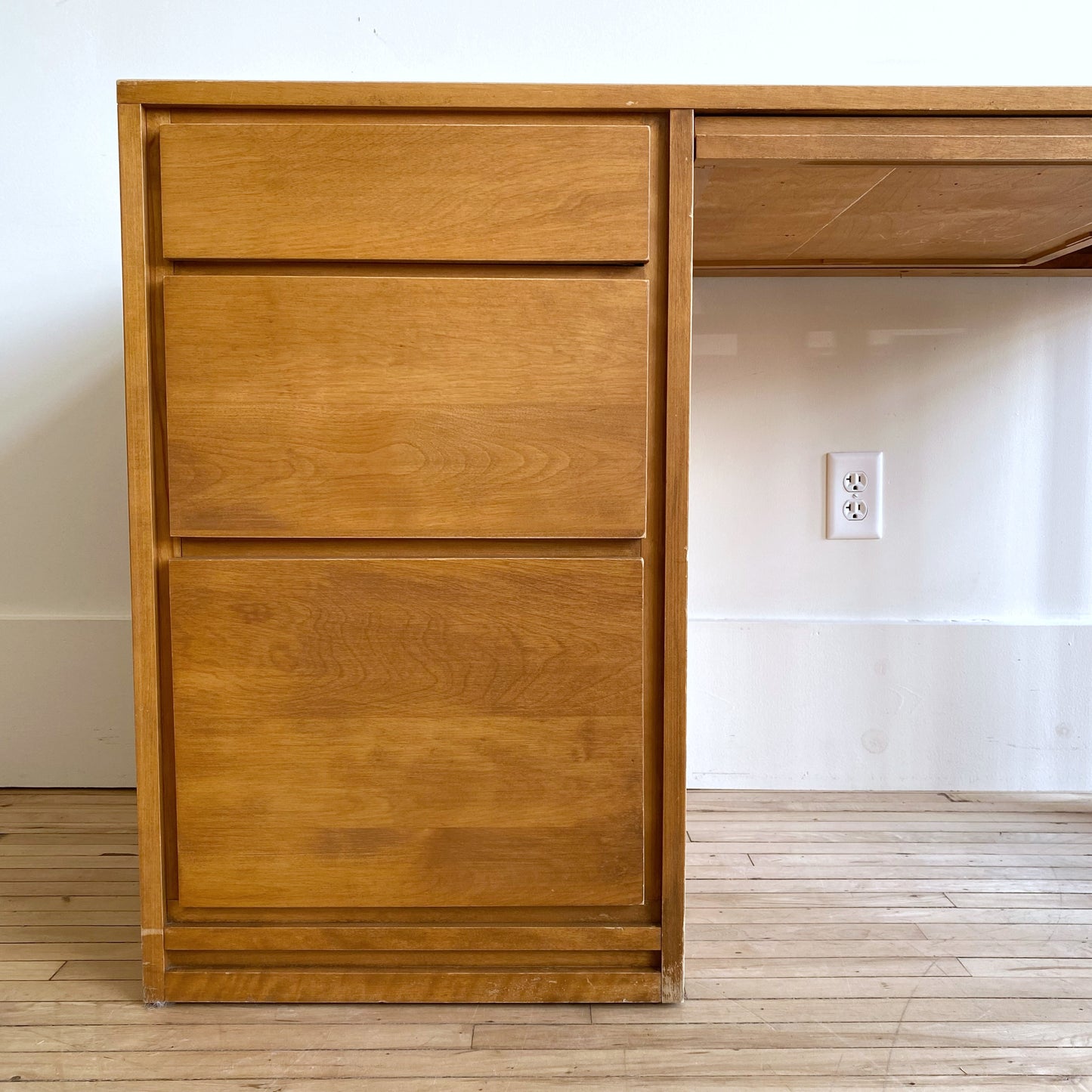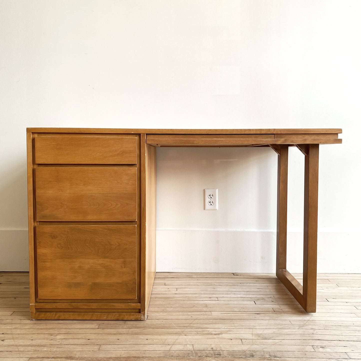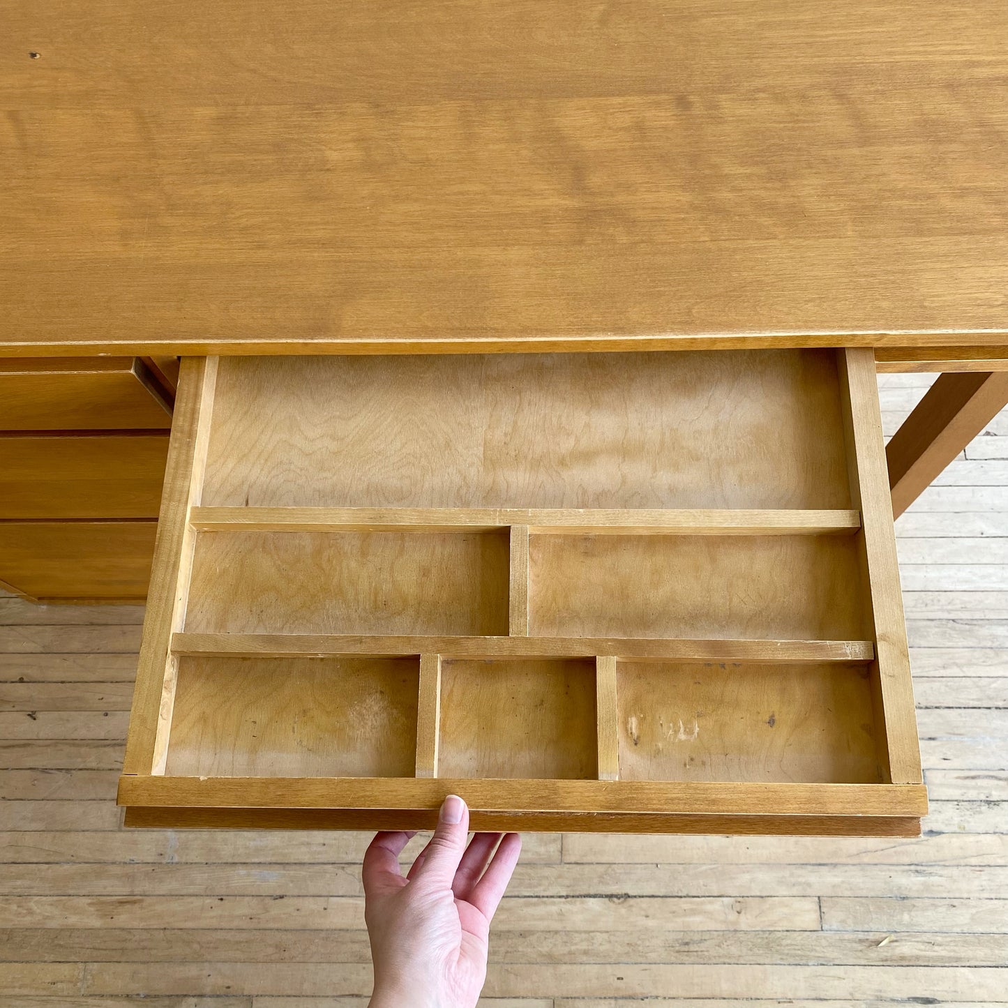 This is a beautiful vintage mid-century modern desk by Conant Ball. It features a column of three roomy drawers on the left, a slim compartmentalized pencil drawer, and open support side on the right. It is a great piece for an office or to use as a vanity.