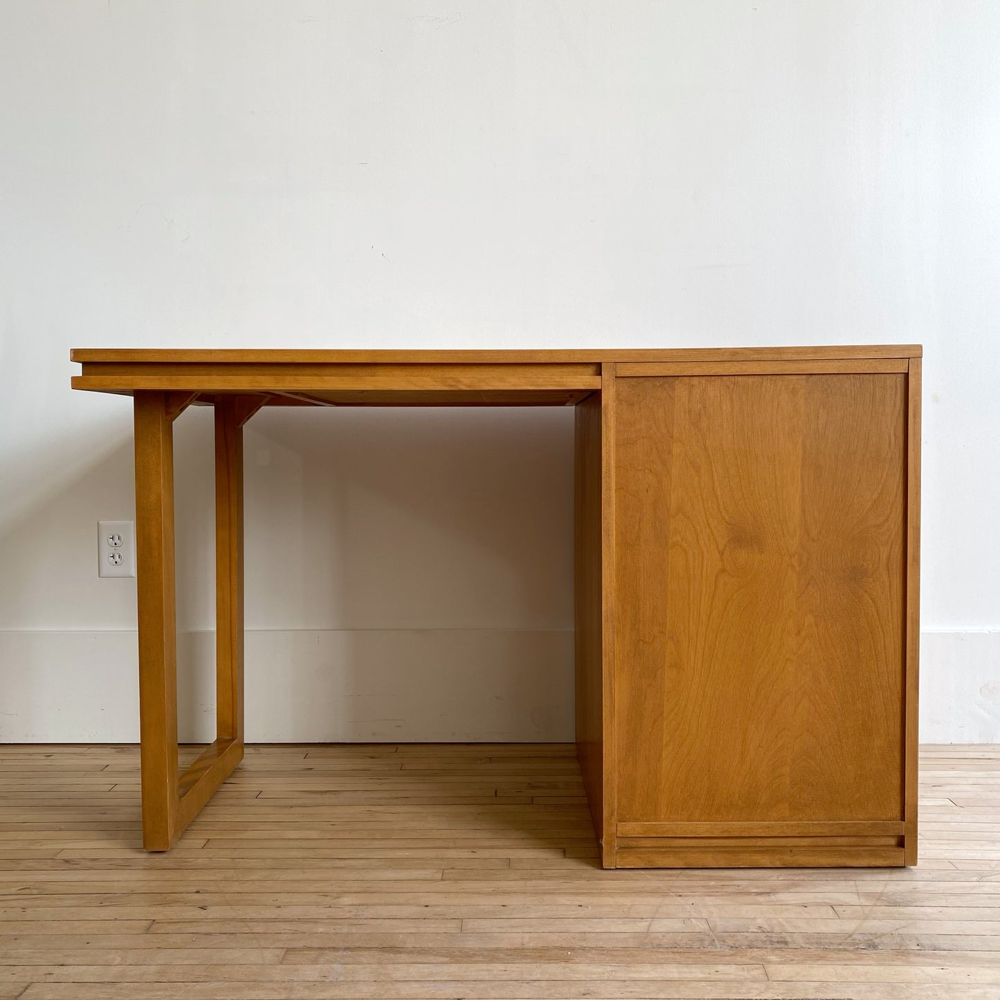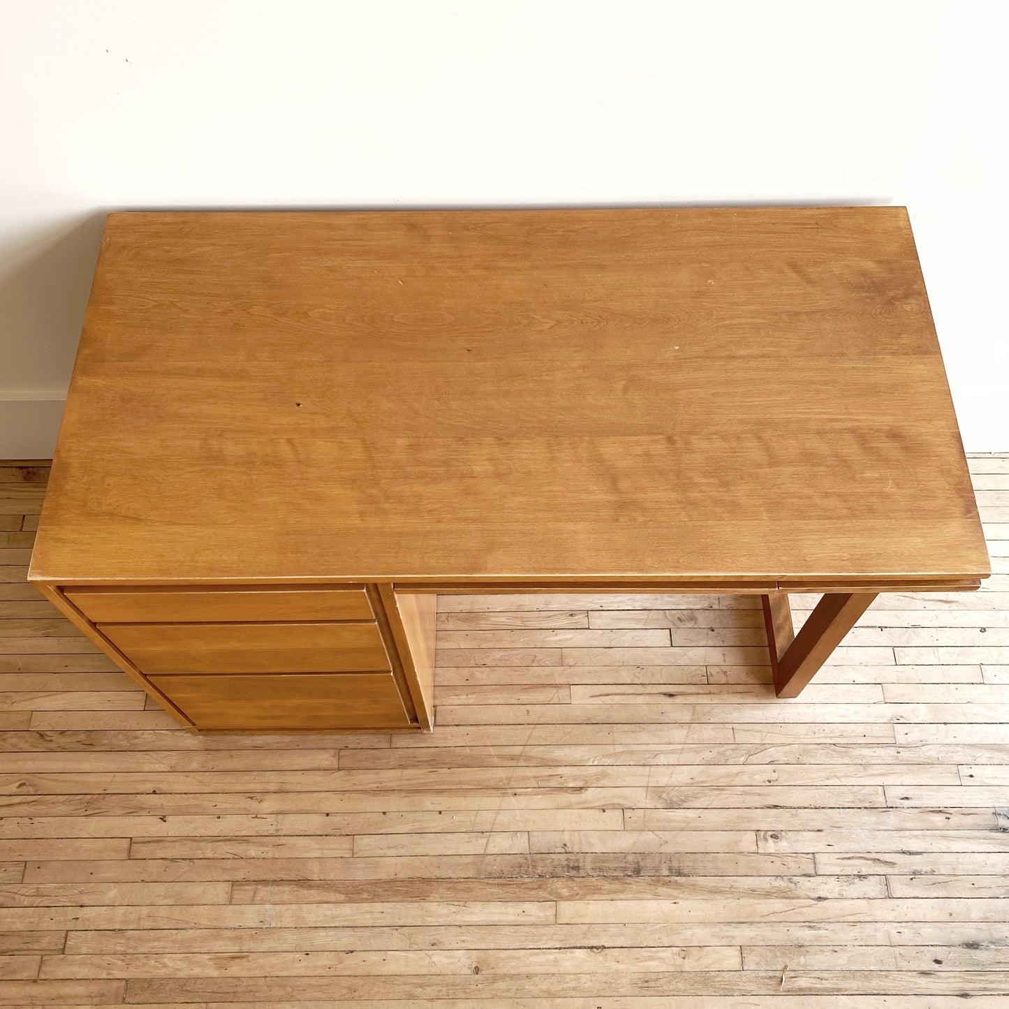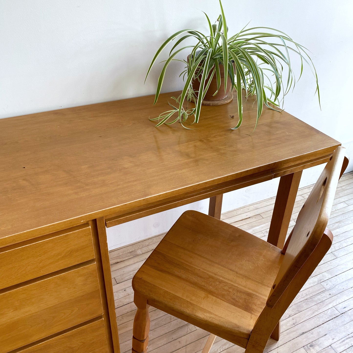 This is a beautiful vintage mid-century modern desk by Conant Ball. It features a column of three roomy drawers on the left, a slim compartmentalized pencil drawer, and open support side on the right. It is a great piece for an office or to use as a vanity.