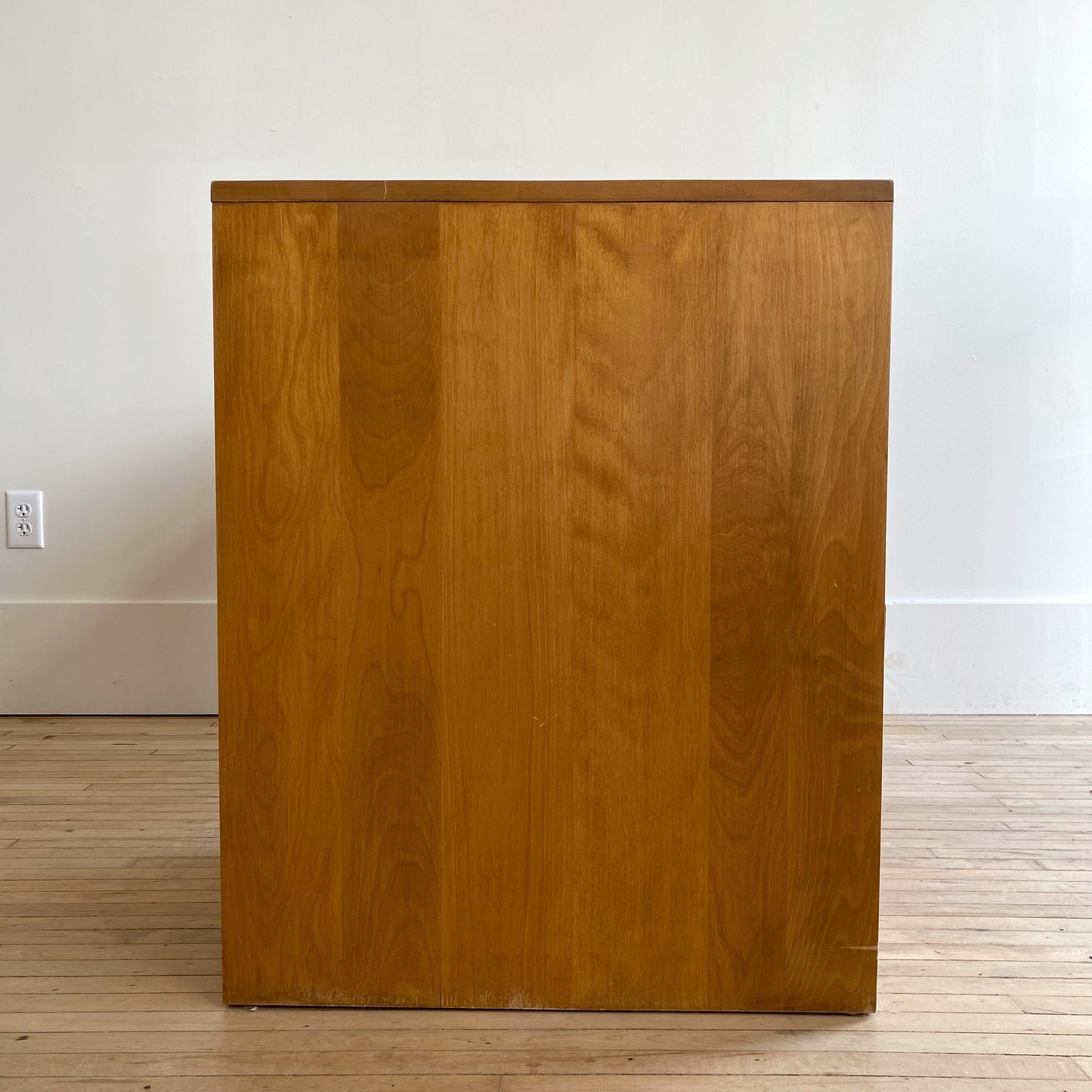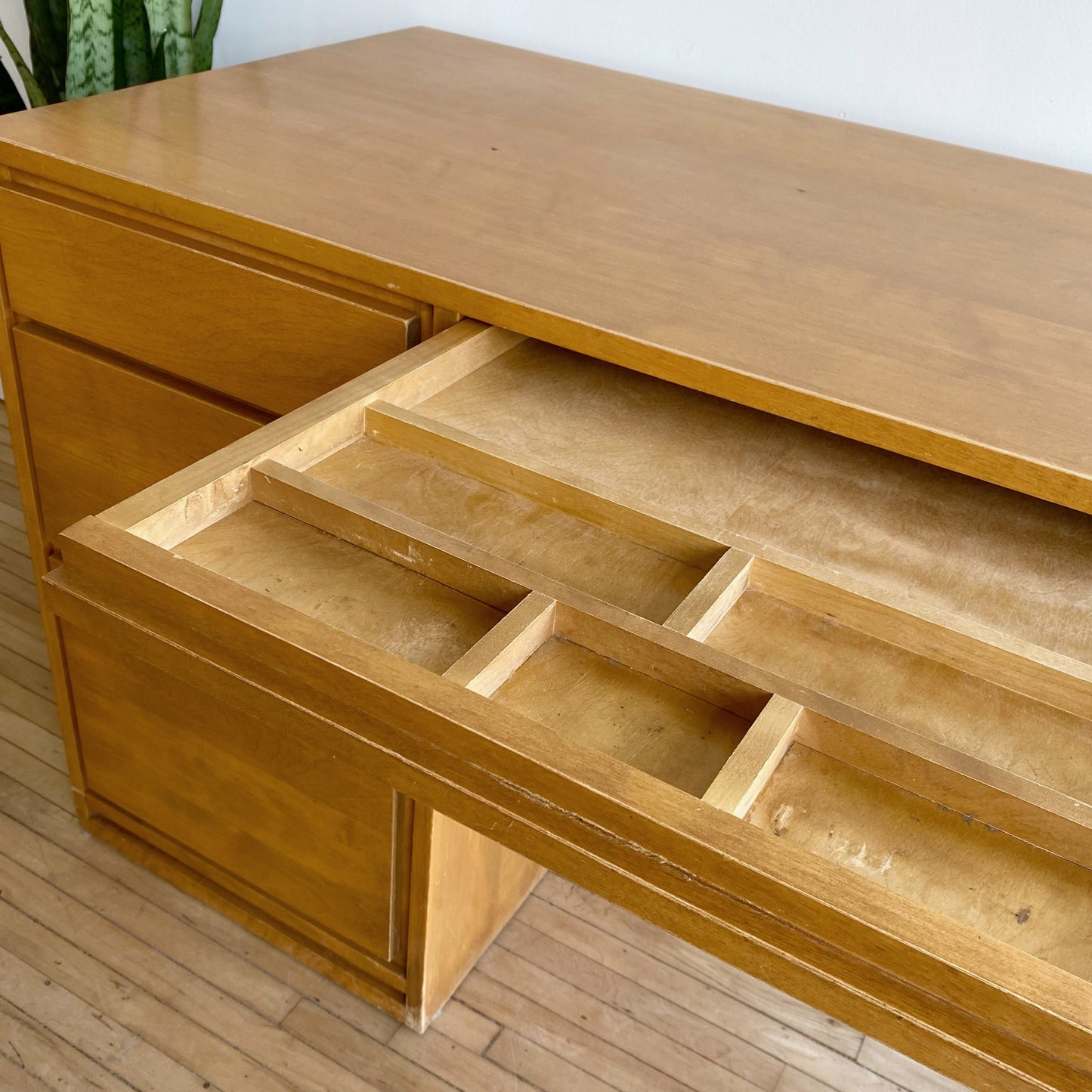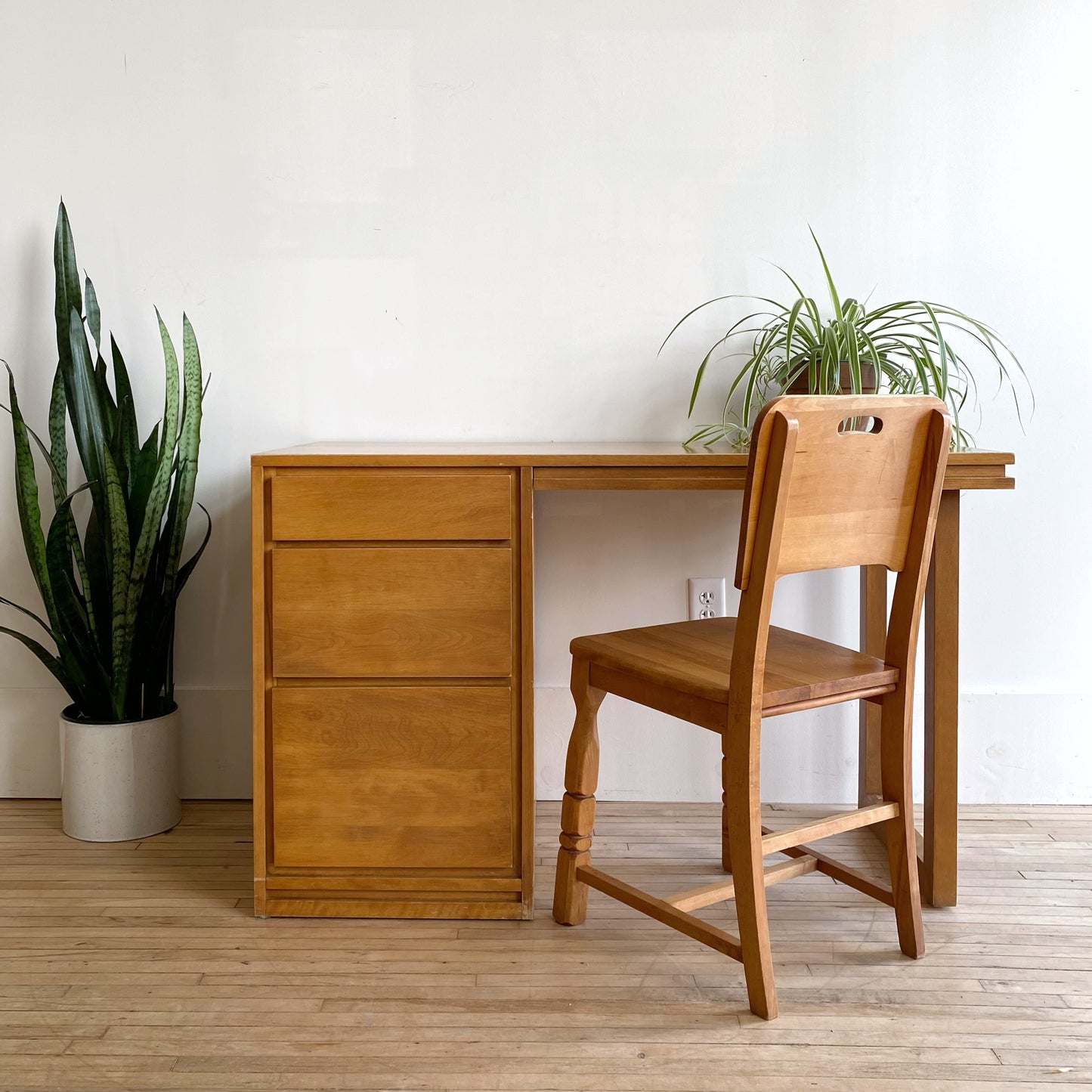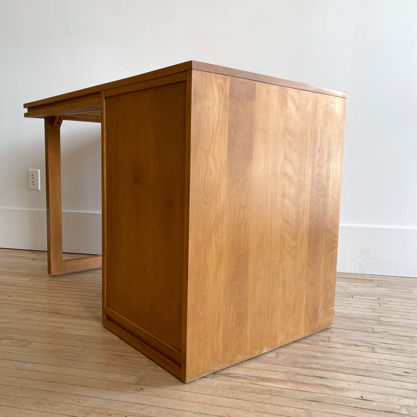 This is a beautiful vintage mid-century modern desk by Conant Ball. It features a column of three roomy drawers on the left, a slim compartmentalized pencil drawer, and open support side on the right. It is a great piece for an office or to use as a vanity.