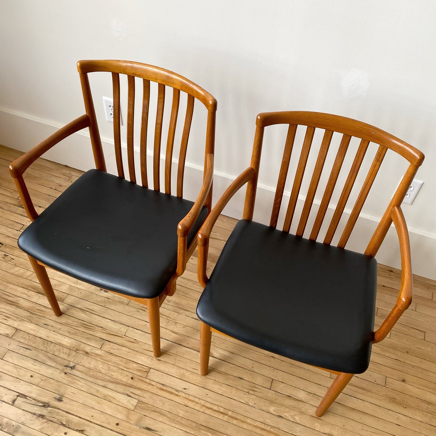 Set of 6 gorgeous vintage 1960’s Danish teak dining chairs. Includes two captains chairs (with arms) and four without arms. They have a sleek, modern, and masculine style with black leather seats. The curves and details are stunning. Exceptional design and quality.