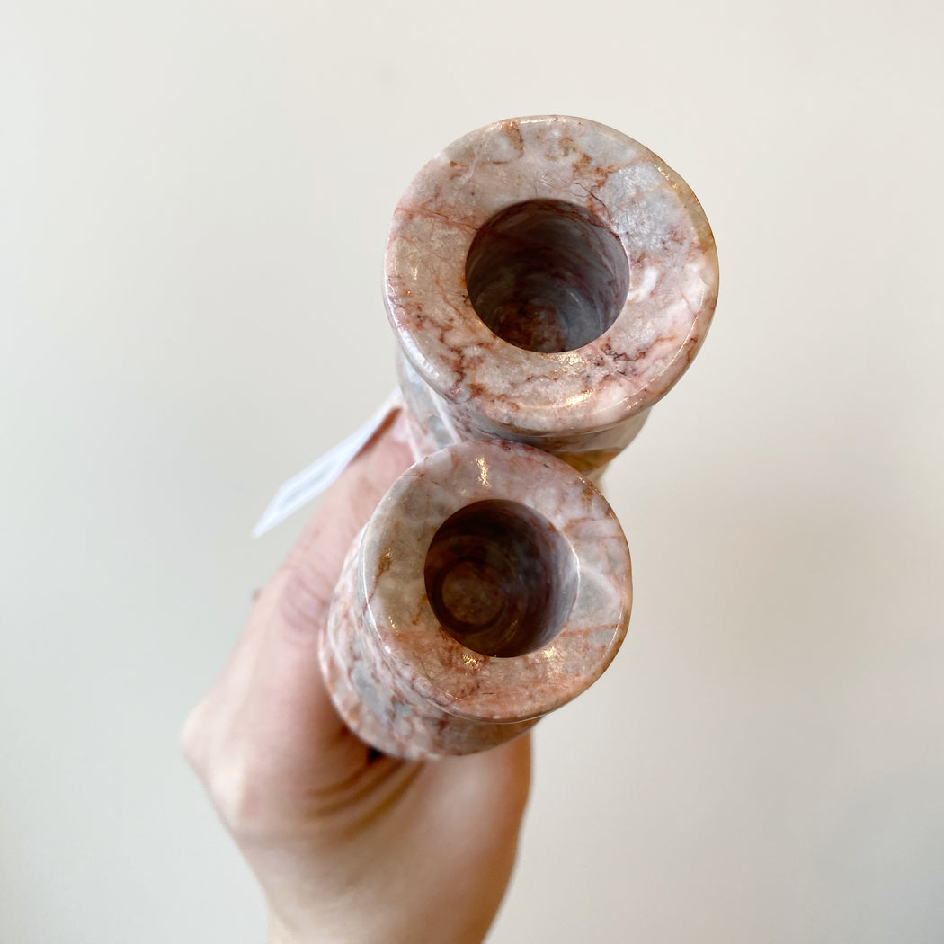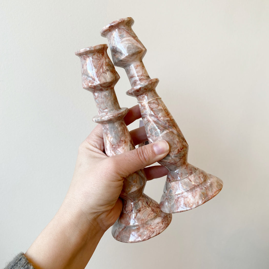 Beautiful pair of vintage marble candlestick holders to compliment any table, mantle, or shelf. We love the natural pink and gray coloring of this marble!