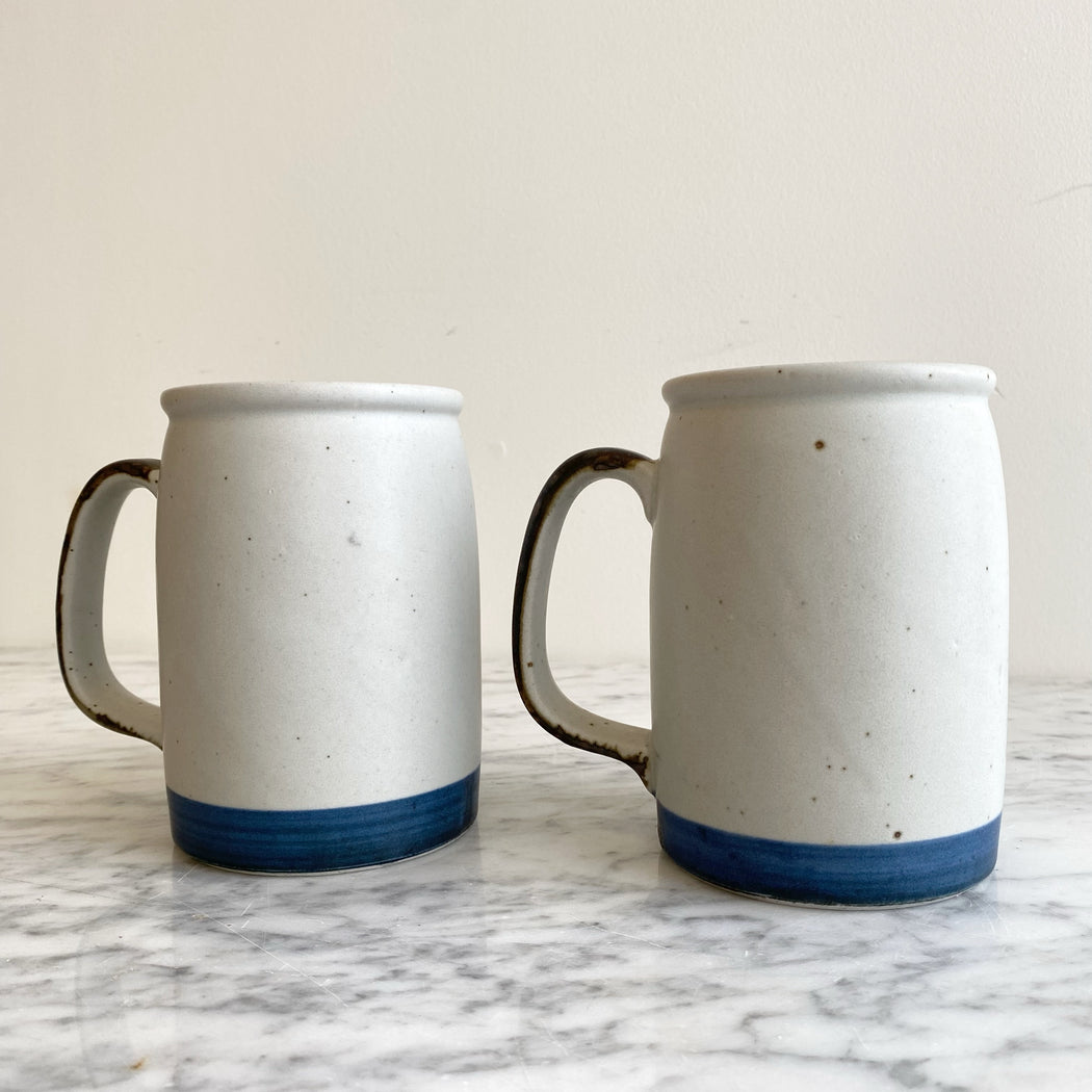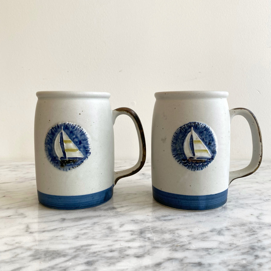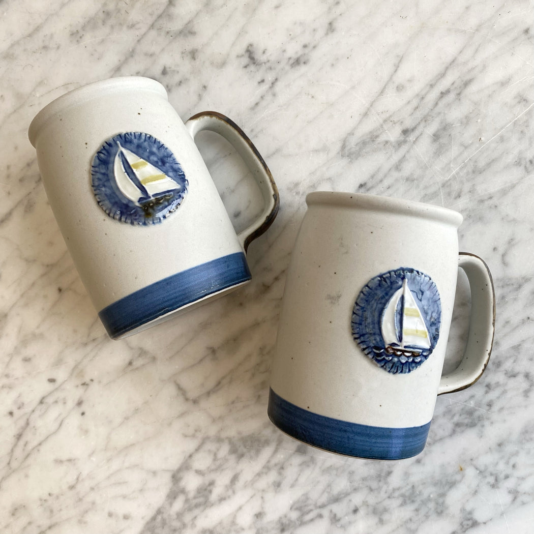 Cheers to summer! Enjoy your favorite beverage in these unique ceramic mugs-- featuring hand-painted sailboats and water-like blue accents!