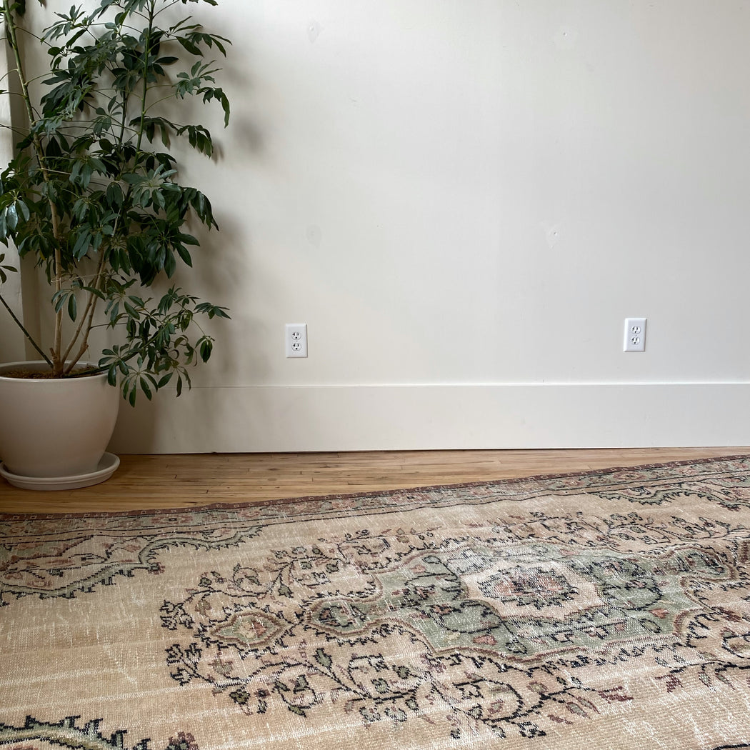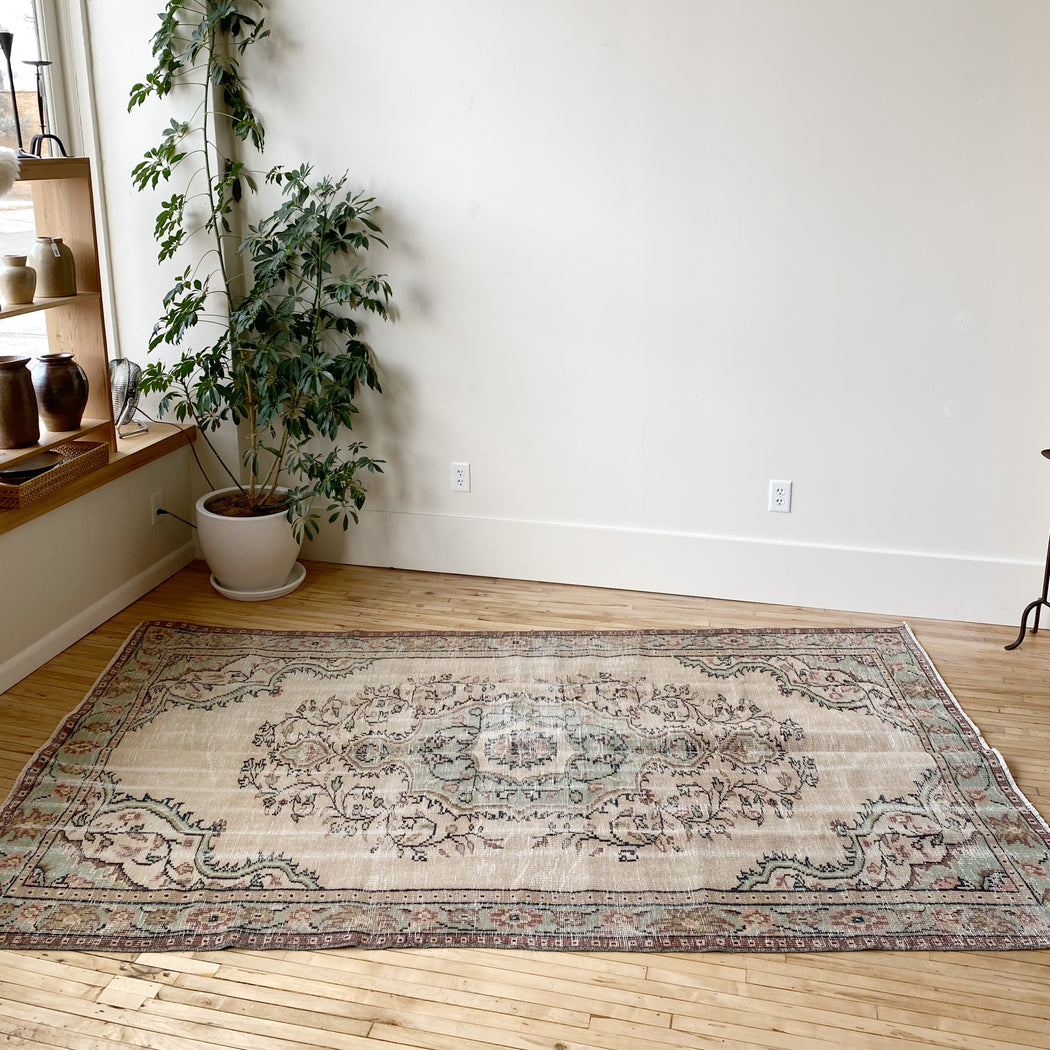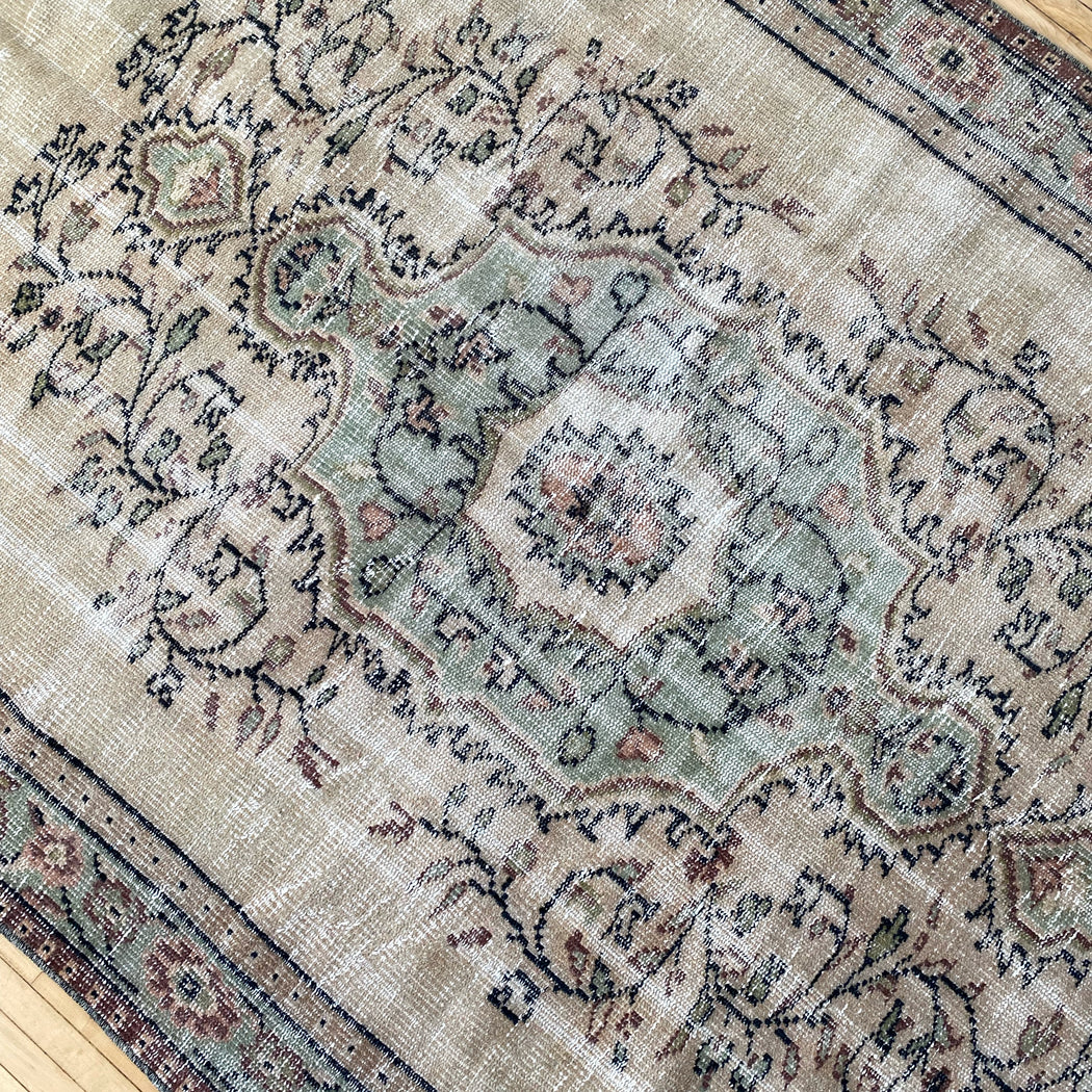 Vintage hand-knotted wool area rug. Soft, neutral palette with center medallion design and complimentary border. It's a versatile size and would be a lovely addition for an entryway, dining room, or bedroom...