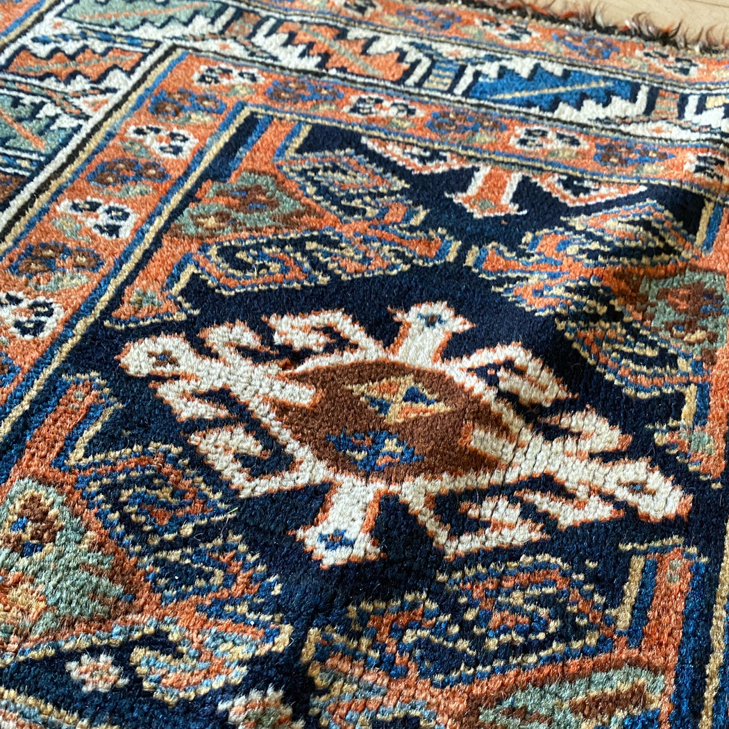 This is a beautiful hand-knotted textile piece, which could be used as a small rug/mat, as a tabletop textile, hung on the wall as-is or framed!