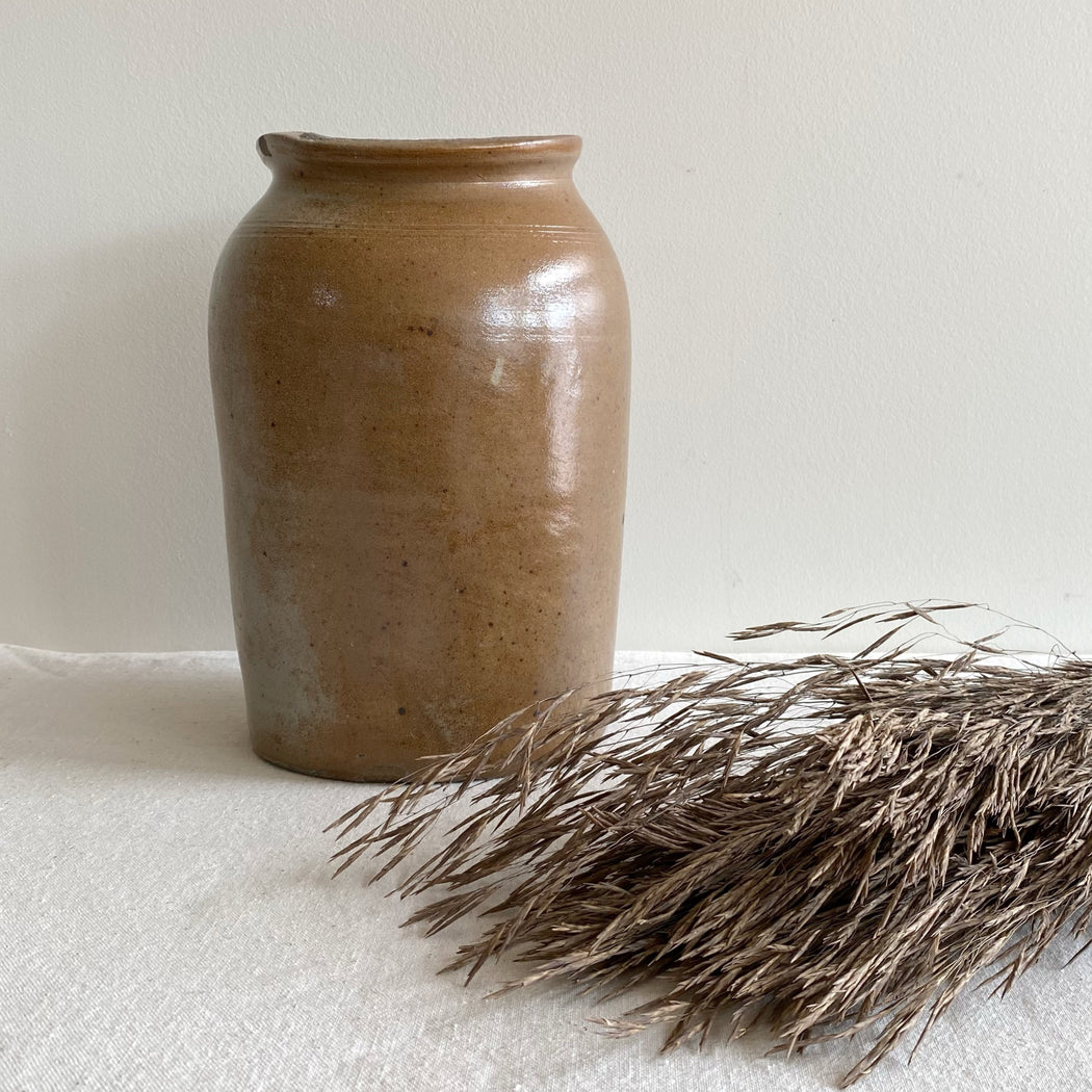 A gorgeous antique stoneware vase / jar for your collection! It’s perfectly imperfect and is a great way to add warmth, texture, and a natural look to your home. Add your favorite dried stems for additional texture!
