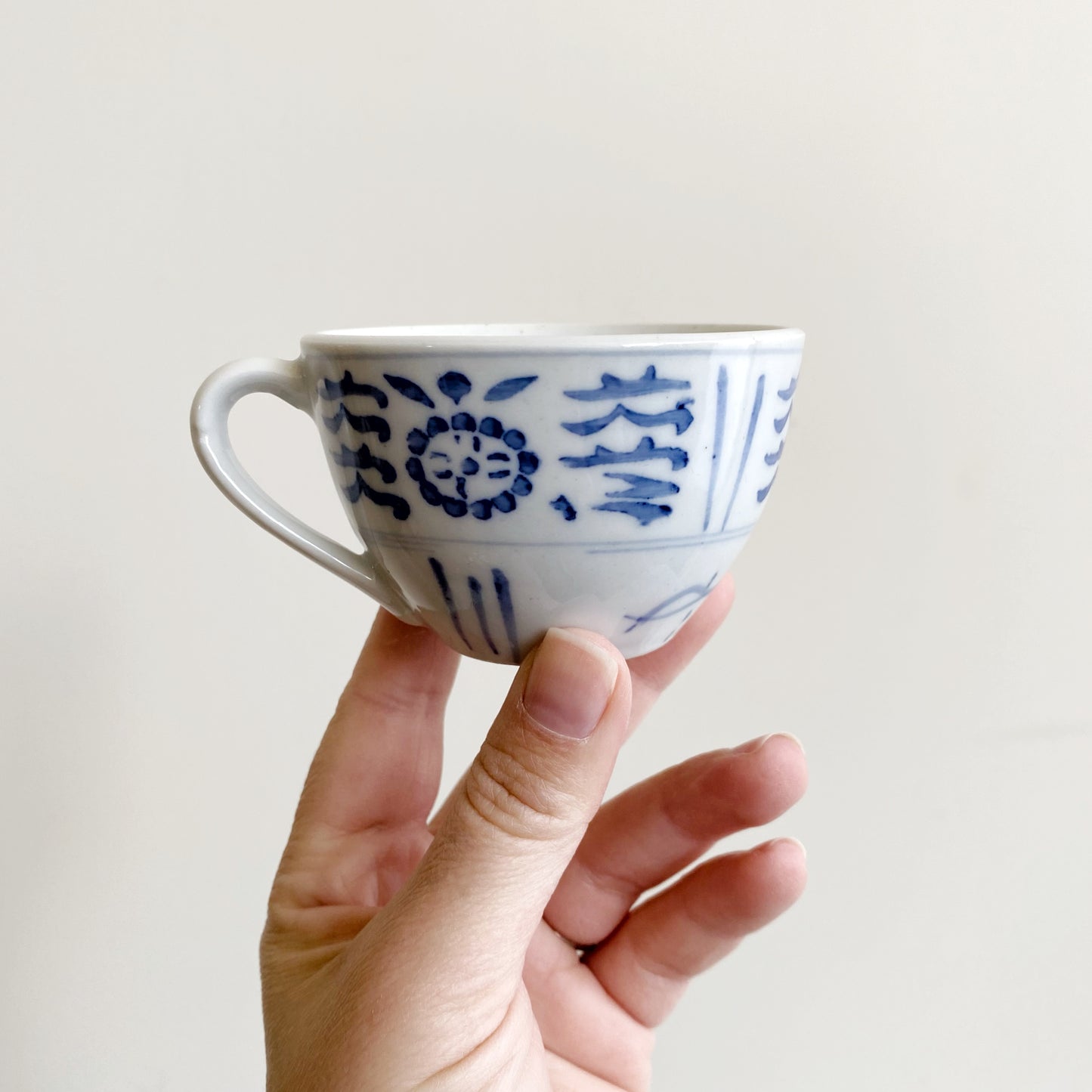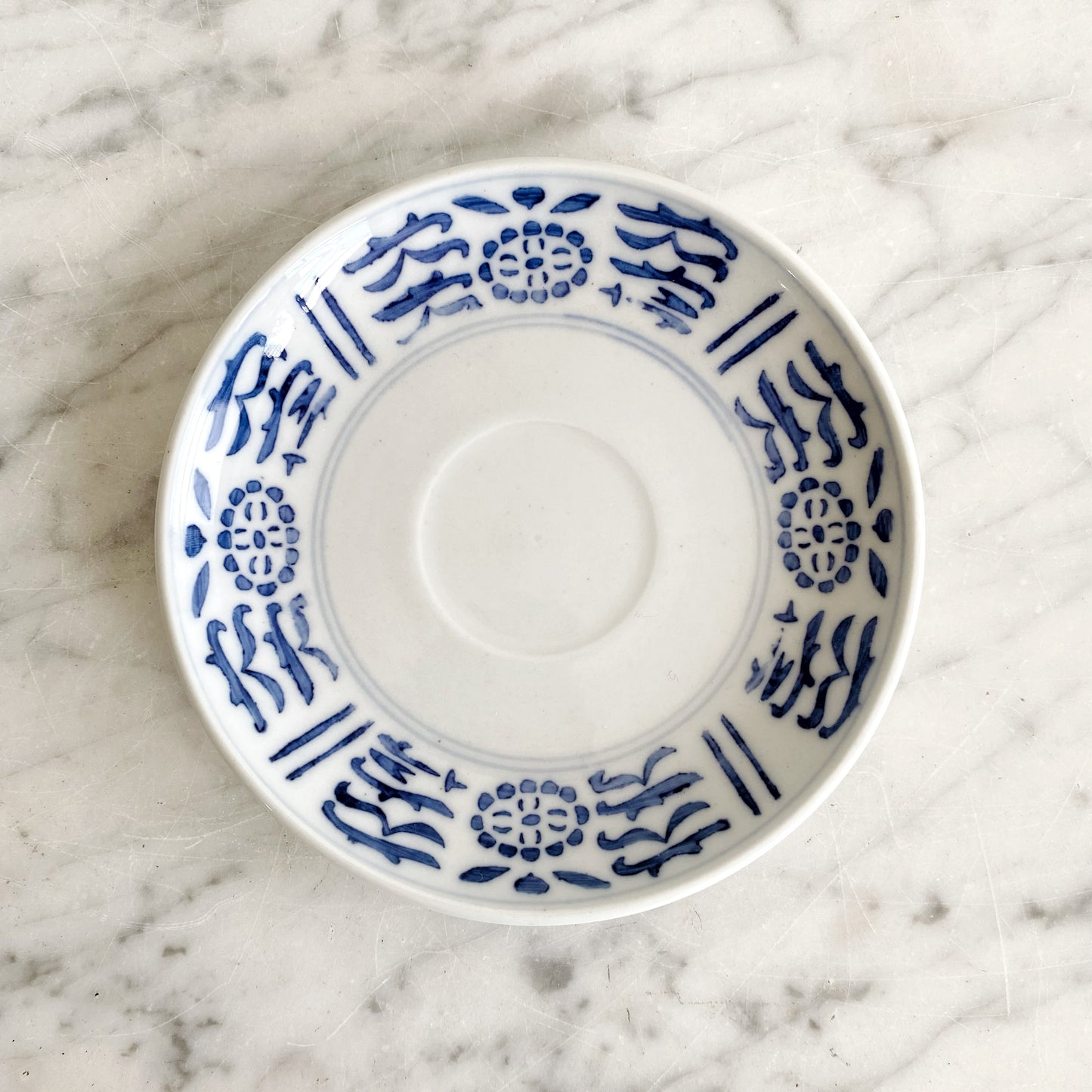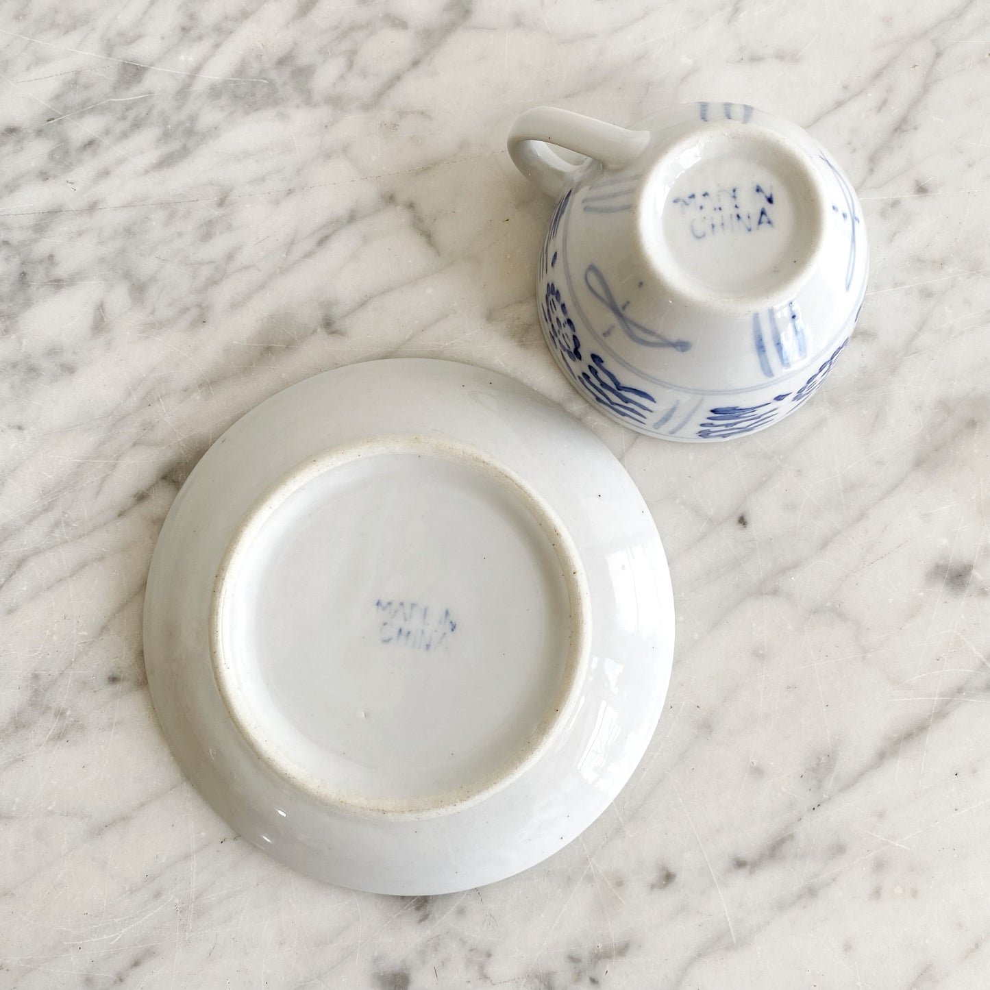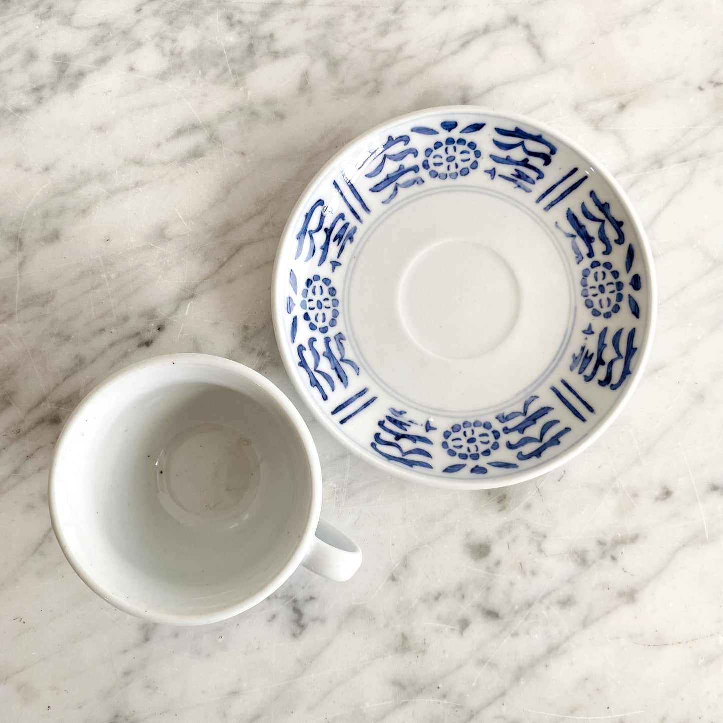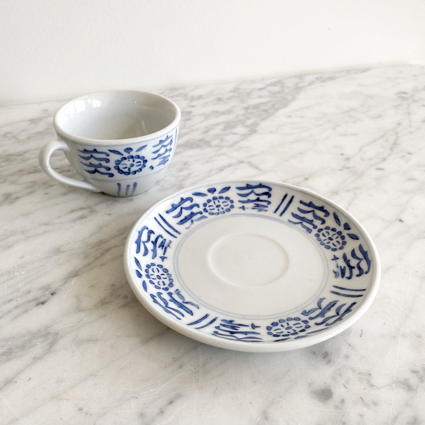 A super sweet vintage white ceramic teacup and saucer set featuring a lovely stamped blue flower pattern! Perfect for sipping your favorite cup of matcha!