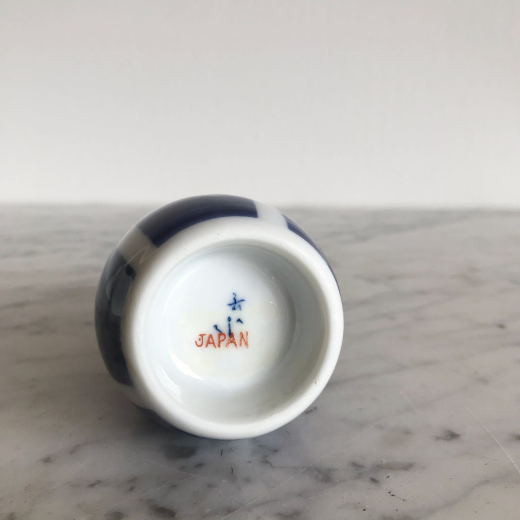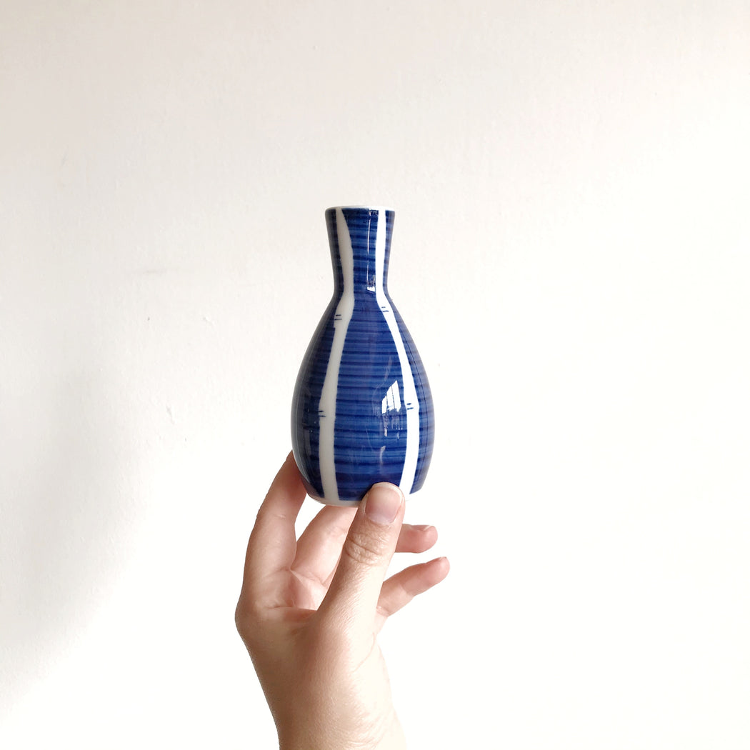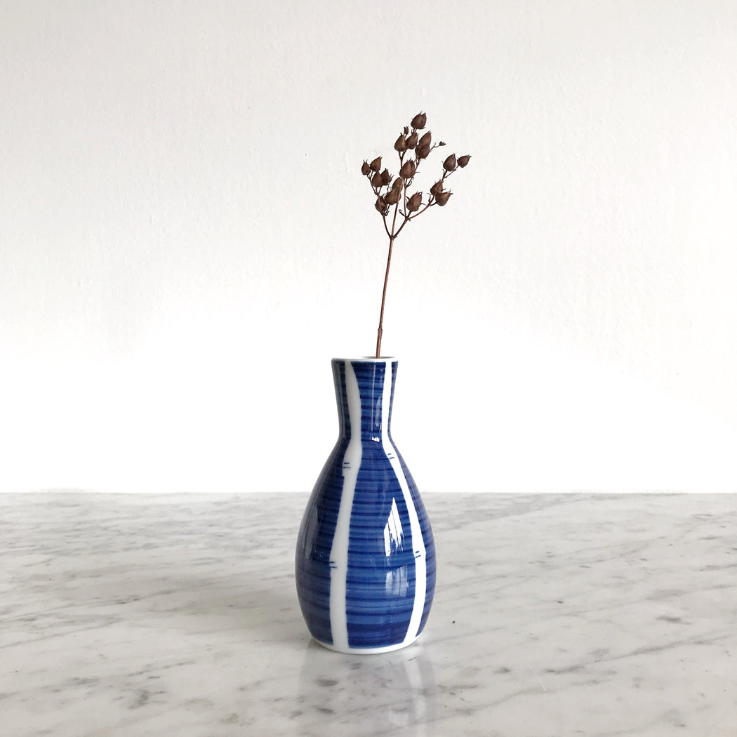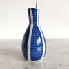 Blue and white ceramic bud vase with vertical stripes. Made in Japan.