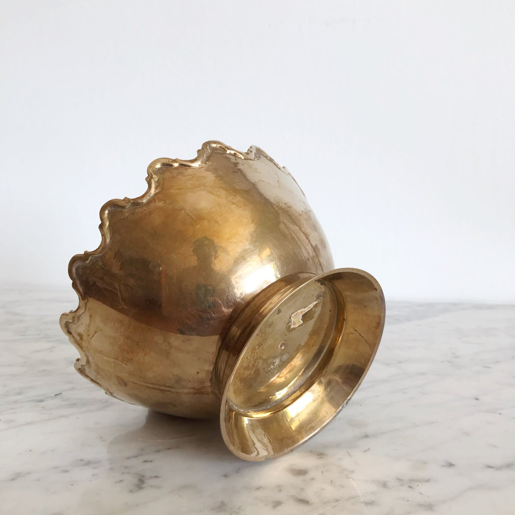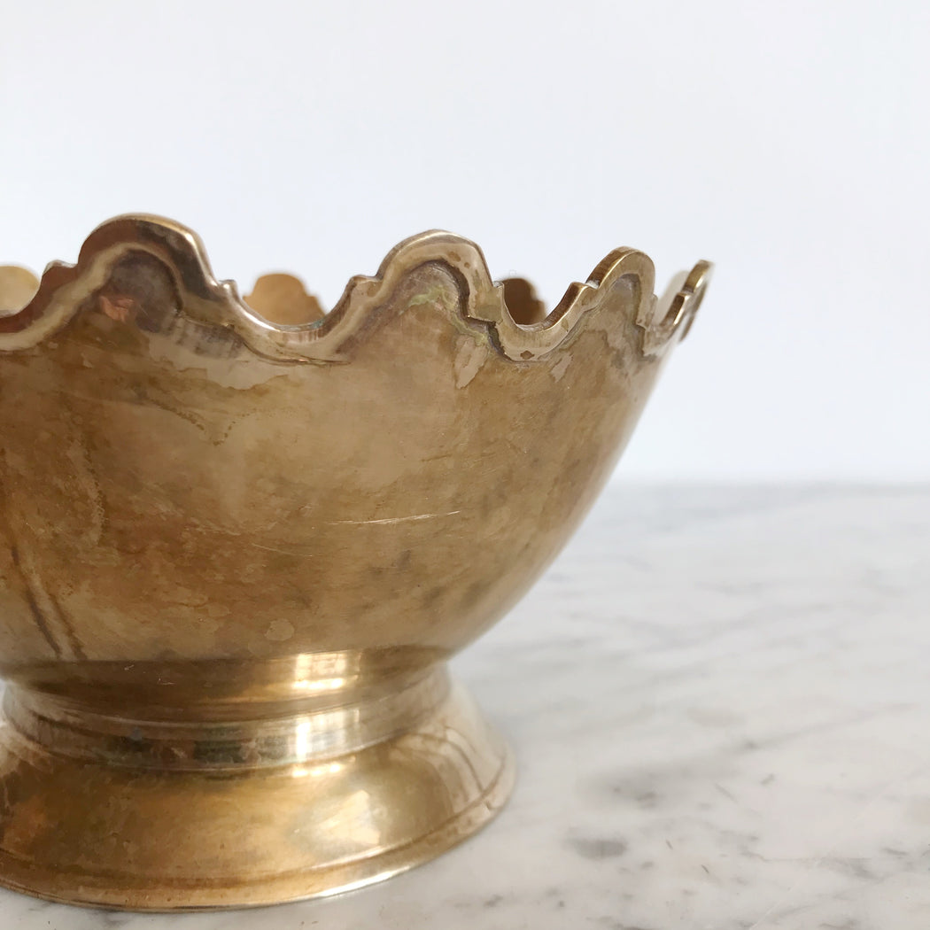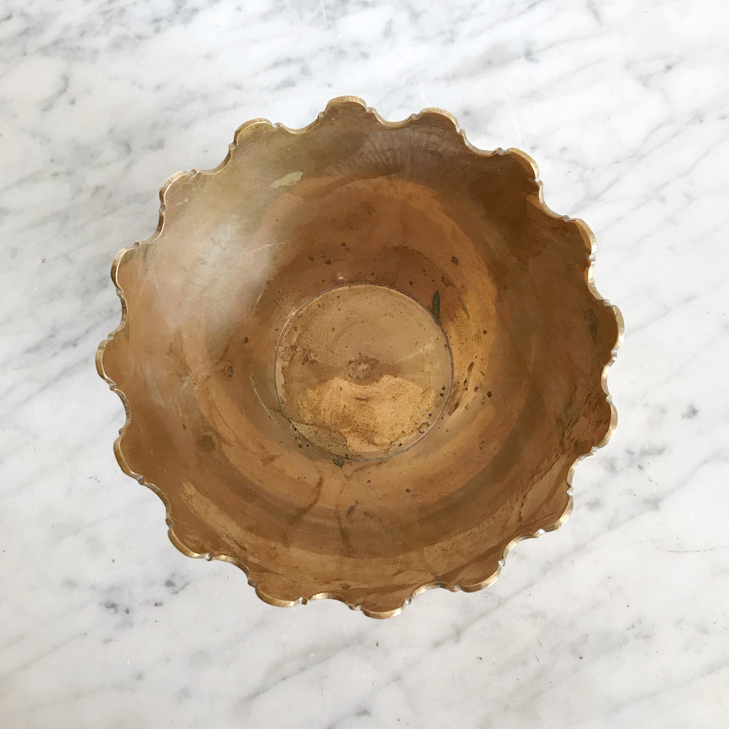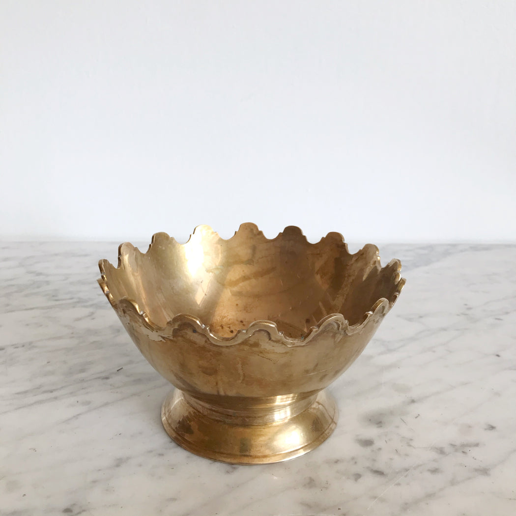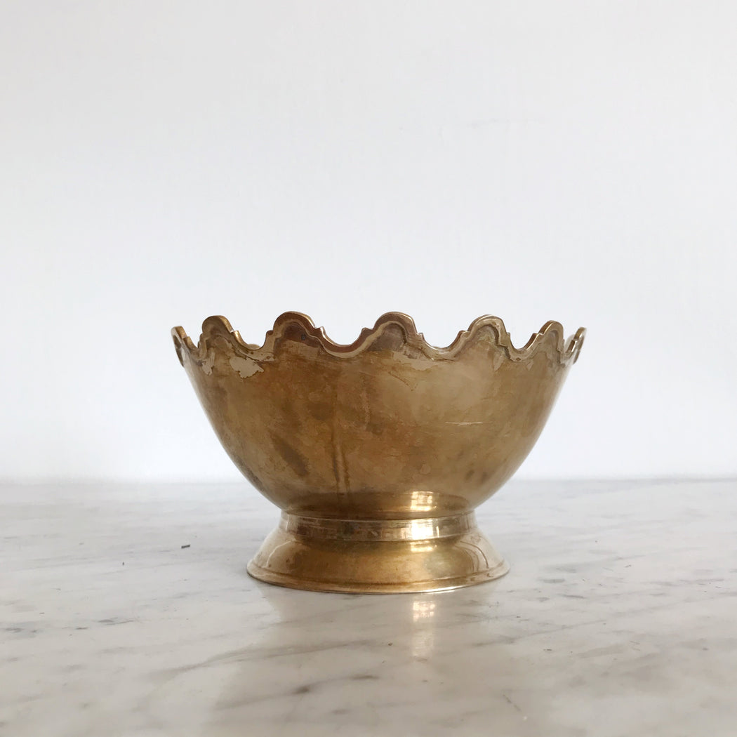 Fancy vintage brass footed bowl with neat border/rim. This would be a great piece for displaying collections from a nature walk, potpourri, or as-is on a bookcase!