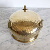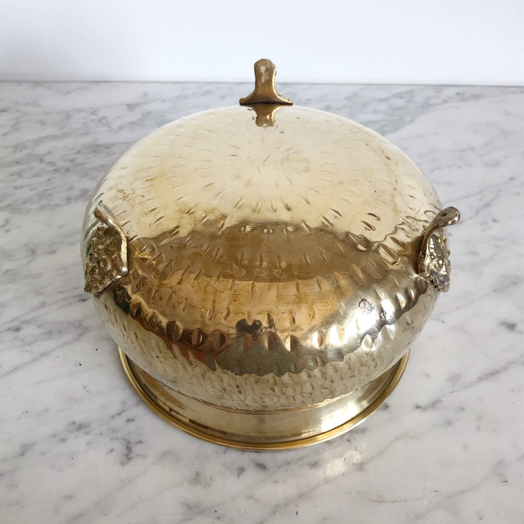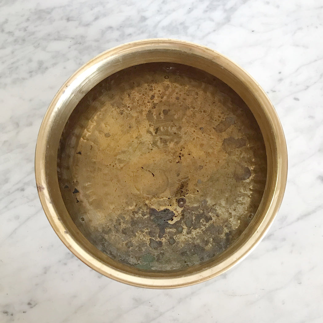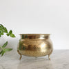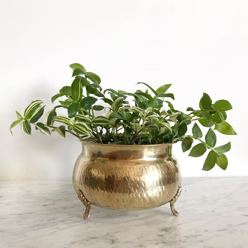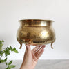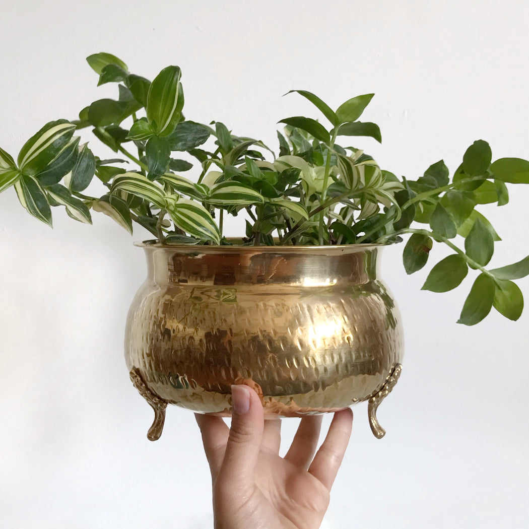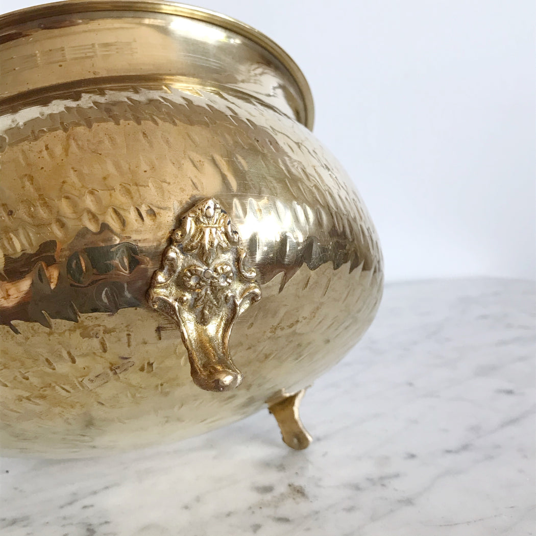A beautiful vintage brass planter with a unique imprinted dash texture, and the sweetest feet featuring tiny bows on each.