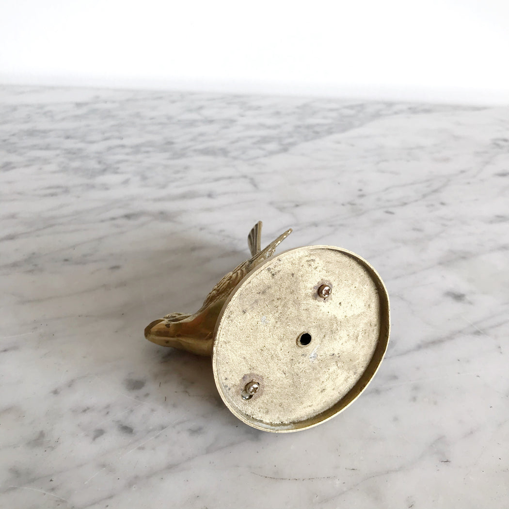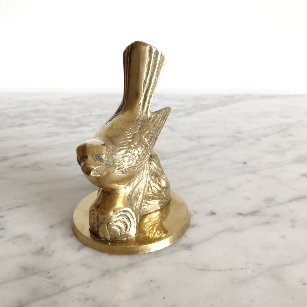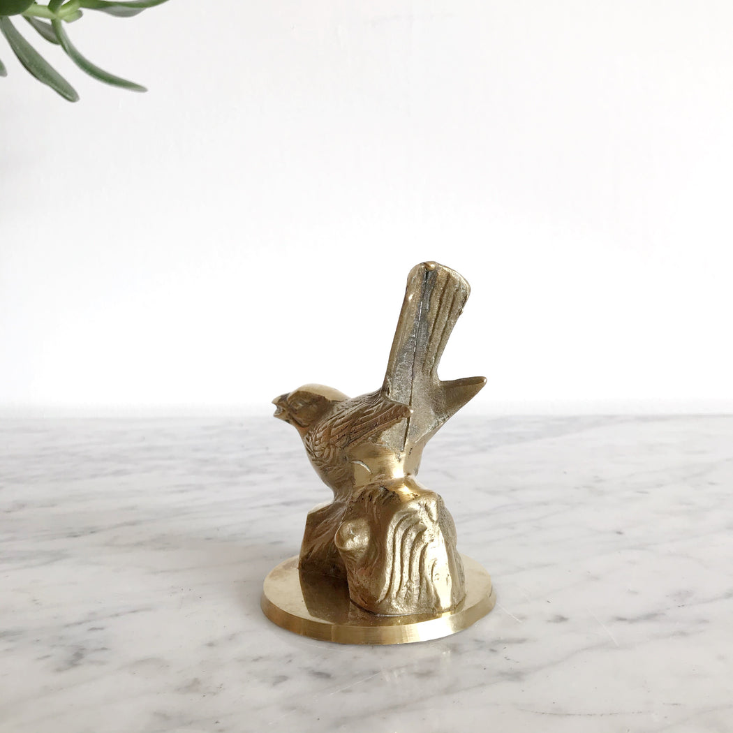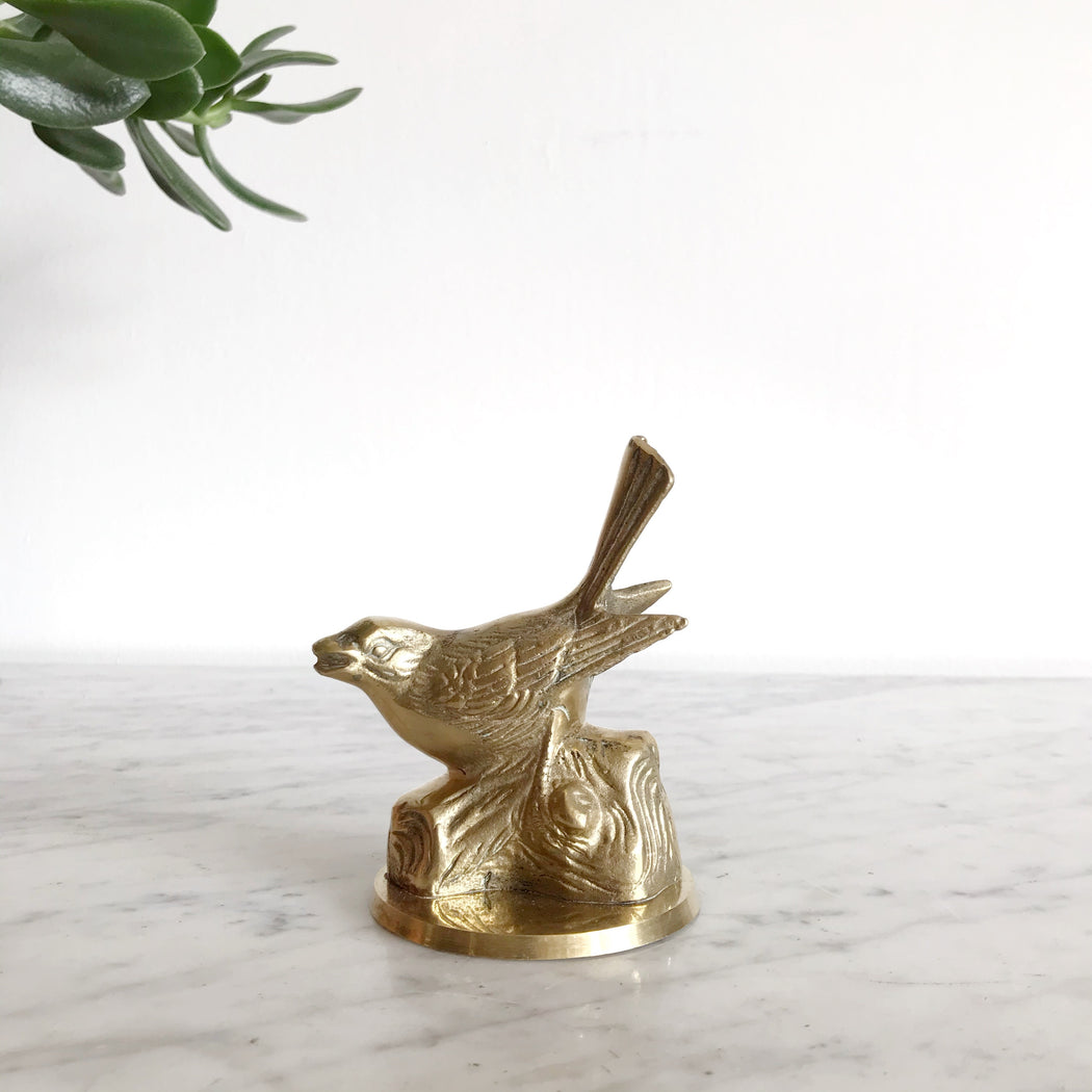 Darling vintage brass songbird to brighten your home! She has beautiful feather details, and we love the wooden branch she's standing on too!