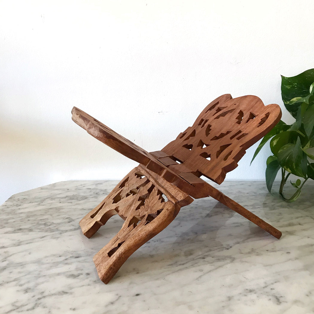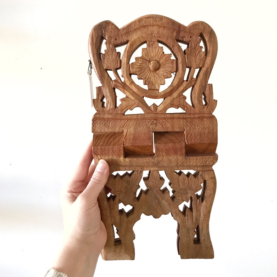 Beautiful carved wood book stand. Perfect for holding a recipe book in the kitchen or coffee table book in the living room... even displaying your favorite book on the bookshelf!