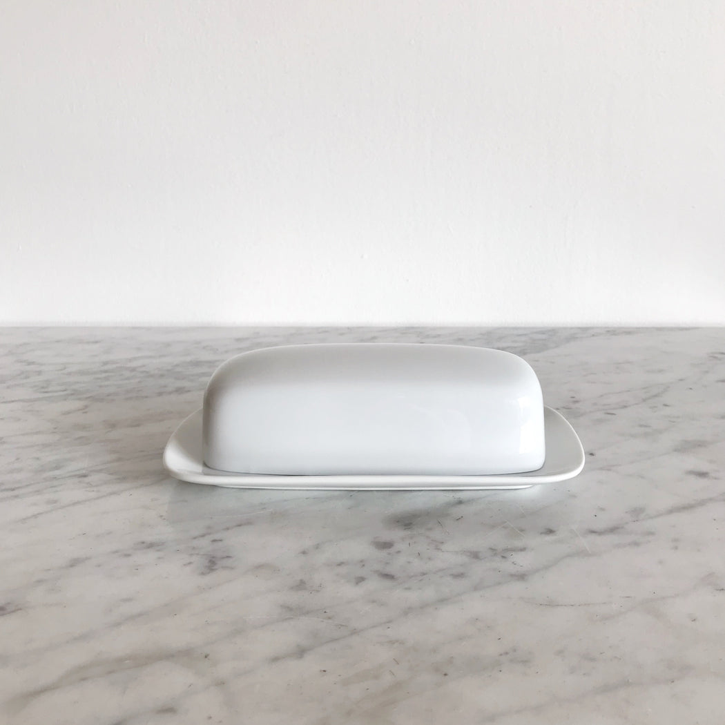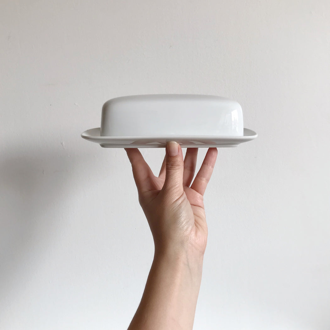 Beautifully simple and timeless white ceramic covered butter dish.