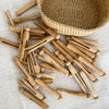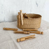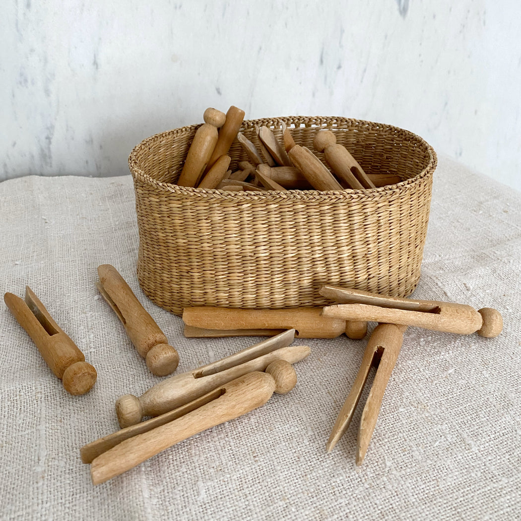 Collection includes 35 vintage wooden clothespins in woven grass basket / container