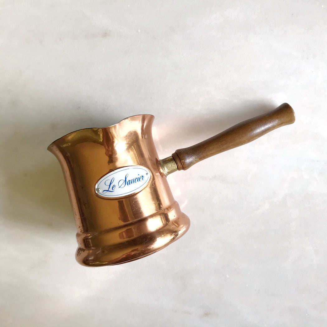 Charming vintage copper saucepan by Teleflora, circa 1984. Made in Portugal. The worn copper body, "Le Saucier" name plate, and wooden handle are so sweet!