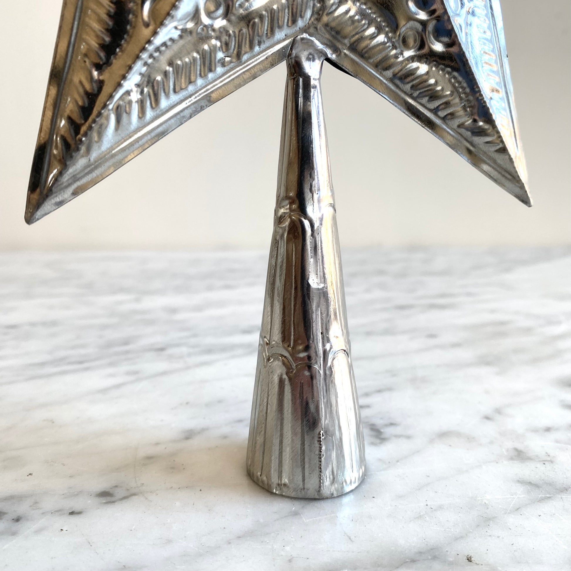 Masterfully made in Oaxaca, Mexico, this 3D tin treetop star boasts an intricate one-of-a-kind embossed design.