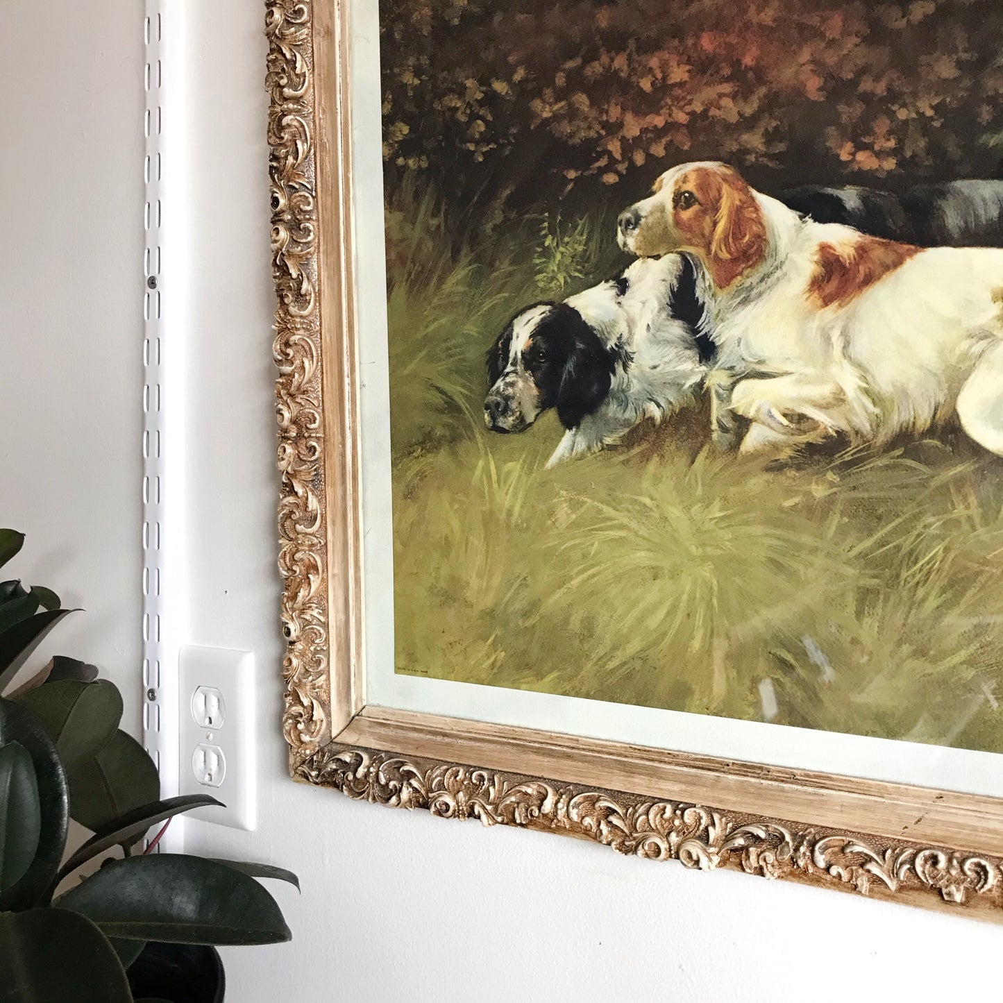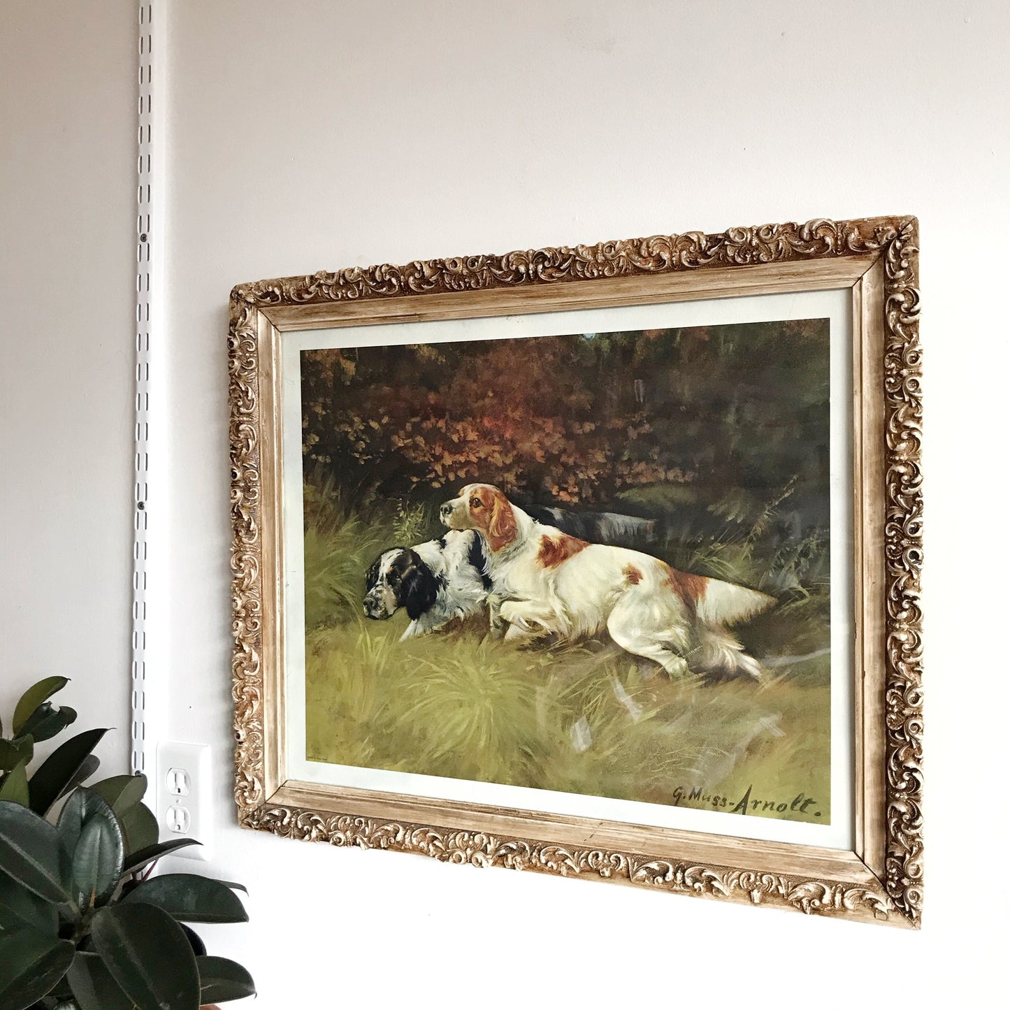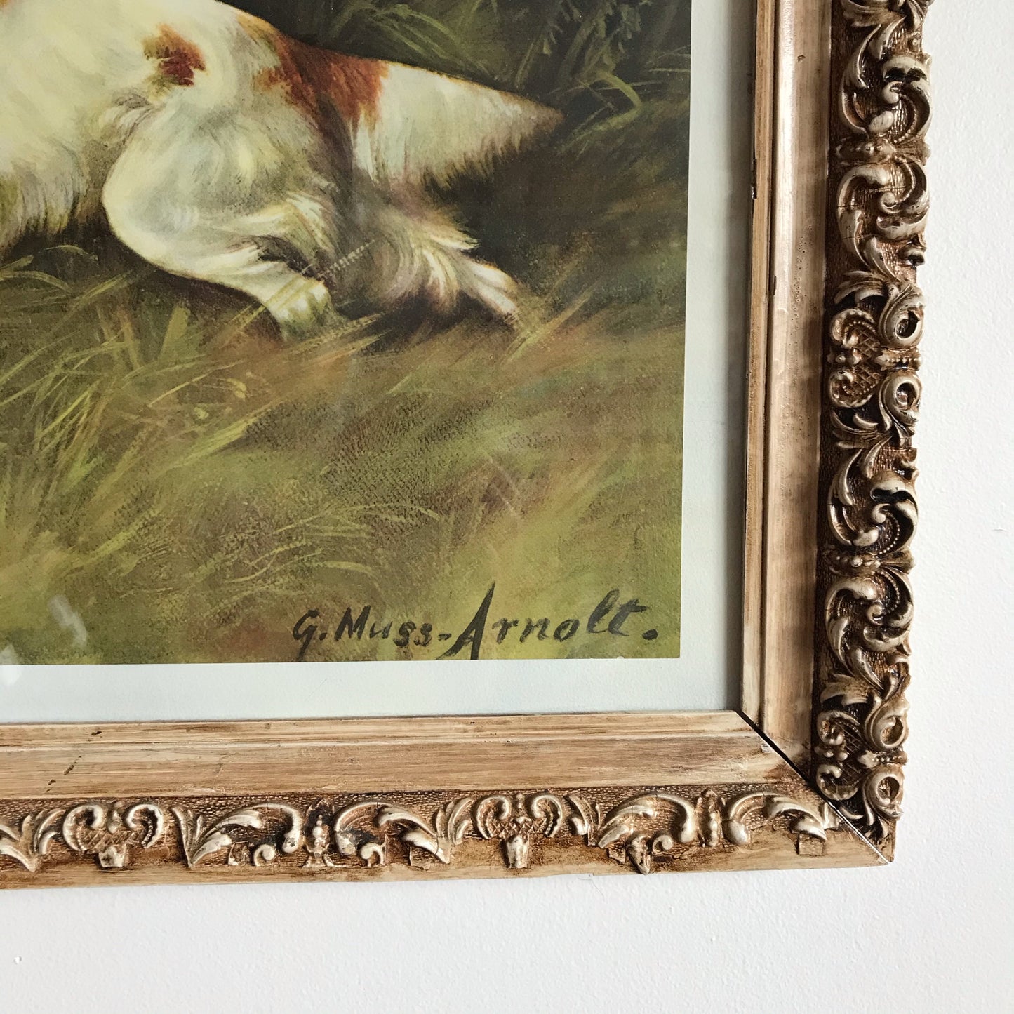 Vintage large print of hunting spaniels, in a decorative frame. Signed by G. Muss-Arnolt.