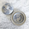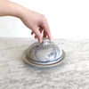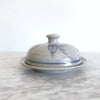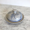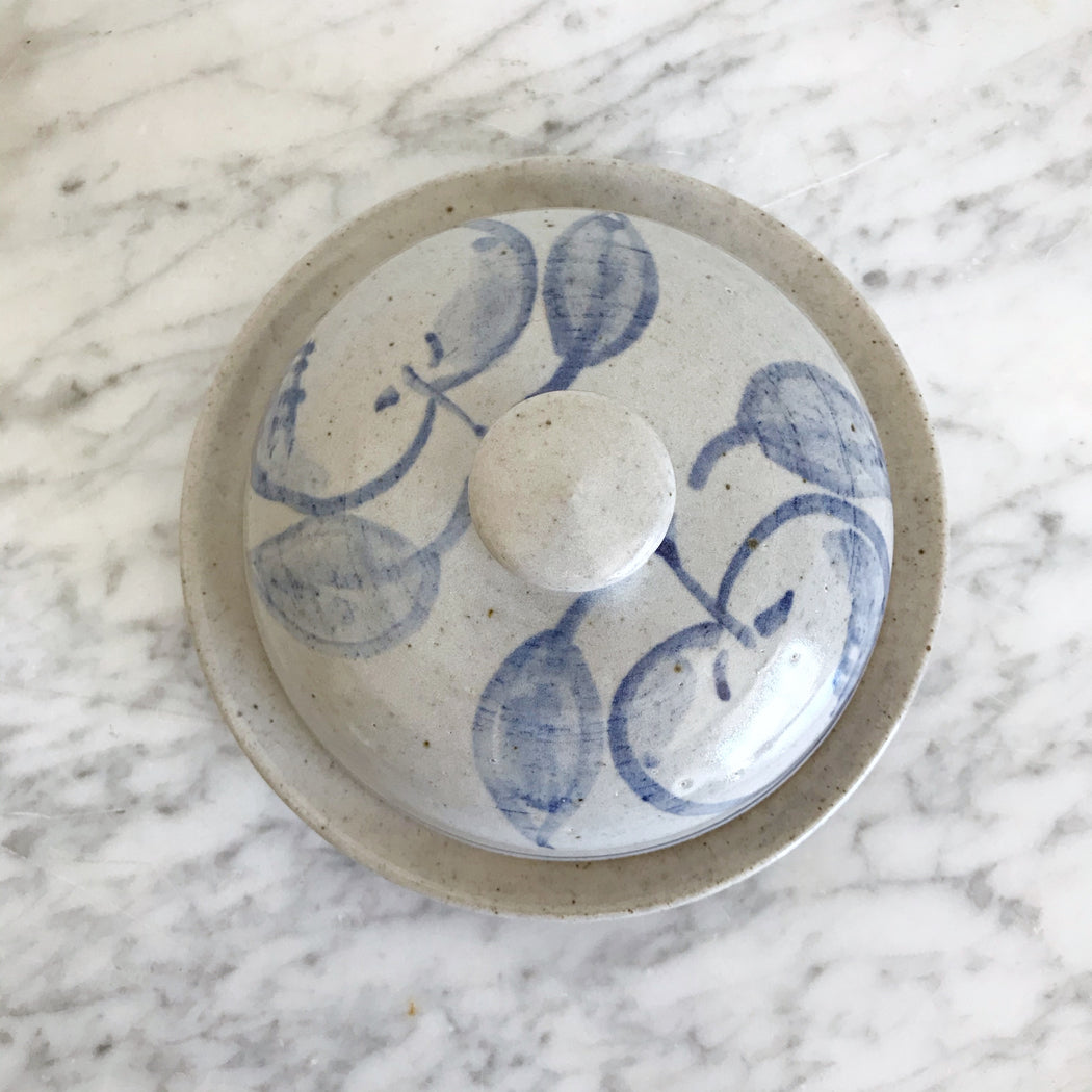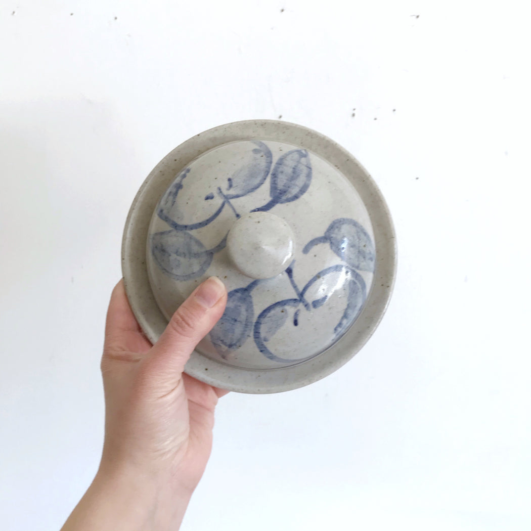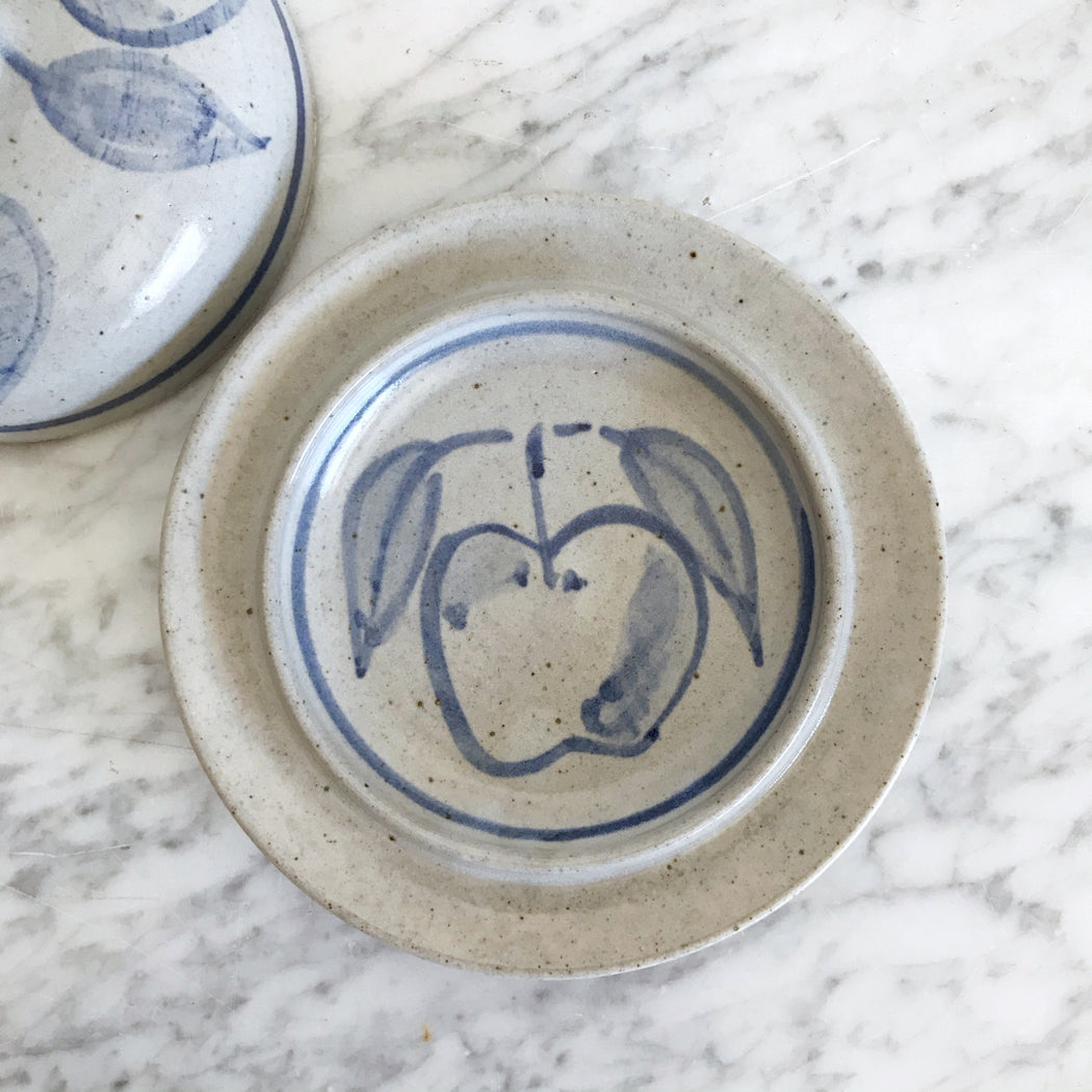 A beautifully handcrafted pottery lidded dish with hand-painted apple designs. Perfect for butter or other kitchen goodies!