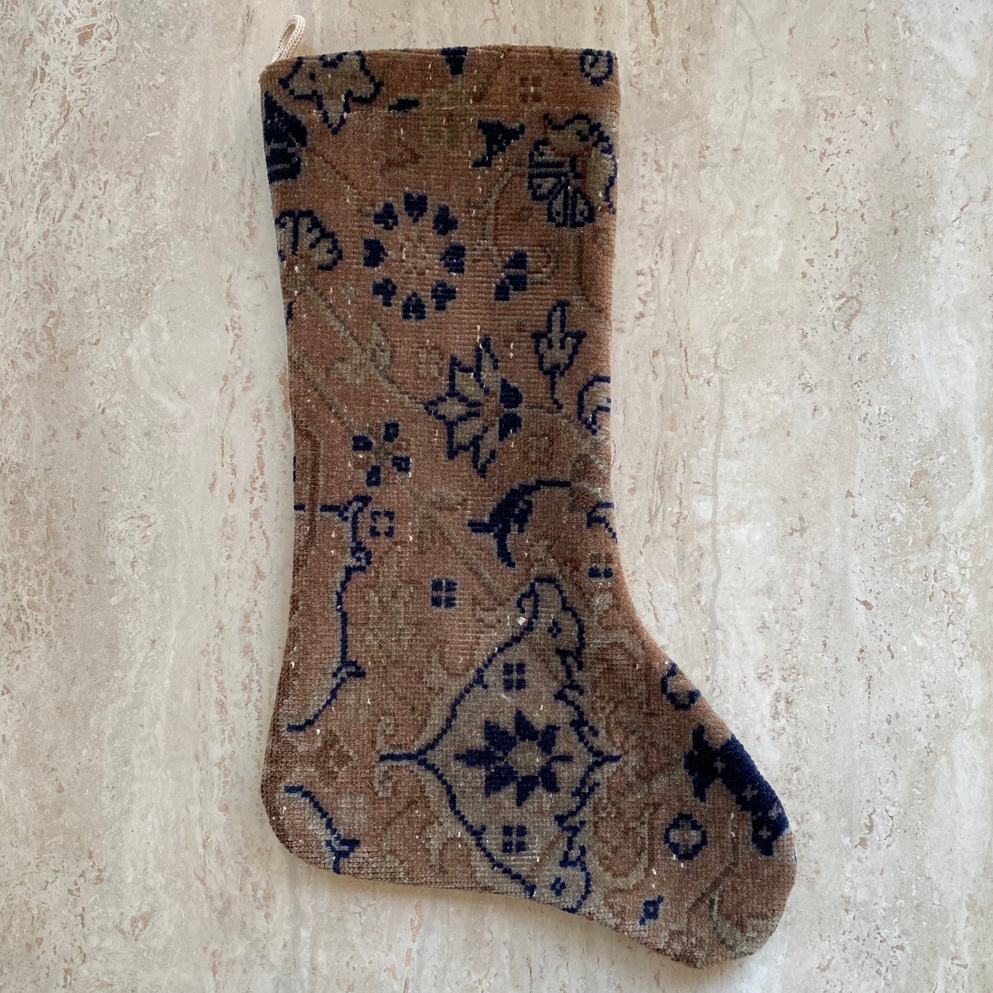 Heirloom quality holiday stocking to be enjoyed for years to come! Each one is crafted by hand from vintage hand-woven Turkish rugs that are 60+ years old. The backing is a nice neutral fabric, and the interior is lightly lined. Each one is unique and special-- a treasured addition to your decor and festivities!