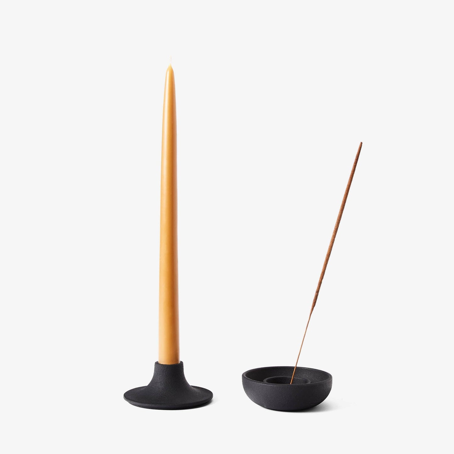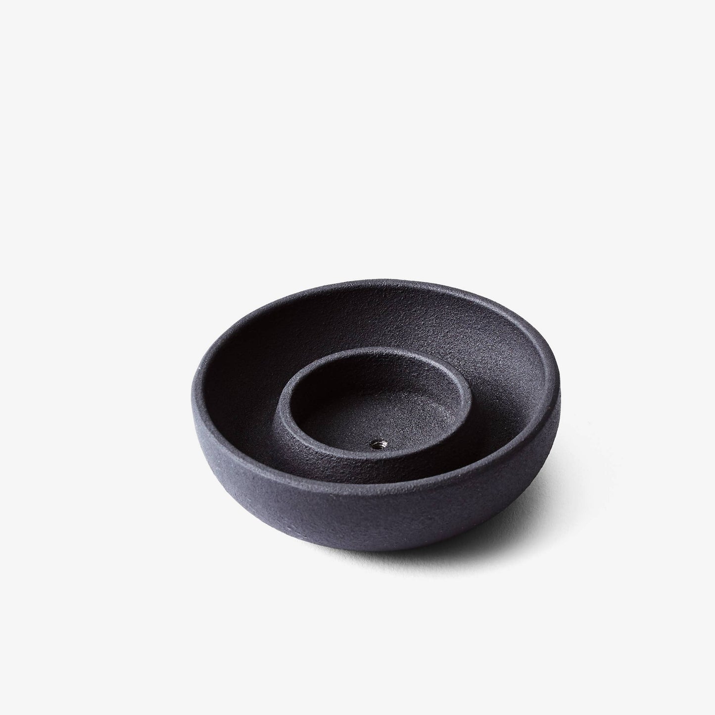 A simple cast iron candle holder with a three-in-one feature. Remove the top to reveal a space for a votive or stick of incense. Choose the mood you wish to set and burn one illumination – or all three.