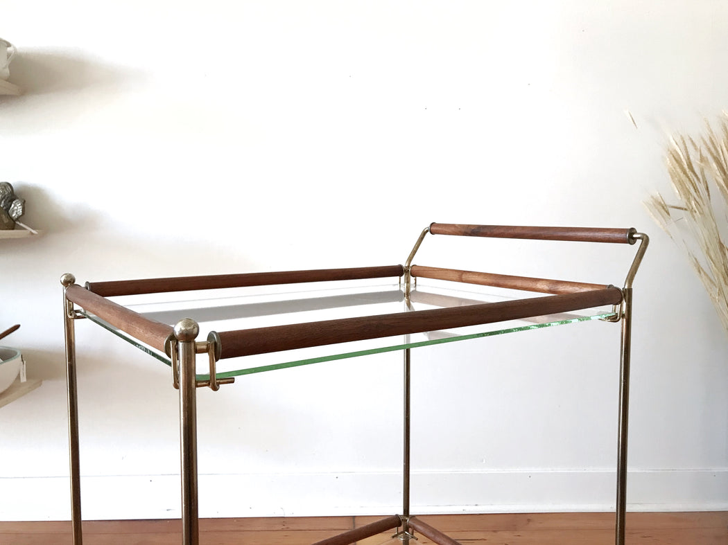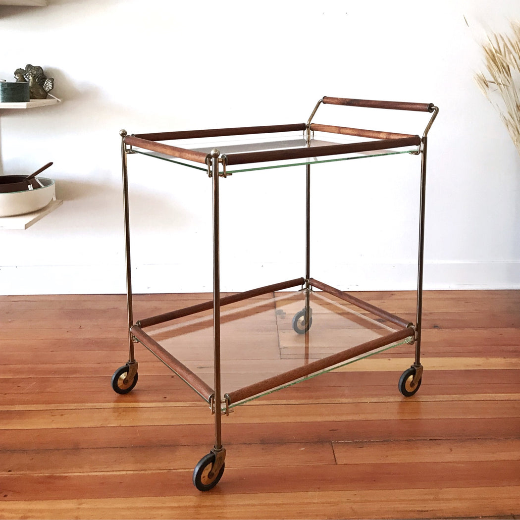 Stunning 1950's vintage Italian bar cart with teak rails, gold metal frame, and glass surfaces. Perfectly minimal design!