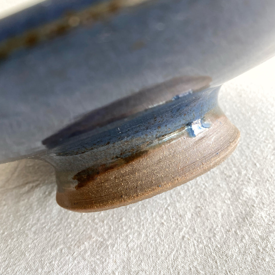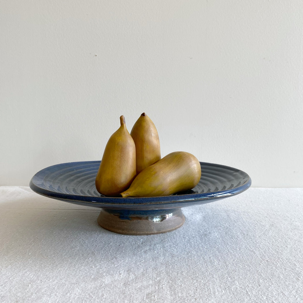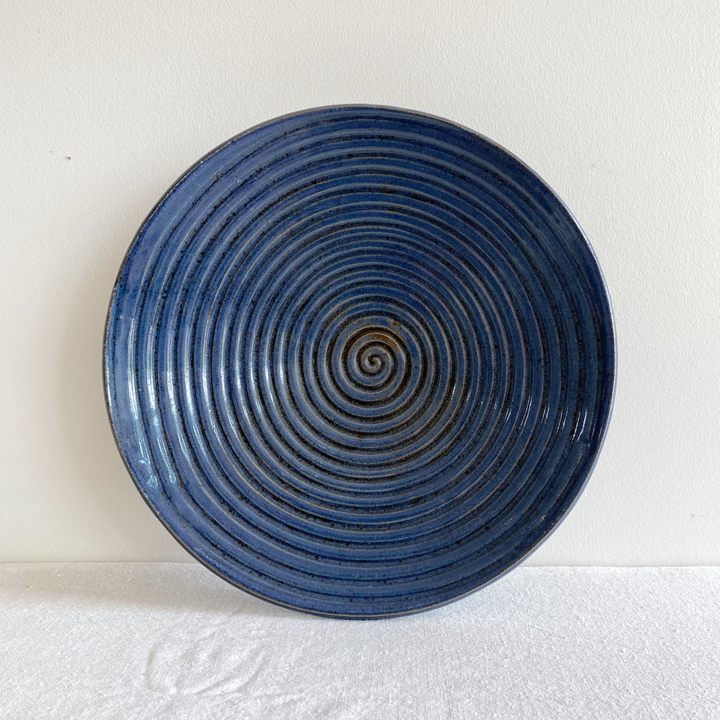 Beautifully handcrafted stoneware platter featuring a spiral design and blue glazing. It's a lovely way to serve your freshly baked goods or favorite fruits at your next gathering!