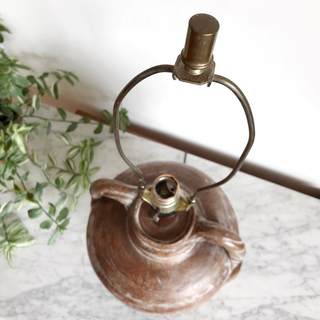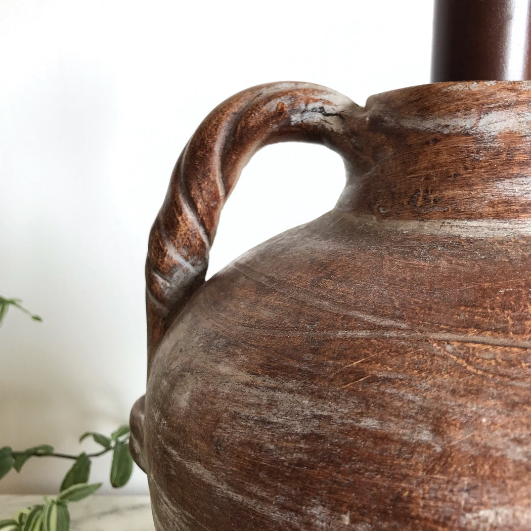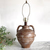 Beautiful large ceramic lamp base very reminiscent of an primitive olive jar. It has the perfect balance of organic minimalism, and would work in any room or entryway. Ready for you to add a shade that works with your style!