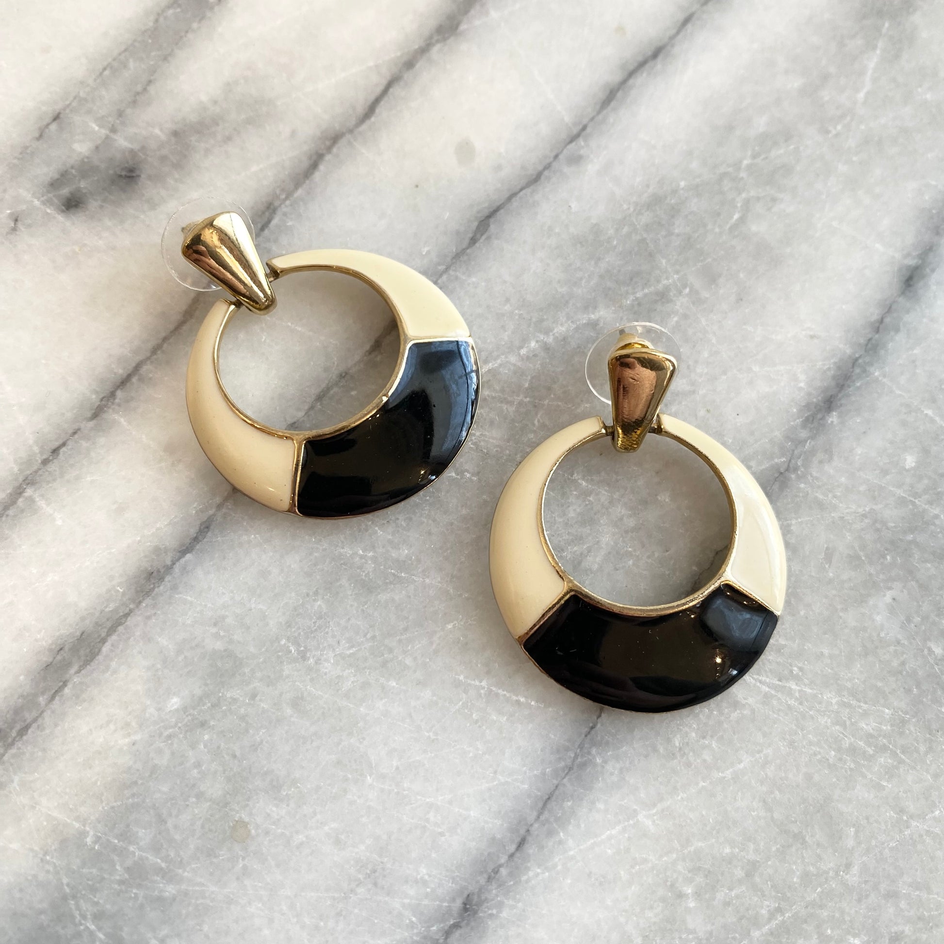 We love these larger vintage postmodern earrings! They feature a golden base with ivory and black enameling. A bold artsy statement!