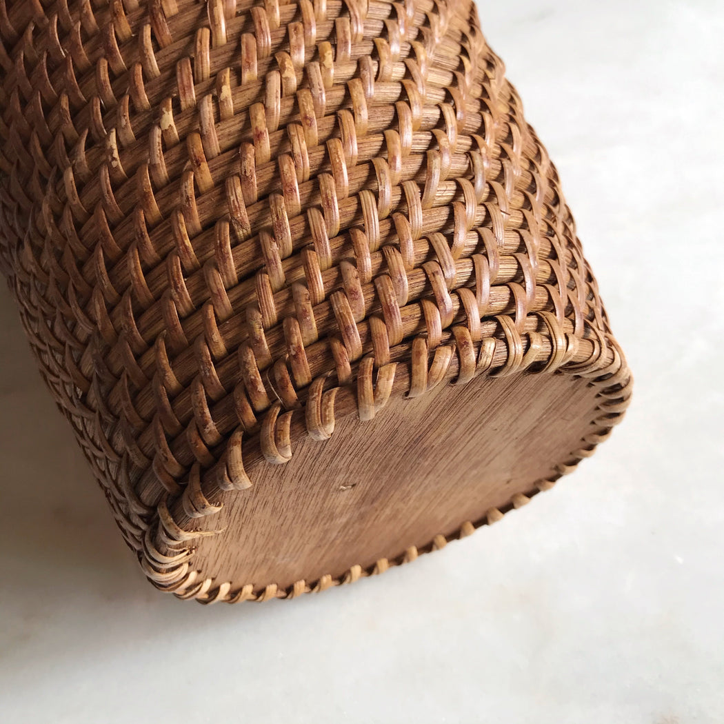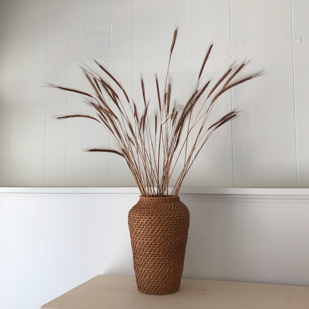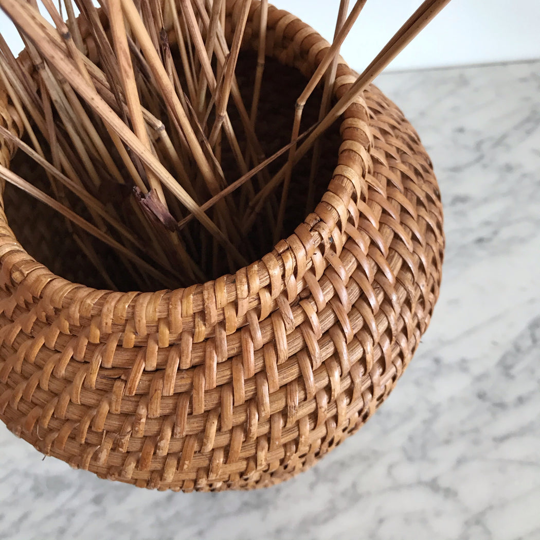 This vintage woven wicker vessel is a great way to add some natural texture to any space. There is a wooden bottom, and a foam block secured on the inside/bottom for when you would like to add decorative stems... It would look particularly beautiful holding some dried grasses!