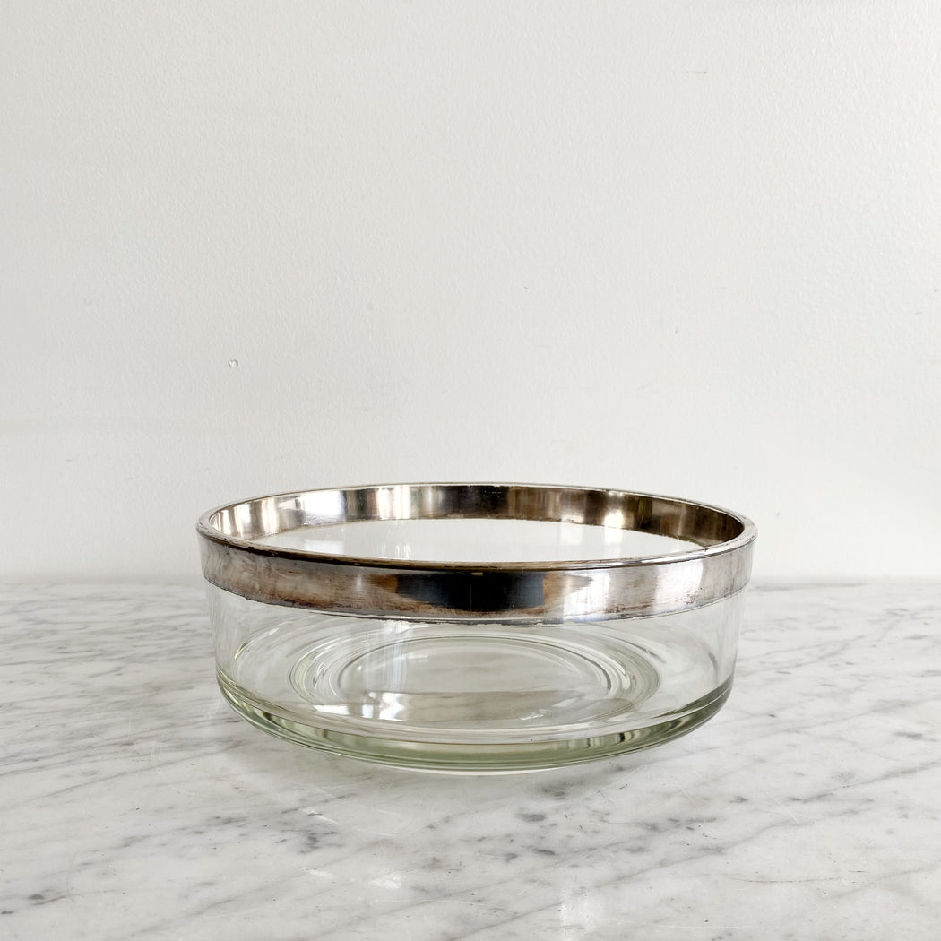 Beautiful vintage mid-century glass serving bowl with modern silhouette and silver rim. It is very much in the "Dorothy Thorpe" design style and is sure to make any gathering feel more elegant and charming!