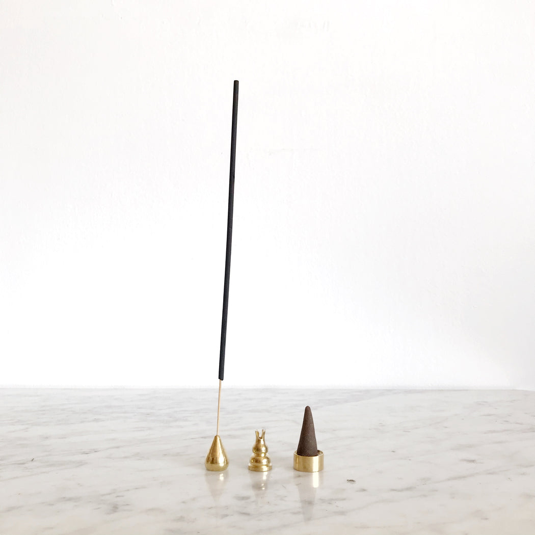 Nicely minimal polished brass incense holder, available in three shapes. All of them have a good weight to them for stability. Place it in a favorite dish for easy cleanup of ashes.