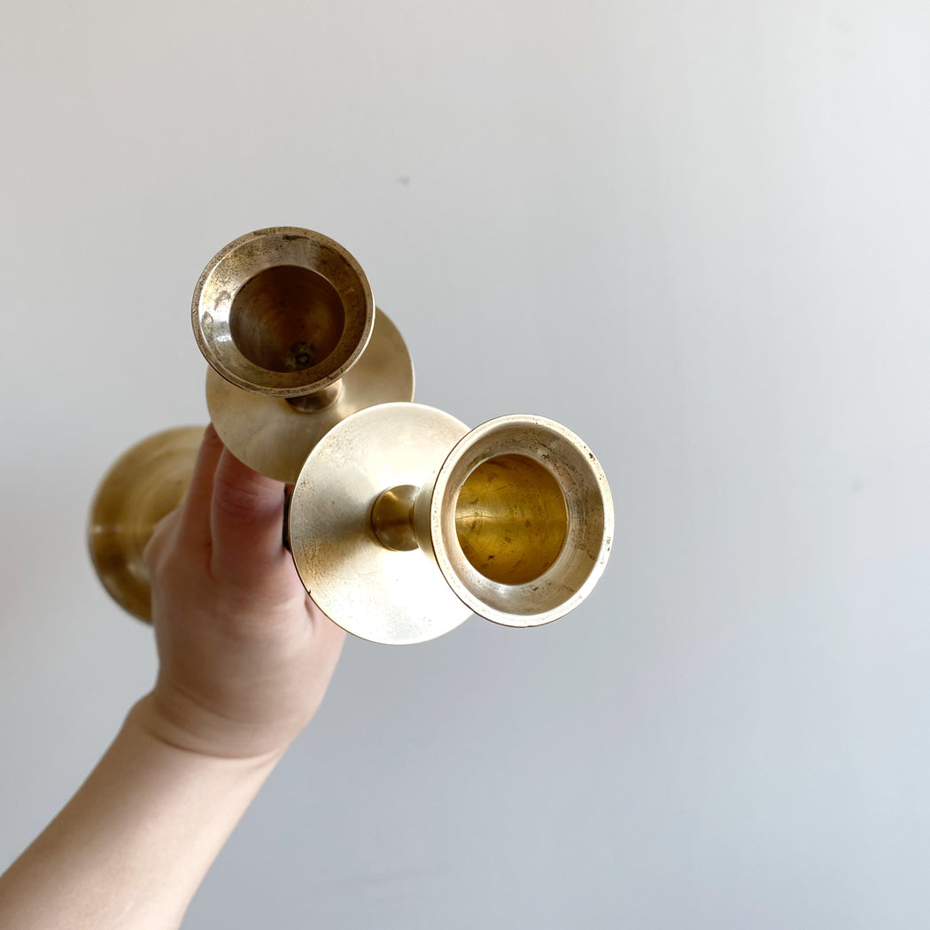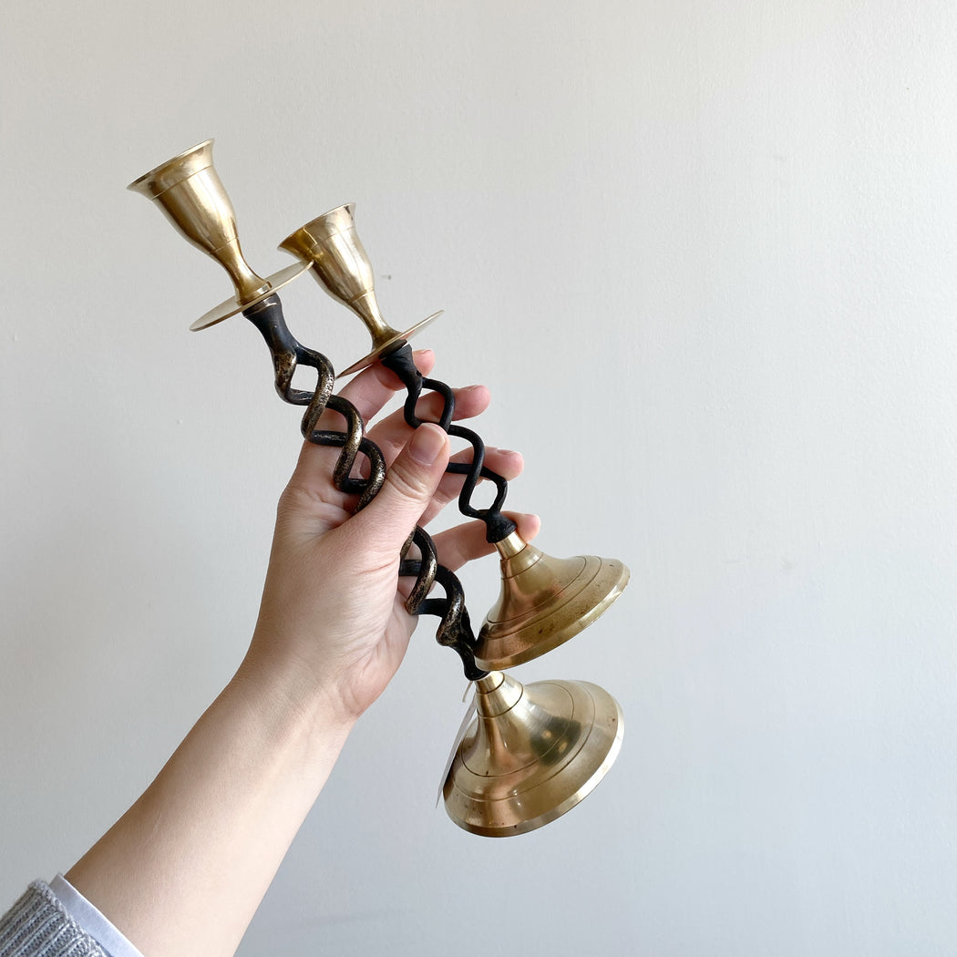 Beautiful pair of heavy vintage candle holders. We love the varied height, and the contrast between the black spiral stems and polished brass tops and bases.