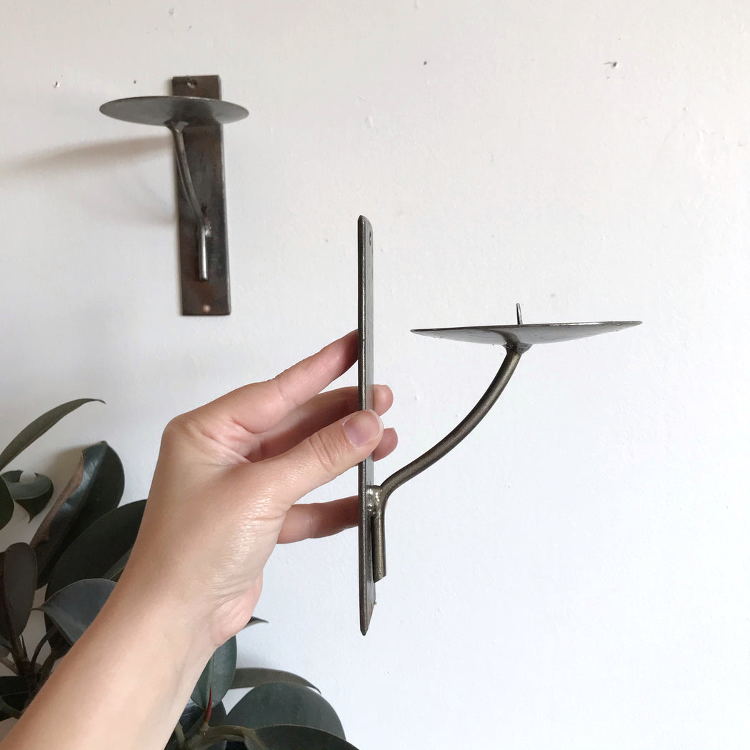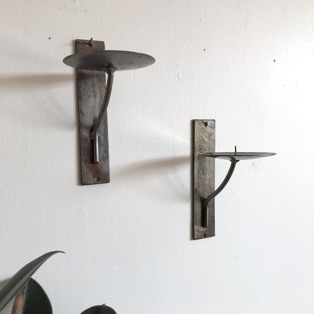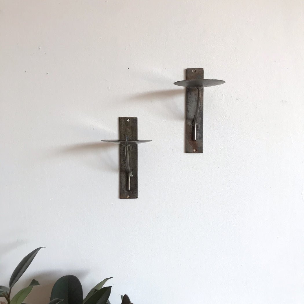 Pair of minimal, yet industrial, vintage metal pillar candle sconces. Made in Mexico.