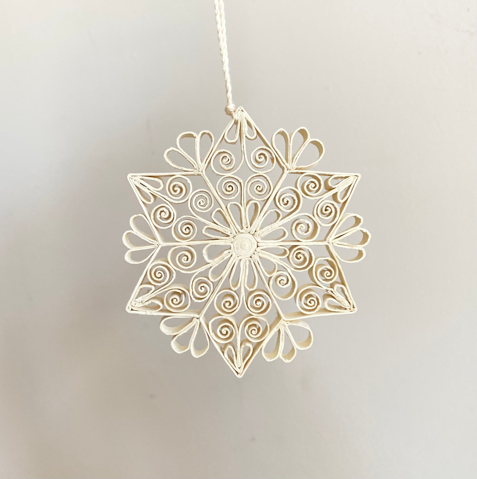 Add a beautifully rendered, delicate touch to your tree this year! This gorgeous quilled - rolled and curved shapes - snowflake is made with sturdy jute paper and includes a twisted cotton cord hanger. A lovely bohemian design!