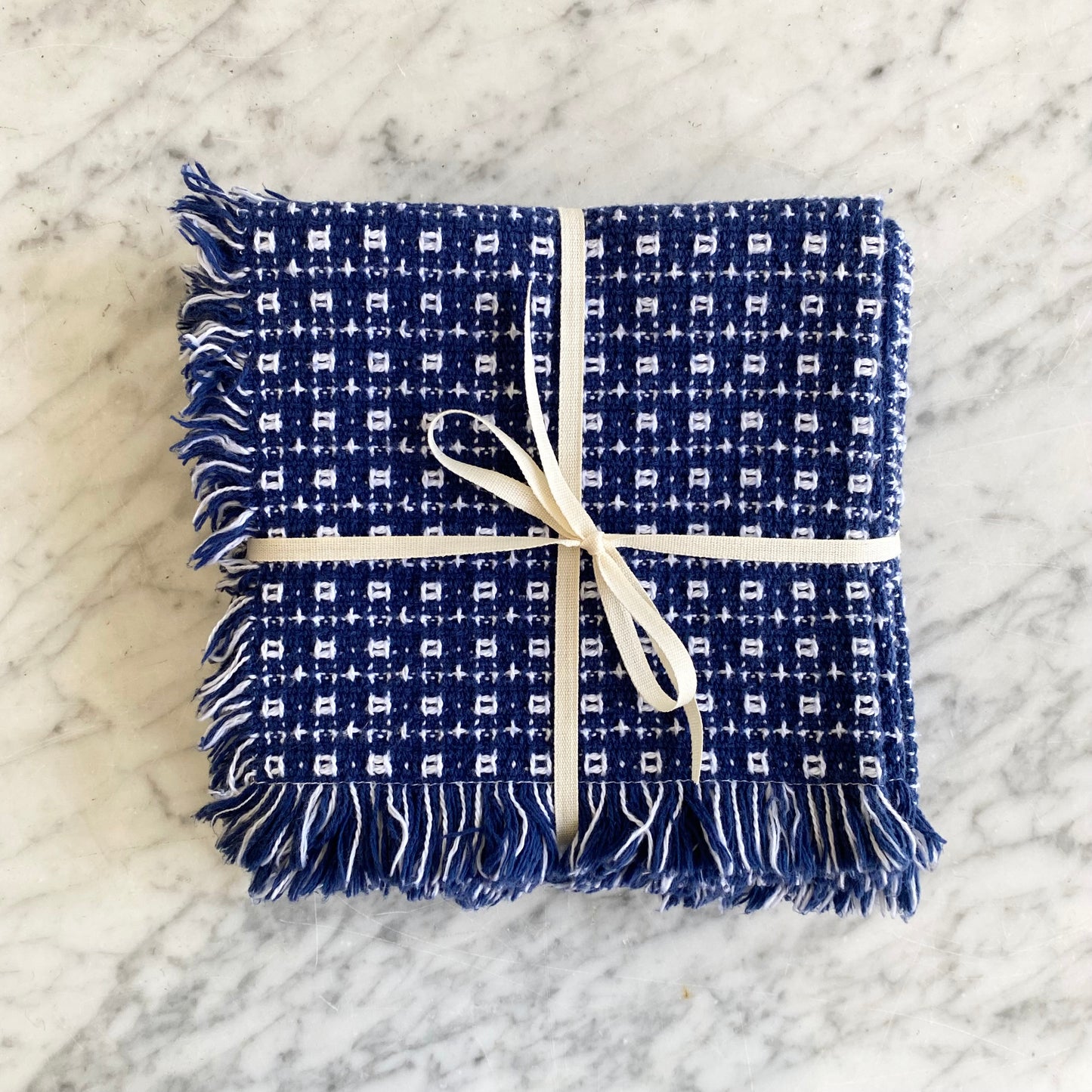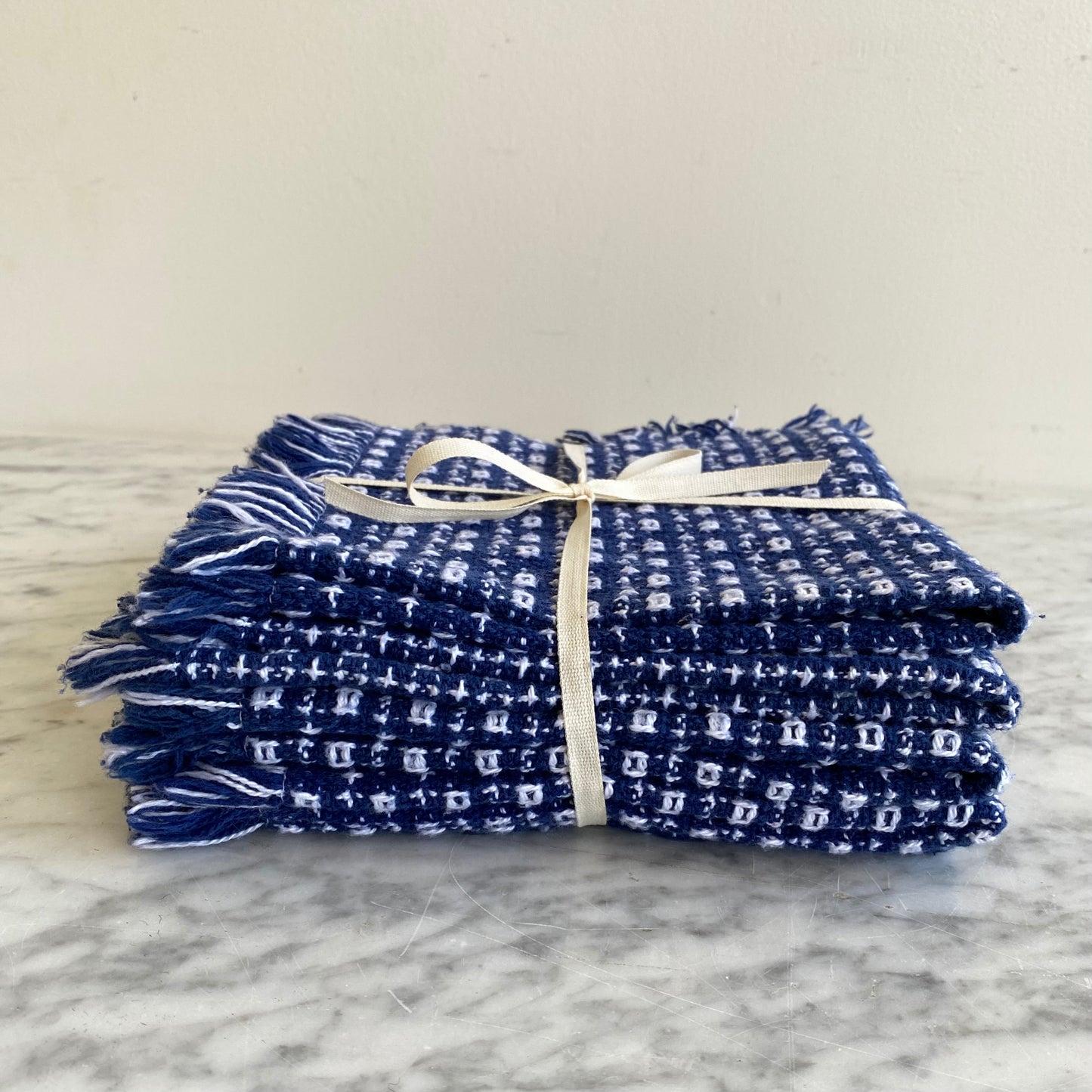 Set of 5 beautiful (4 with a bonus!) hand-woven cloth napkins. They feature a neat geometric pattern and classic combination of blue with white. They’re soft and timeless, and could also be used as small placemats, or throughout the home on end tables or coffee tables…