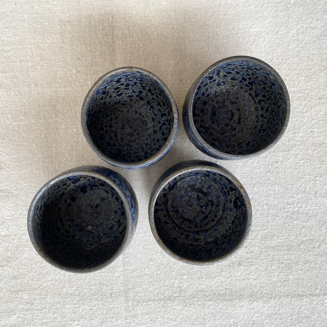 This is an amazing set of four, handcrafted pottery cups with gorgeous inky blue glazing. They have a unique texture, and they feel nice in hand.