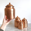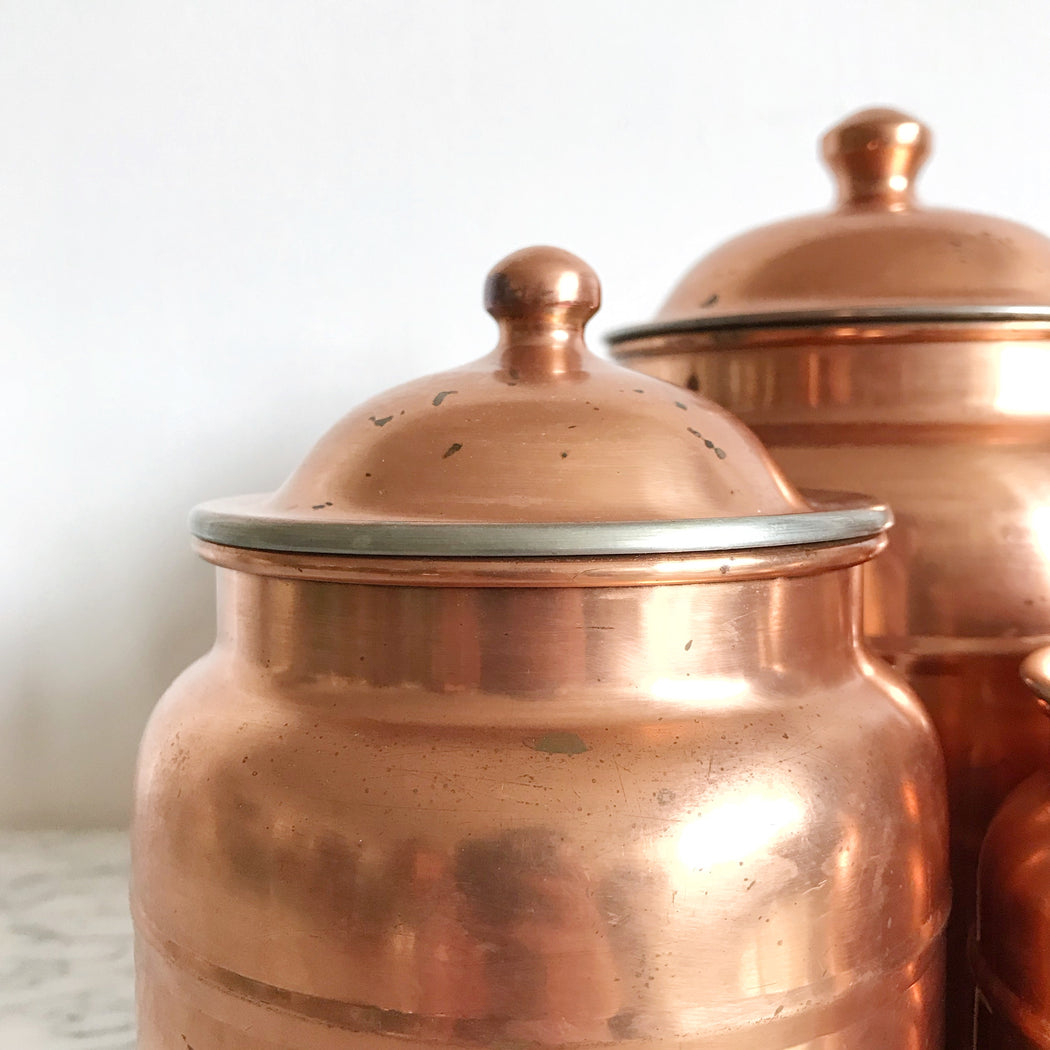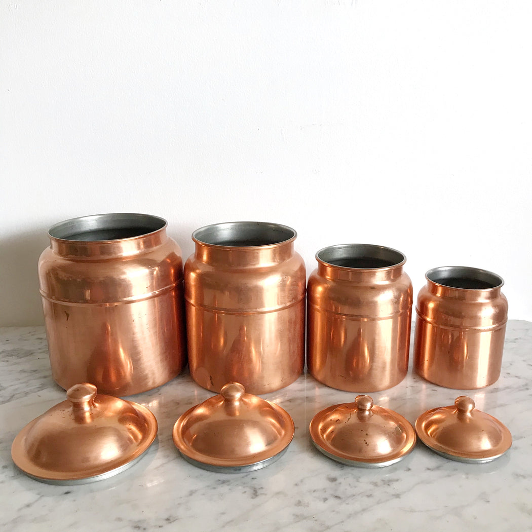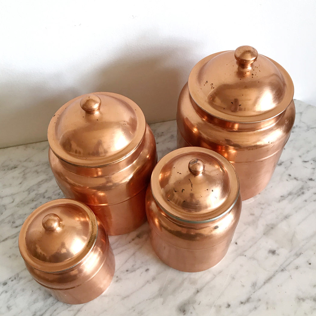 Set of four vintage copper canisters in varying sizes. Beautiful authentic wear! Made in Portugal.