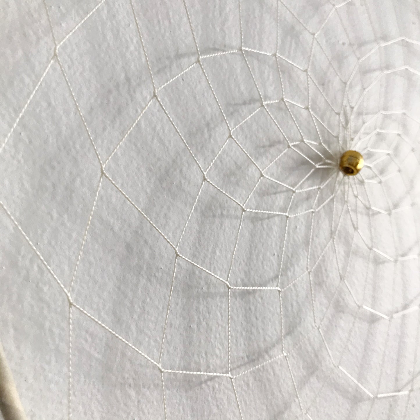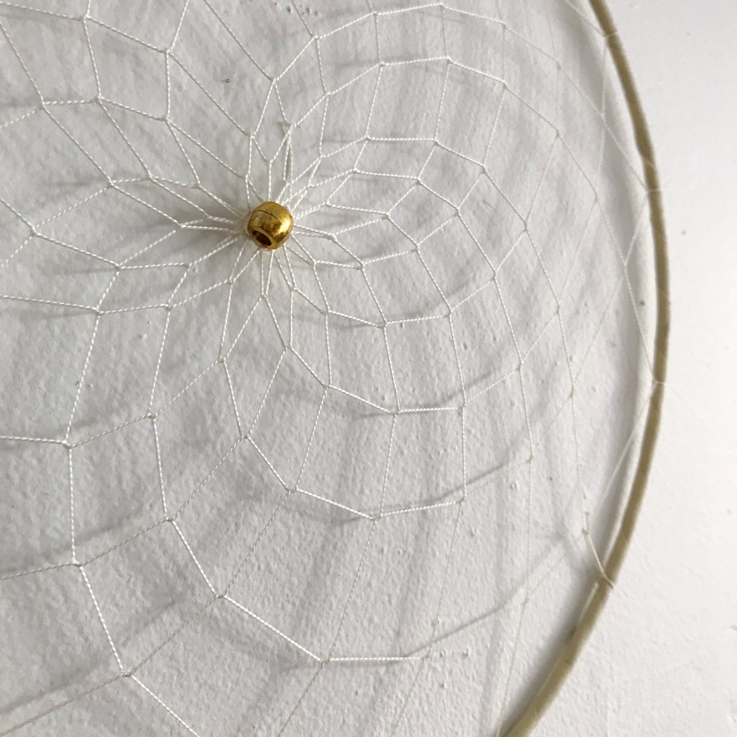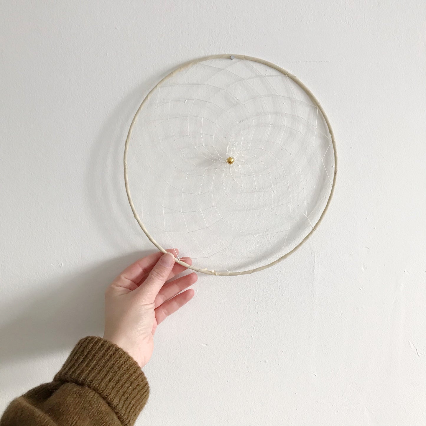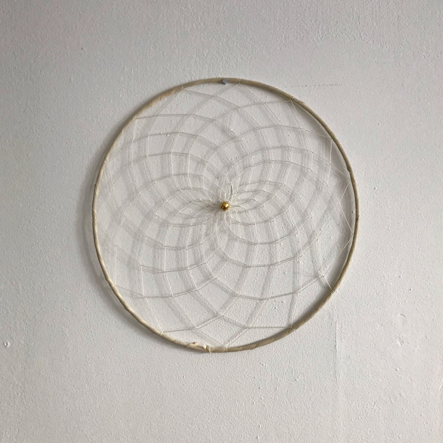 Sleep better and add some sweet texture to your wall with this simple and lovely handcrafted dream catcher! It features soft white frame, white woven thread, and a single golden bead at its center.