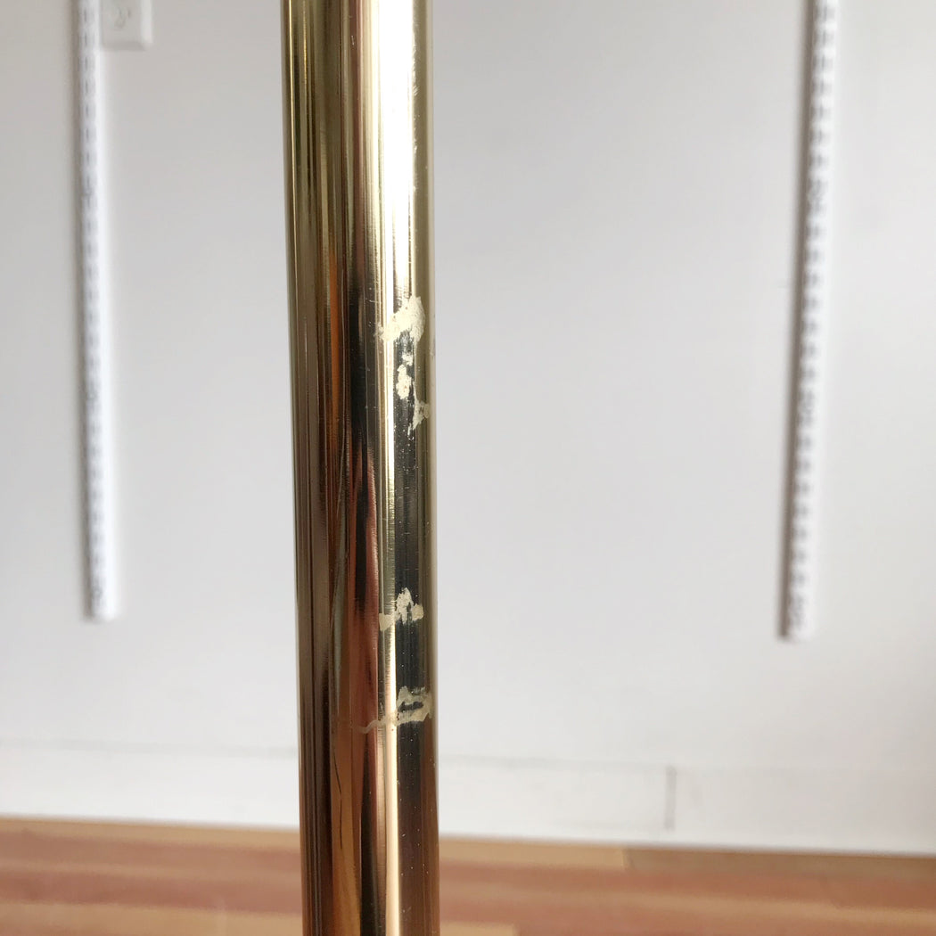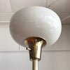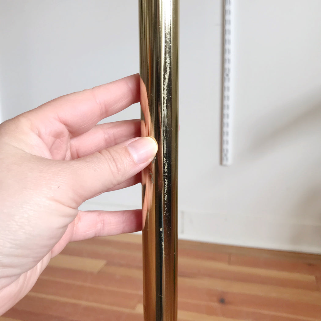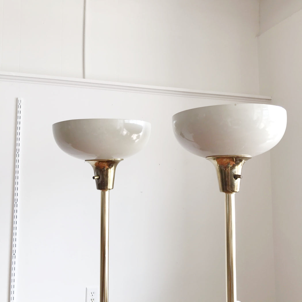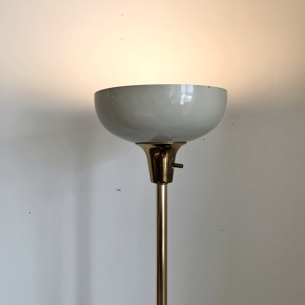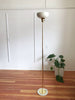 Sleek, slender, and full of post-modern charm, we adore these vintage 80's brass floor lamps! The warm brass body combined with the soft warm creamy-gray enameled metal shade and base detail is a perfect match! There are even three different brightness settings so you can set it to suit your needs!