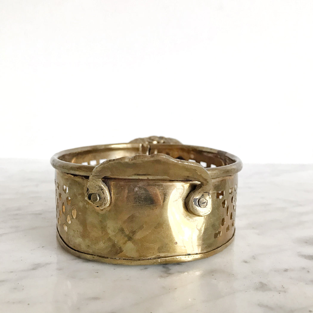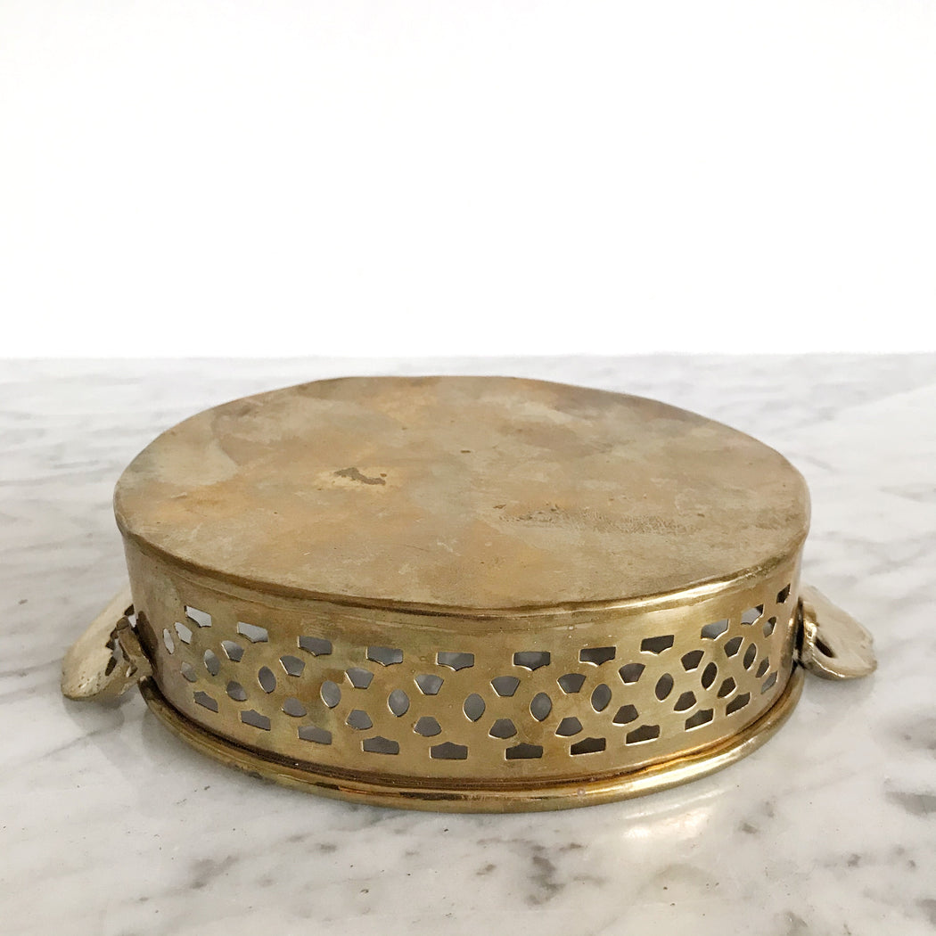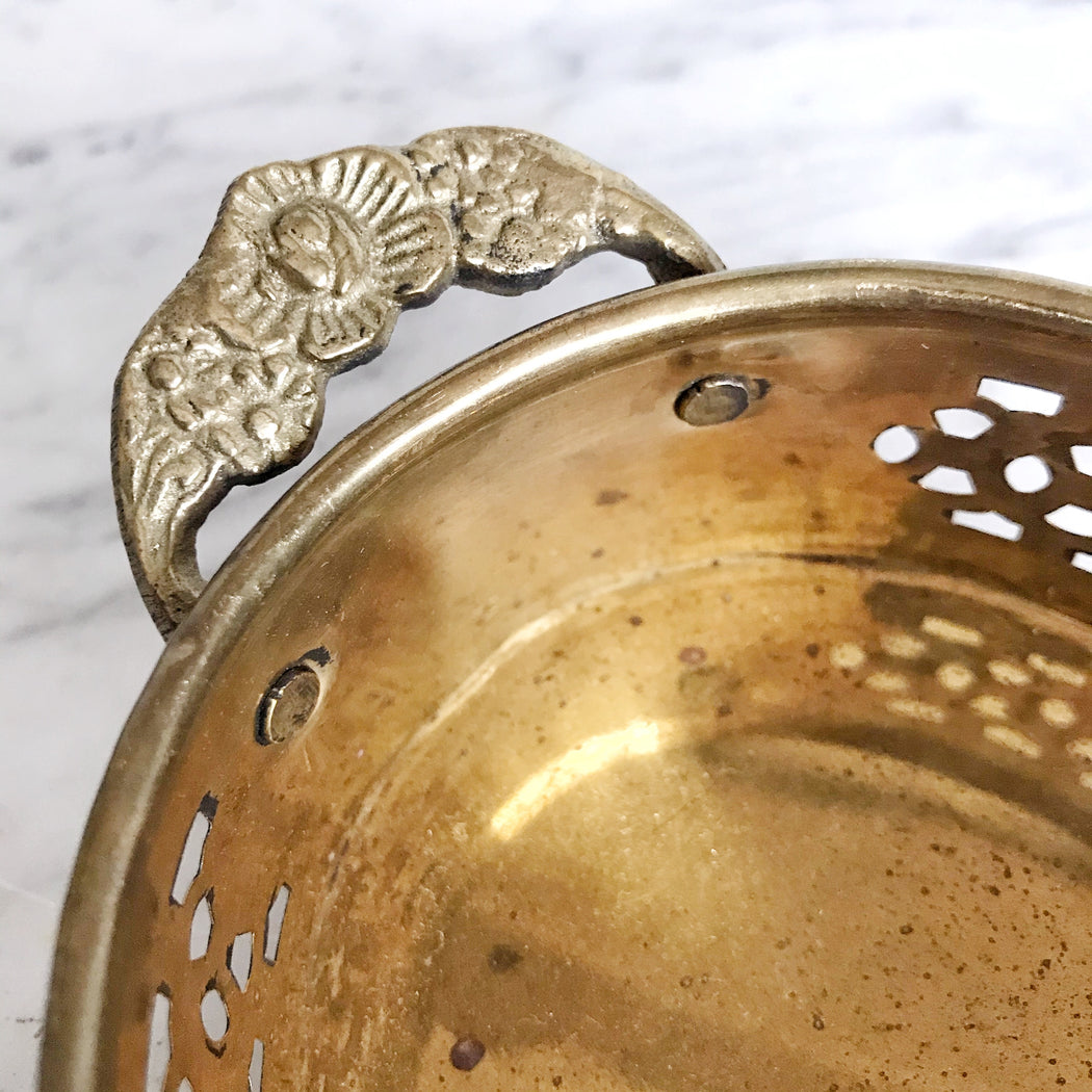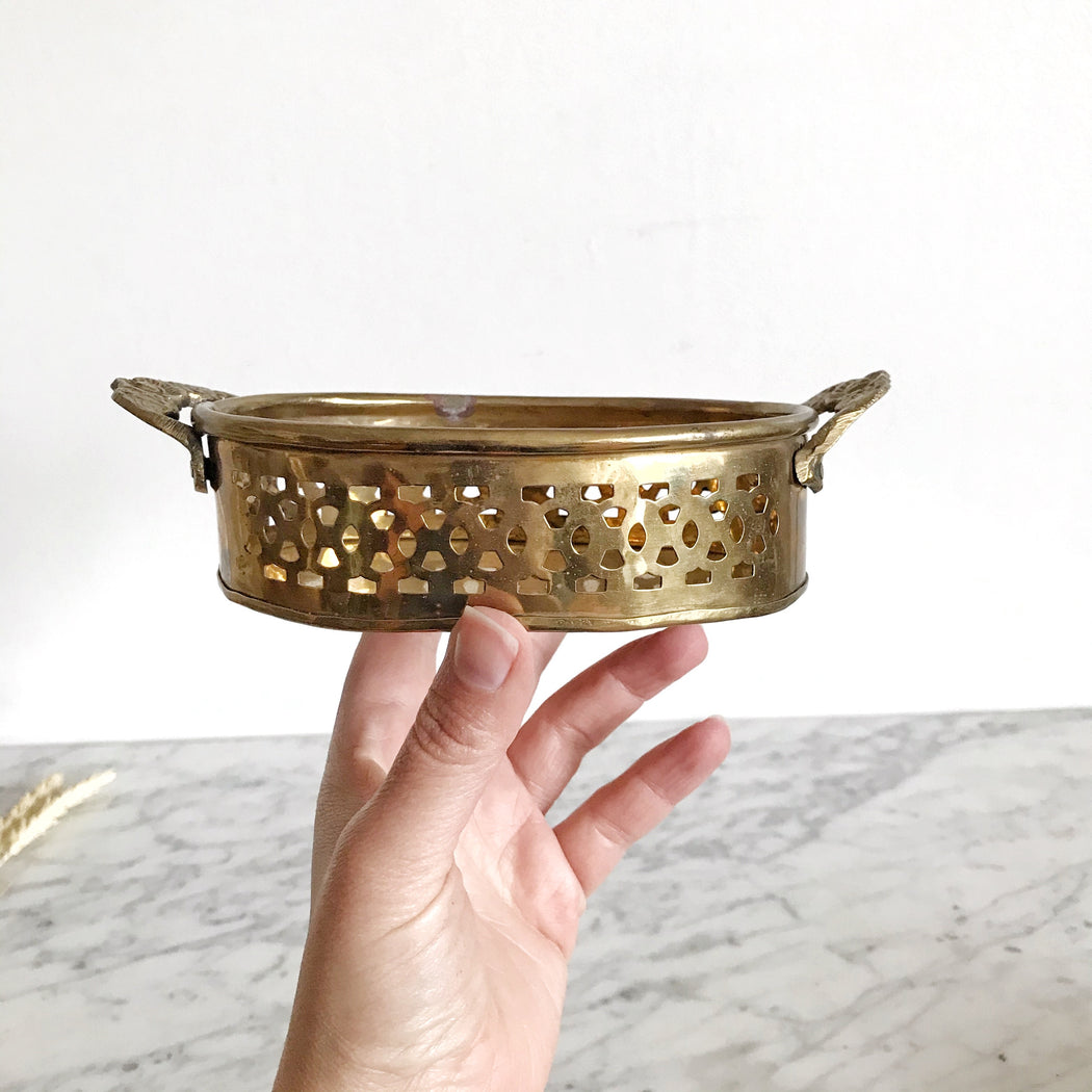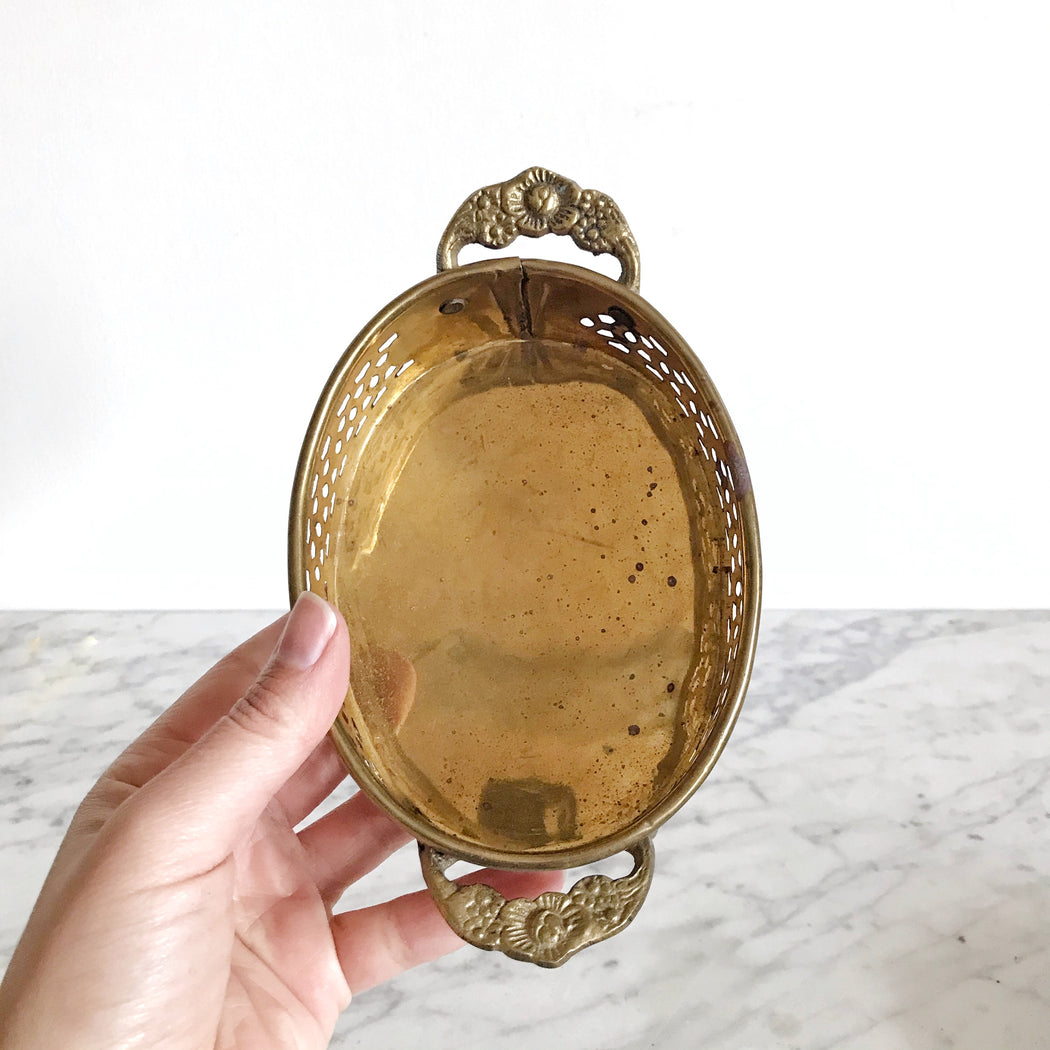 Vintage brass organizer / tray with cutout edging and floral handles. It would be great for holding incense, airplants, or using on a desk, table, or dresser to organize items.