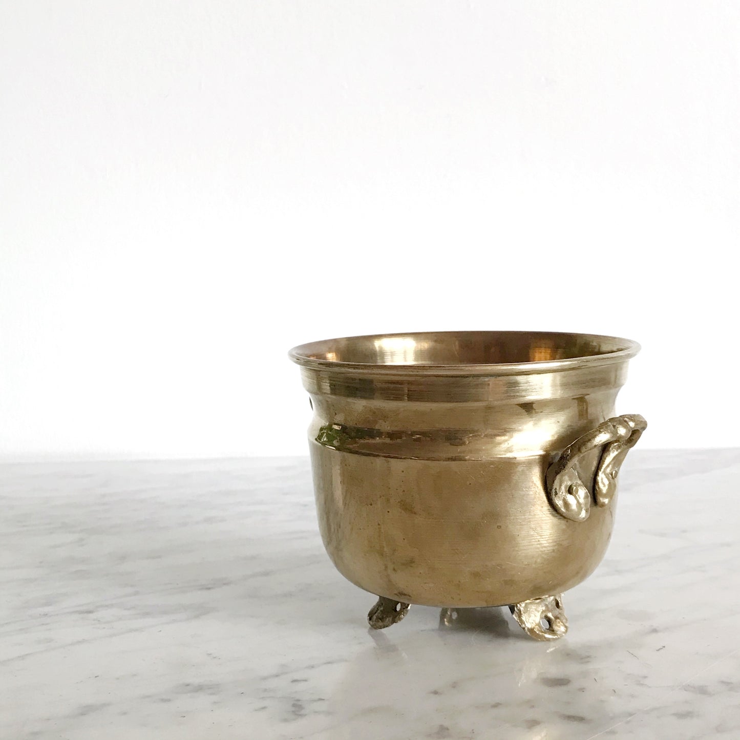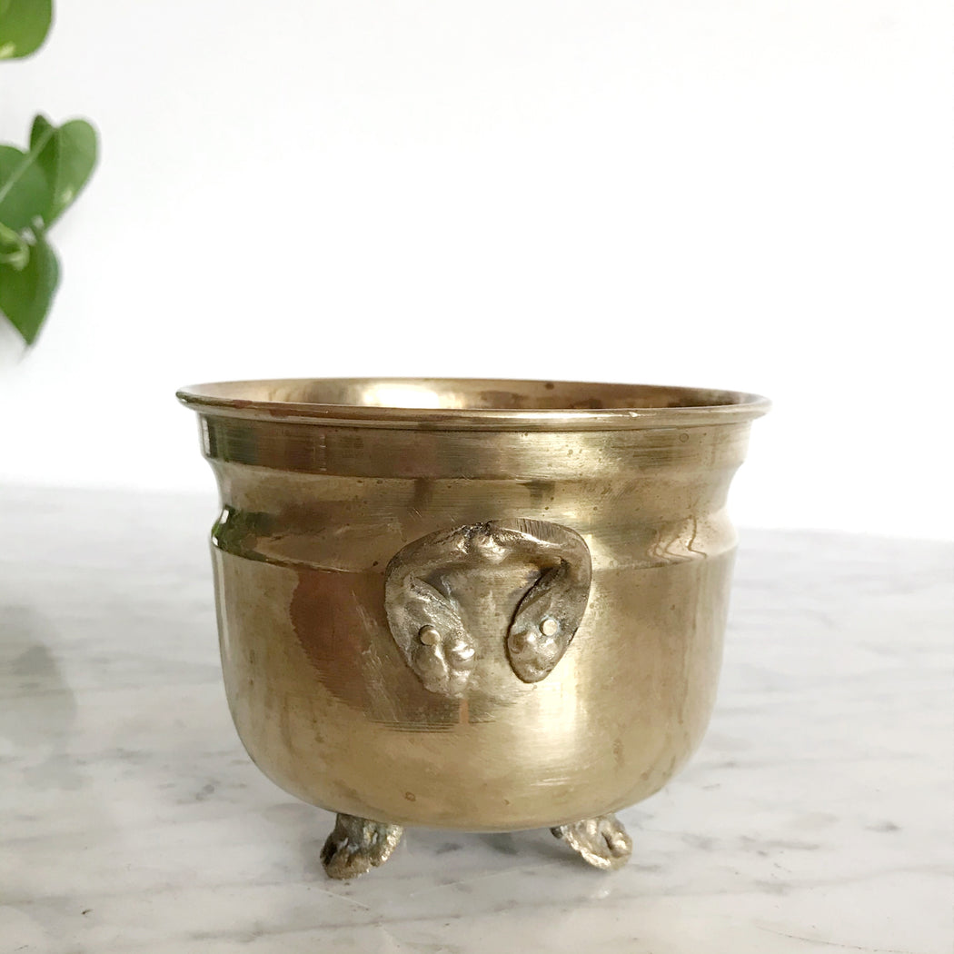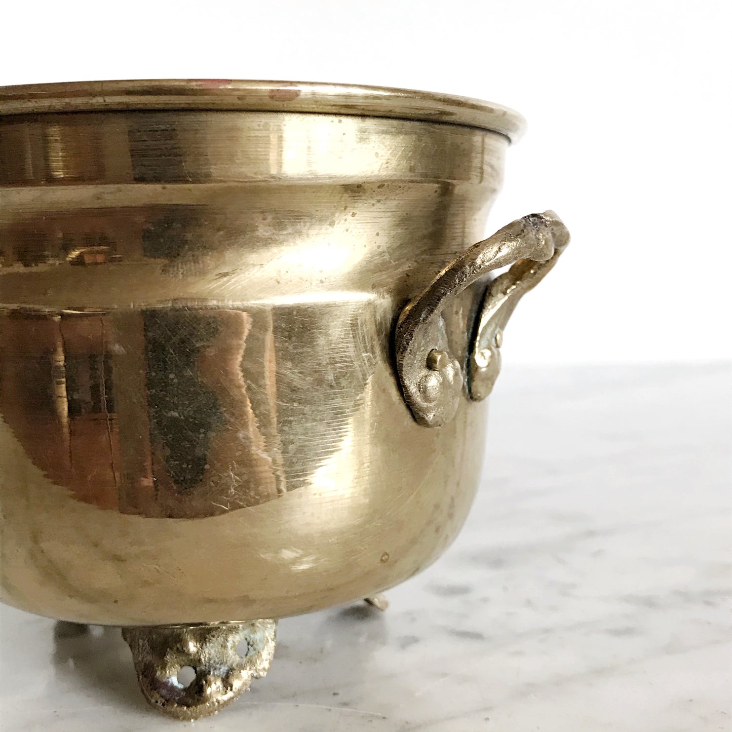 Cutie vintage footed brass planter with three floral feet and two decorative handles.