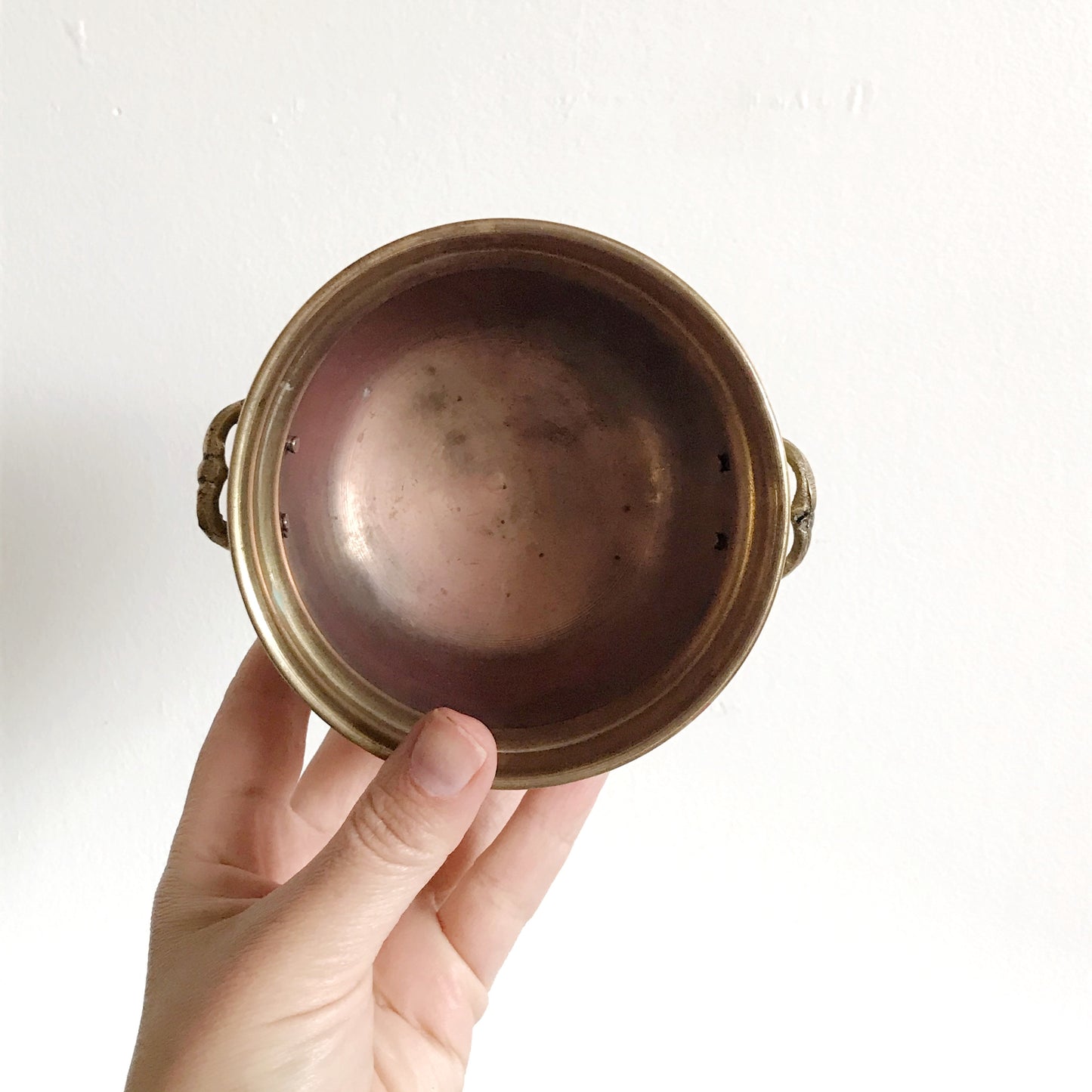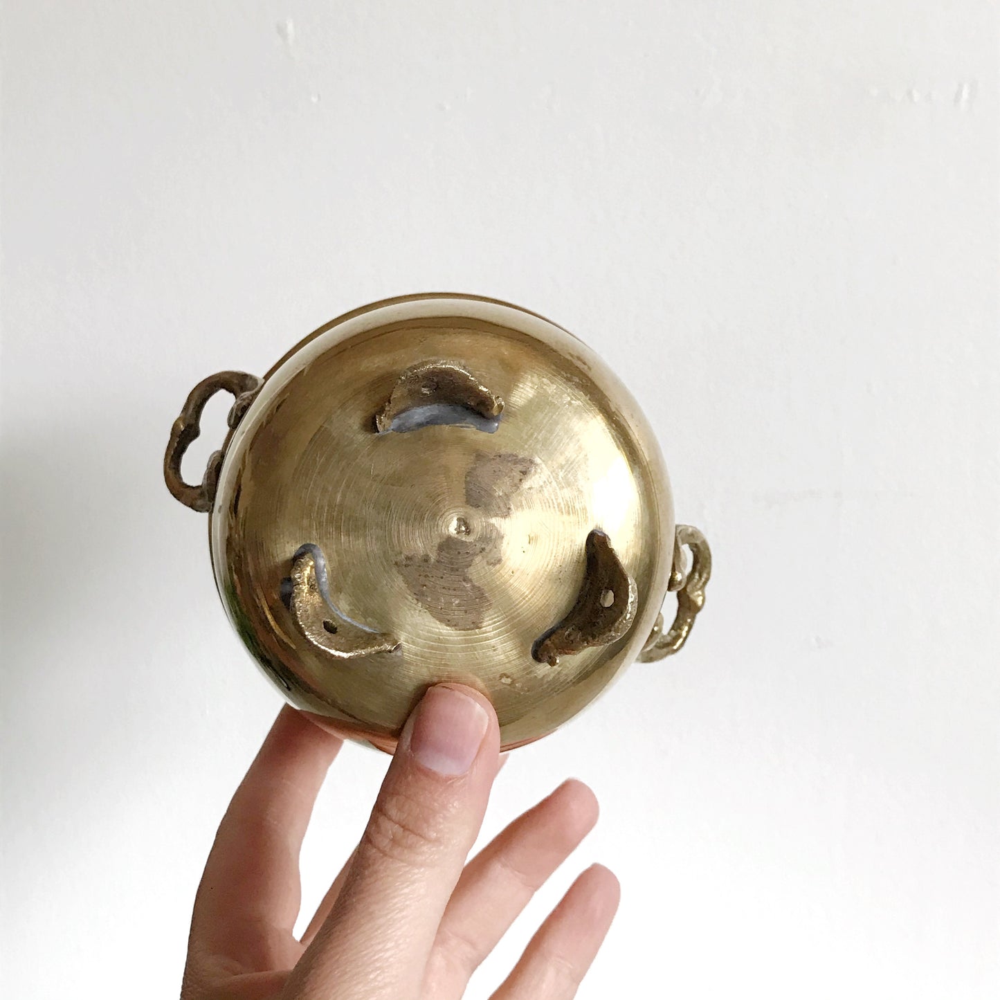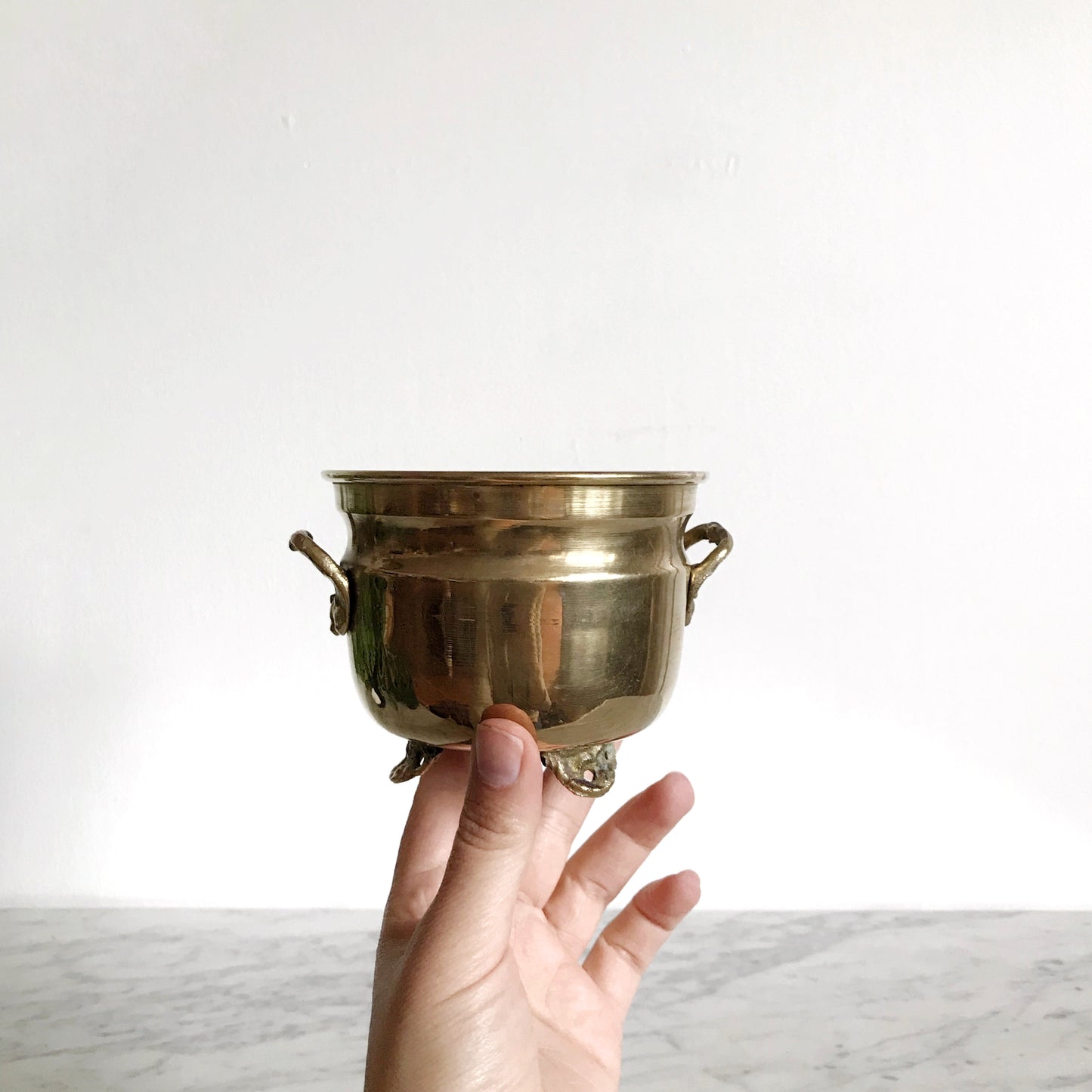 Cutie vintage footed brass planter with three floral feet and two decorative handles.