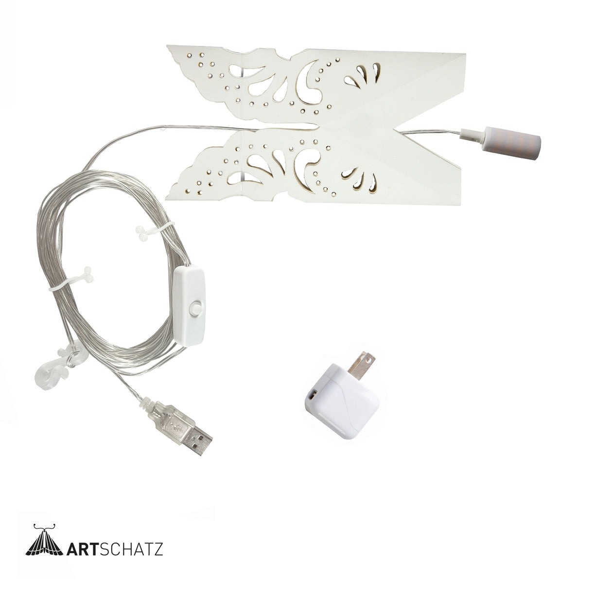 Each has been checked for quality and comes pre-wired with a clear 12-ft cable with on/off switch, hanging hook, an energy saving LED bulb and a 5V AC adapter.