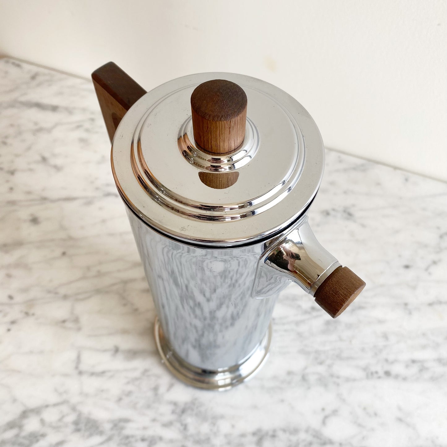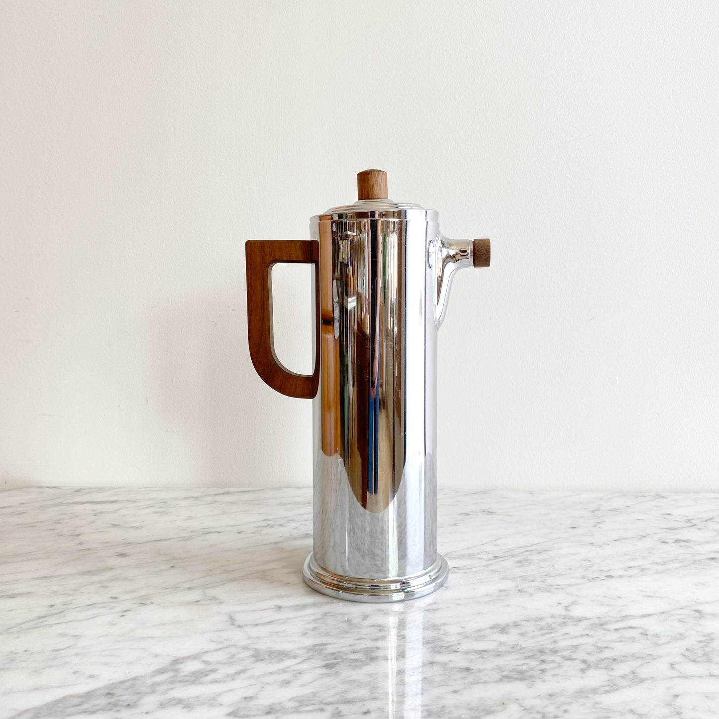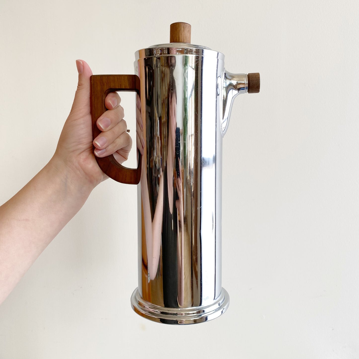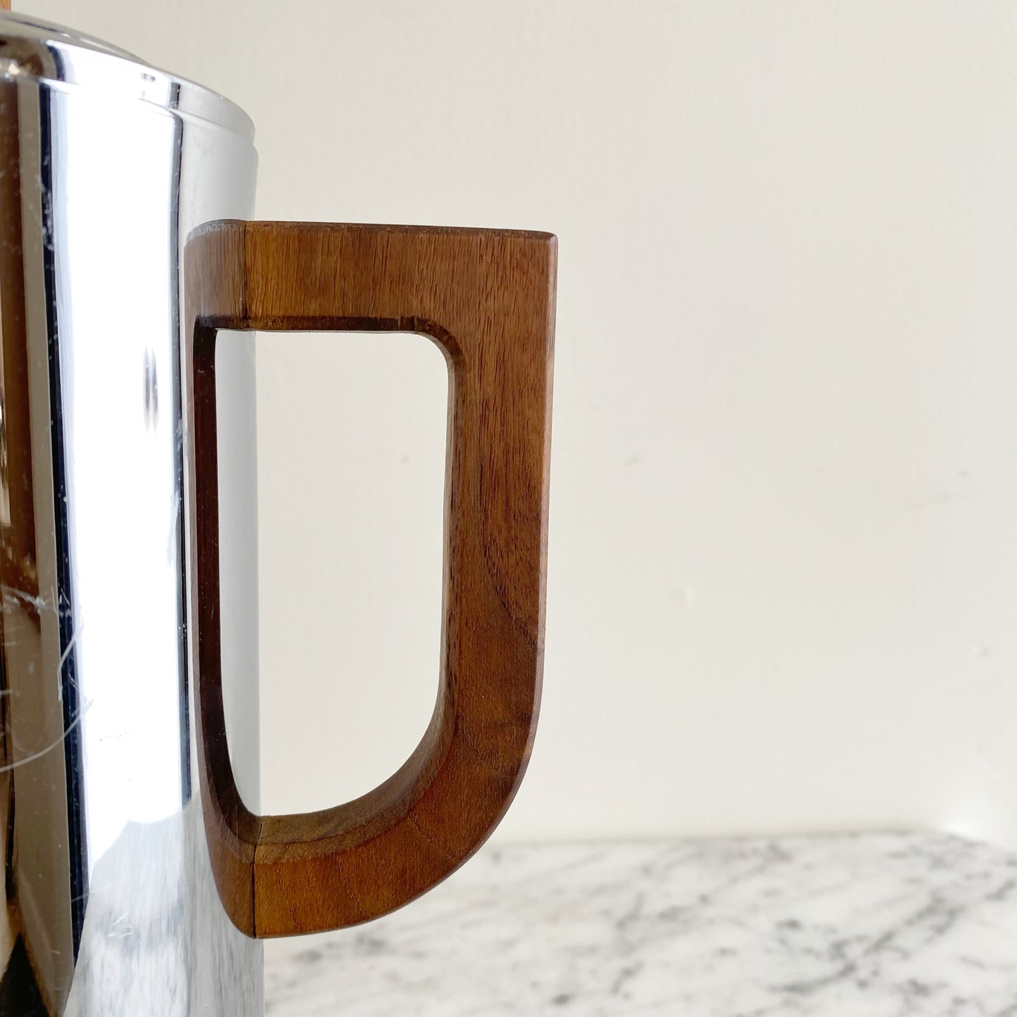 Fantastic vintage polished stainless steel pitcher featuring wooden handles and sleek art deco style.
